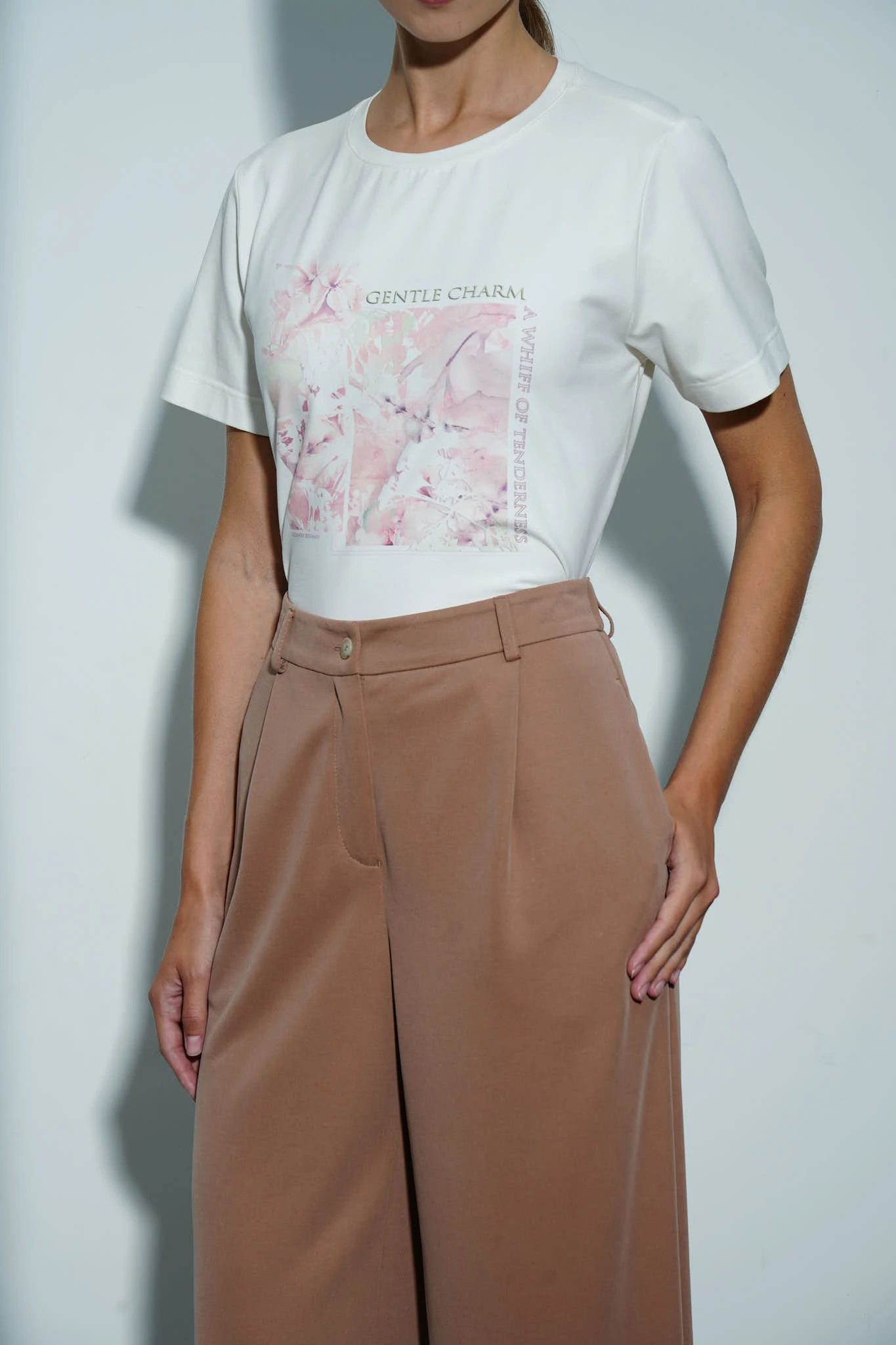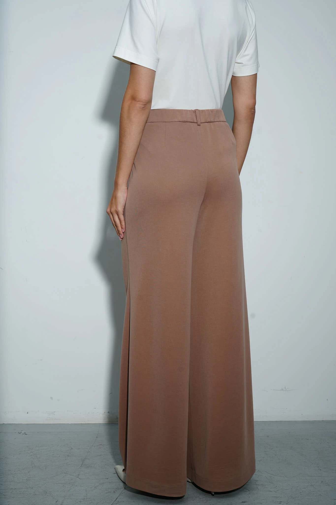 Широкие брюки из эластичной бархатистой ткани на основе тактильно приятного модала в кофейном оттенке – это идеальное сочетание комфорта и элегантности. Благодаря плавному силуэту и мягкой фактуре ткань красиво драпируется, создавая утончённый образ. Универсальная модель станет базовым элементом гардероба, легко сочетаясь как с повседневными топами, так и с нарядными блузками. Застёжка на молнию и роговую пуговицу.