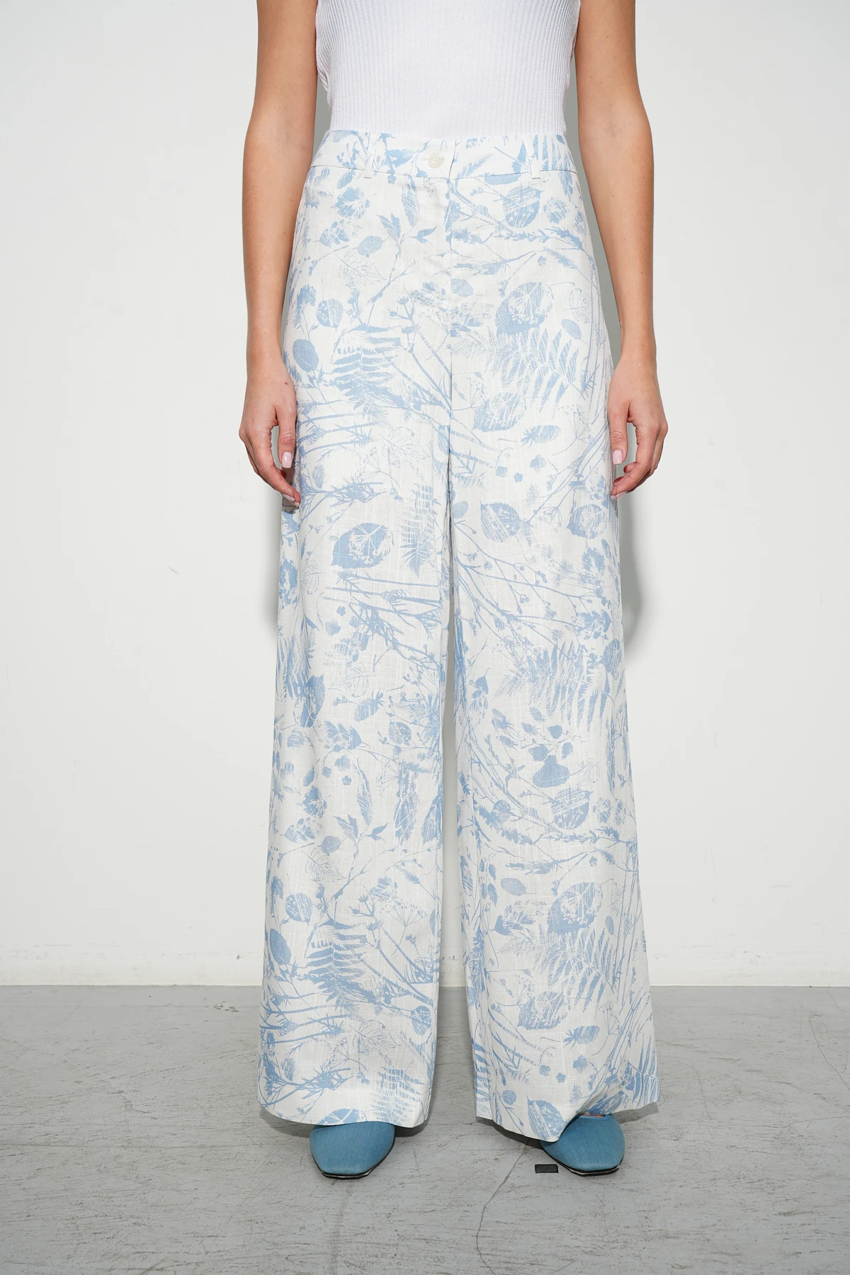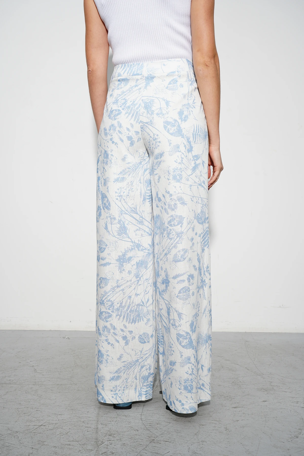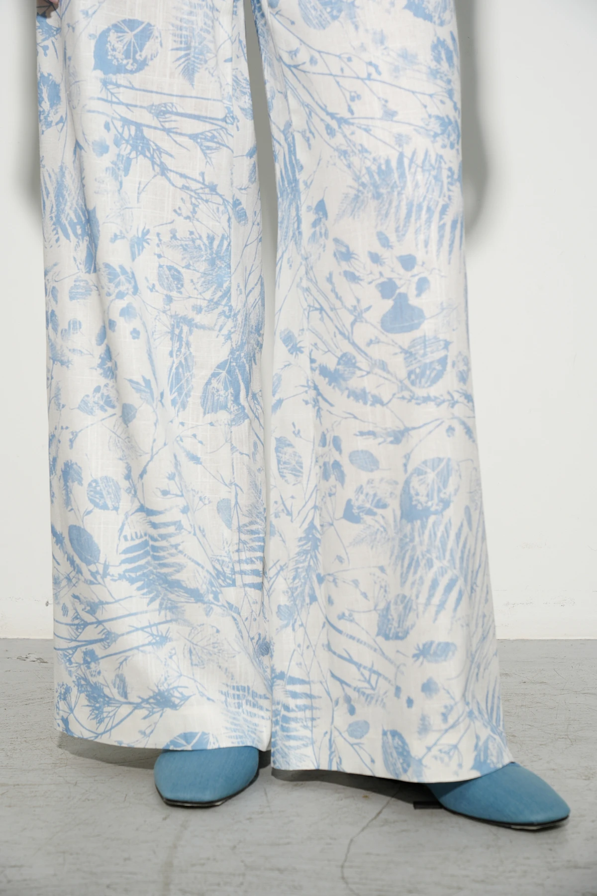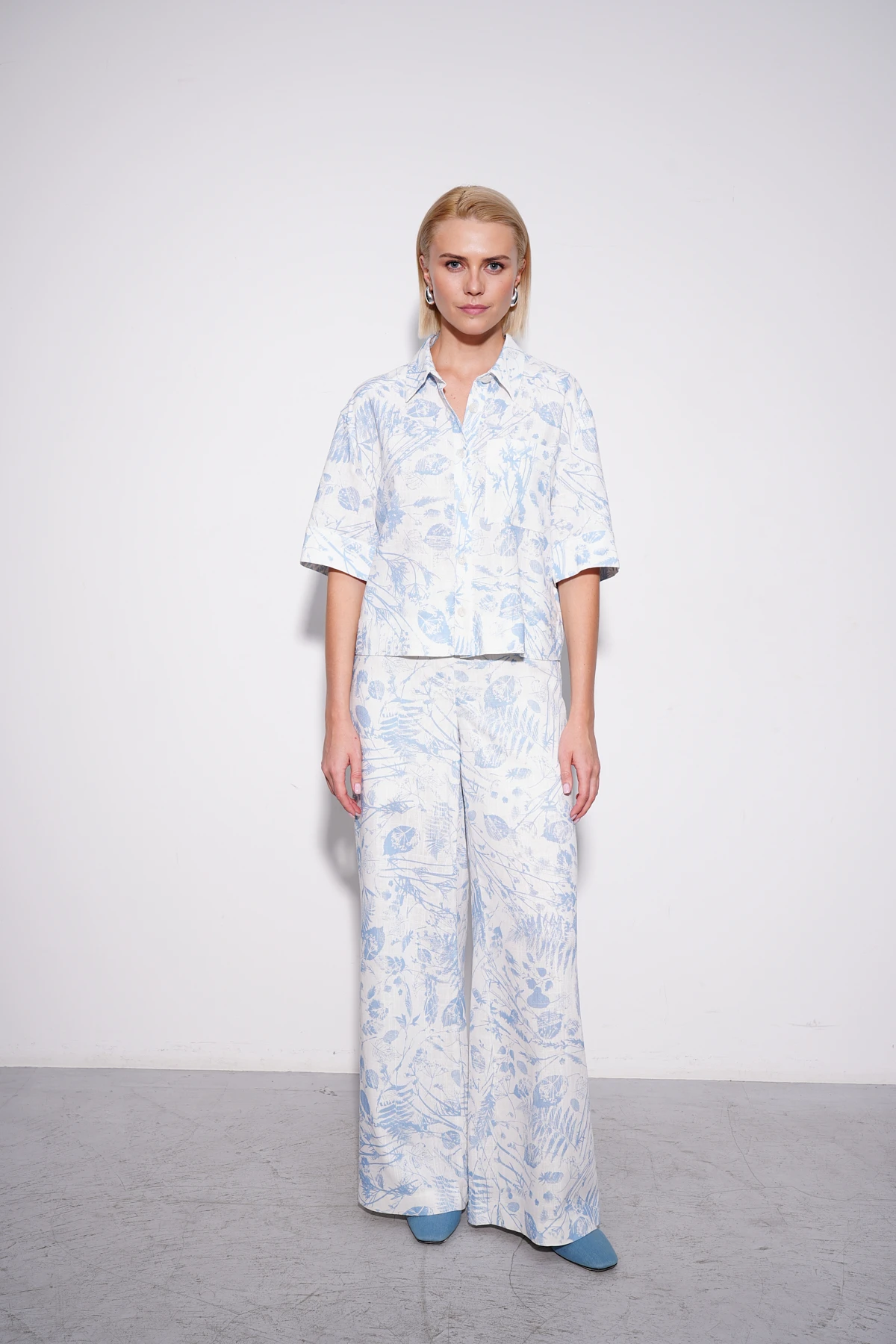 Брюки из смесовой ткани на основе гигроскопичного района с добавлением фактурного льна и авторским принтом — элегантная и стильная модель, идеально подходящая для летних дней. Широкие прямые брюки создают расслабленный силуэт, обеспечивая комфорт и свободу движений. Уникальный флоральный принт добавляет образу изысканности, делая его выразительным и запоминающимся. На притачном поясе предусмотрены шлёвки для ношения ремня, что позволяет легко комбинировать с разными аксессуарами.