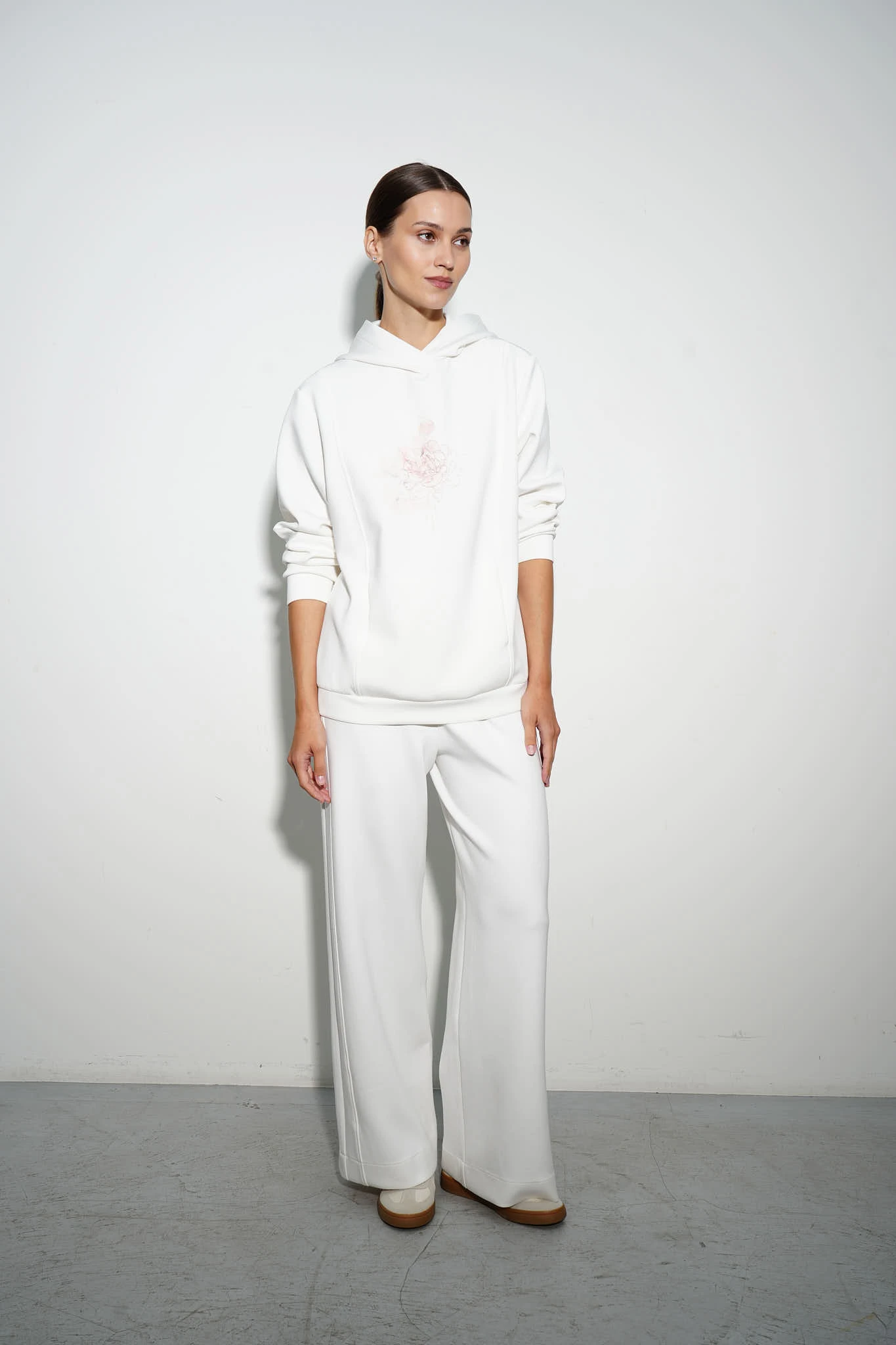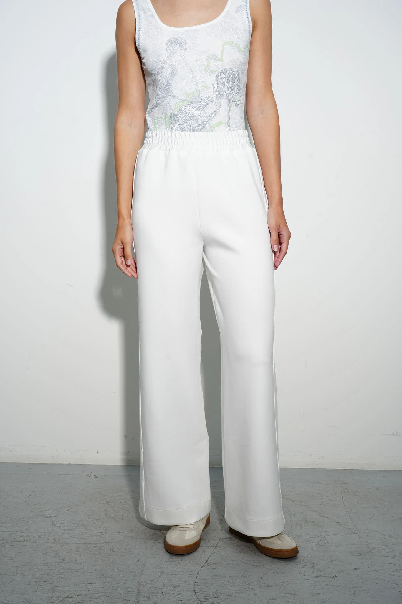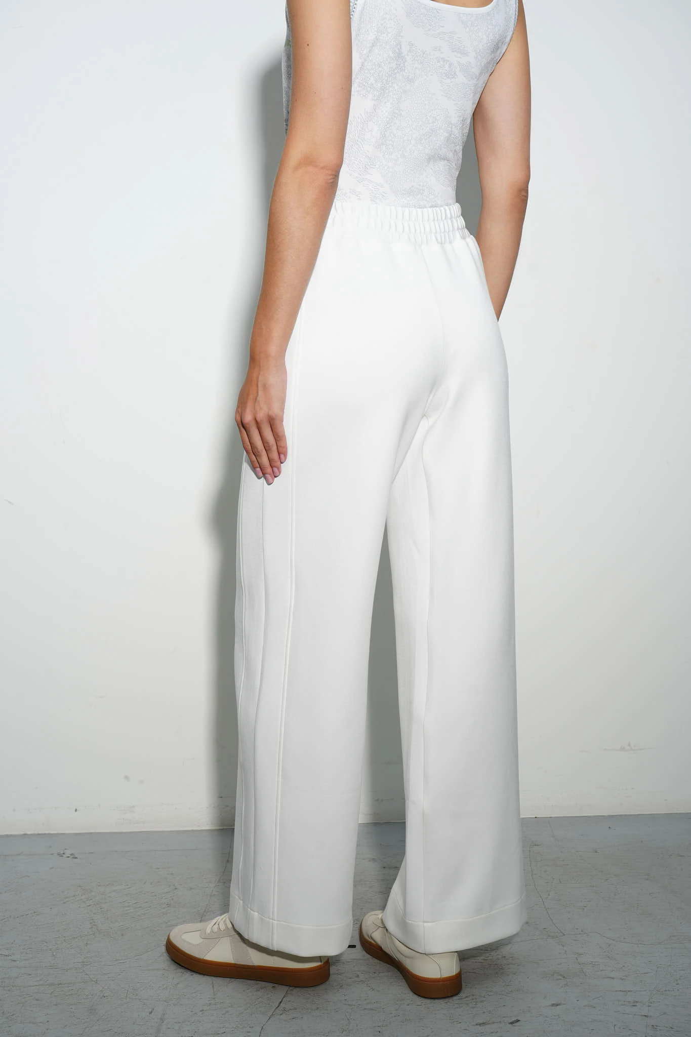 Монохромные брюки из плотного трикотажного полотна в молочном оттенке идеальны для повседневных и расслабленных образов. Модель свободного кроя с эластичным поясом идеально садится по фигуре. Лампасы из основной ткани подчеркивают стройность ног.
