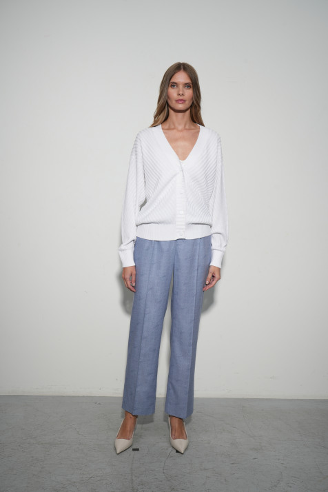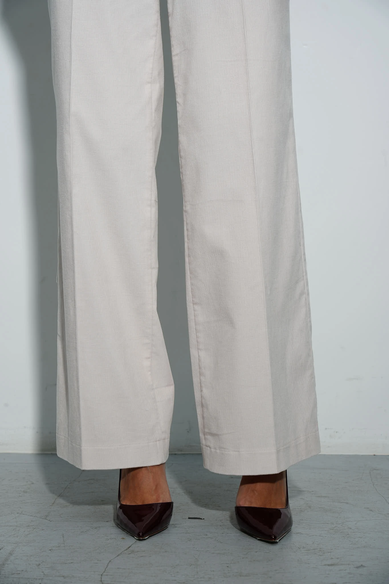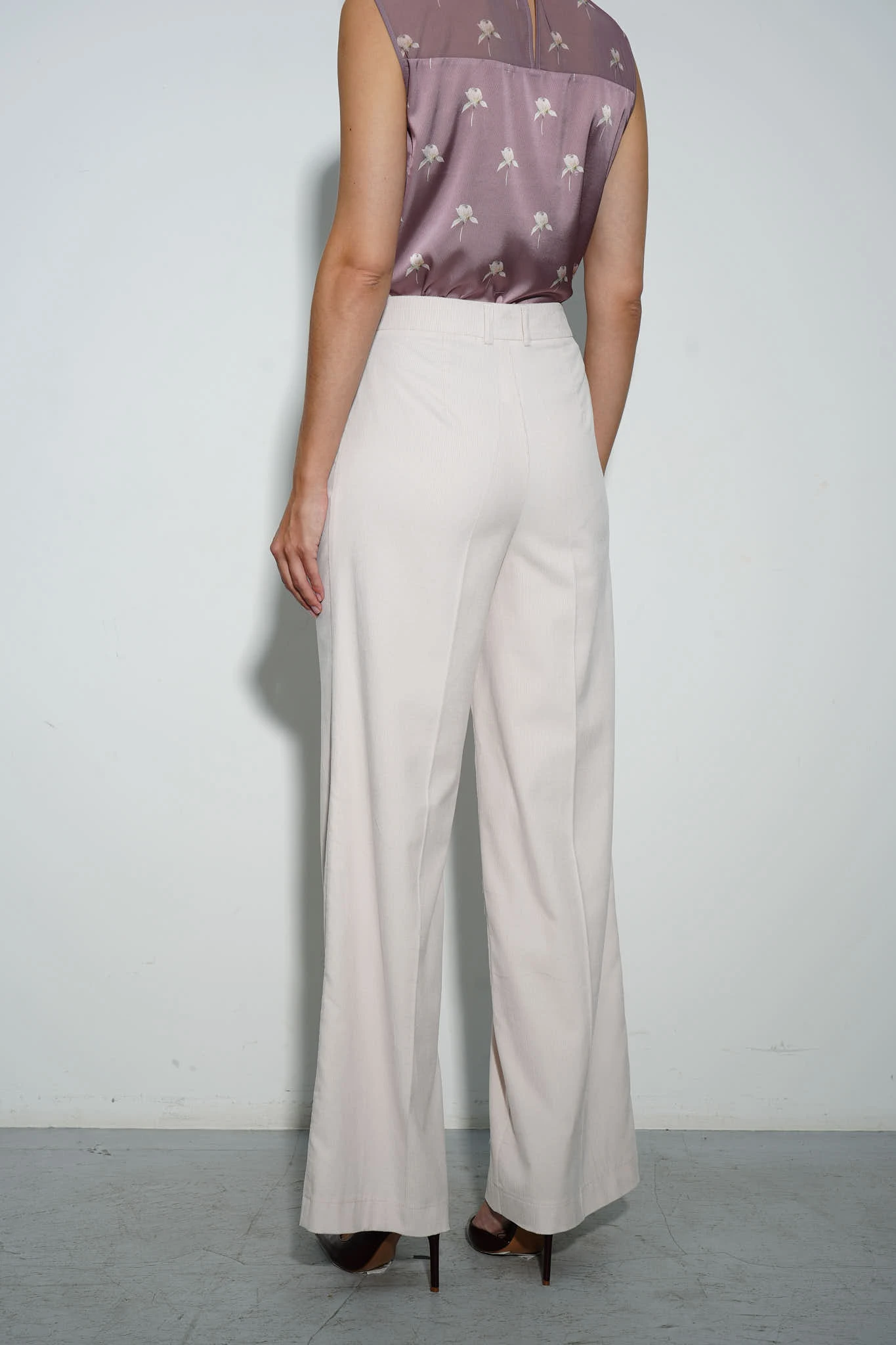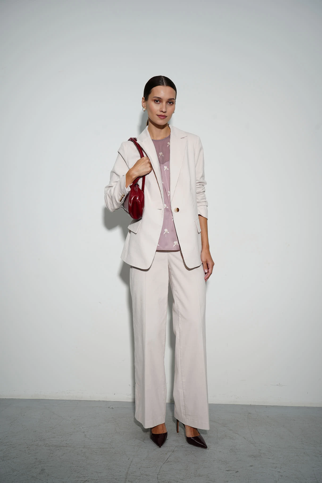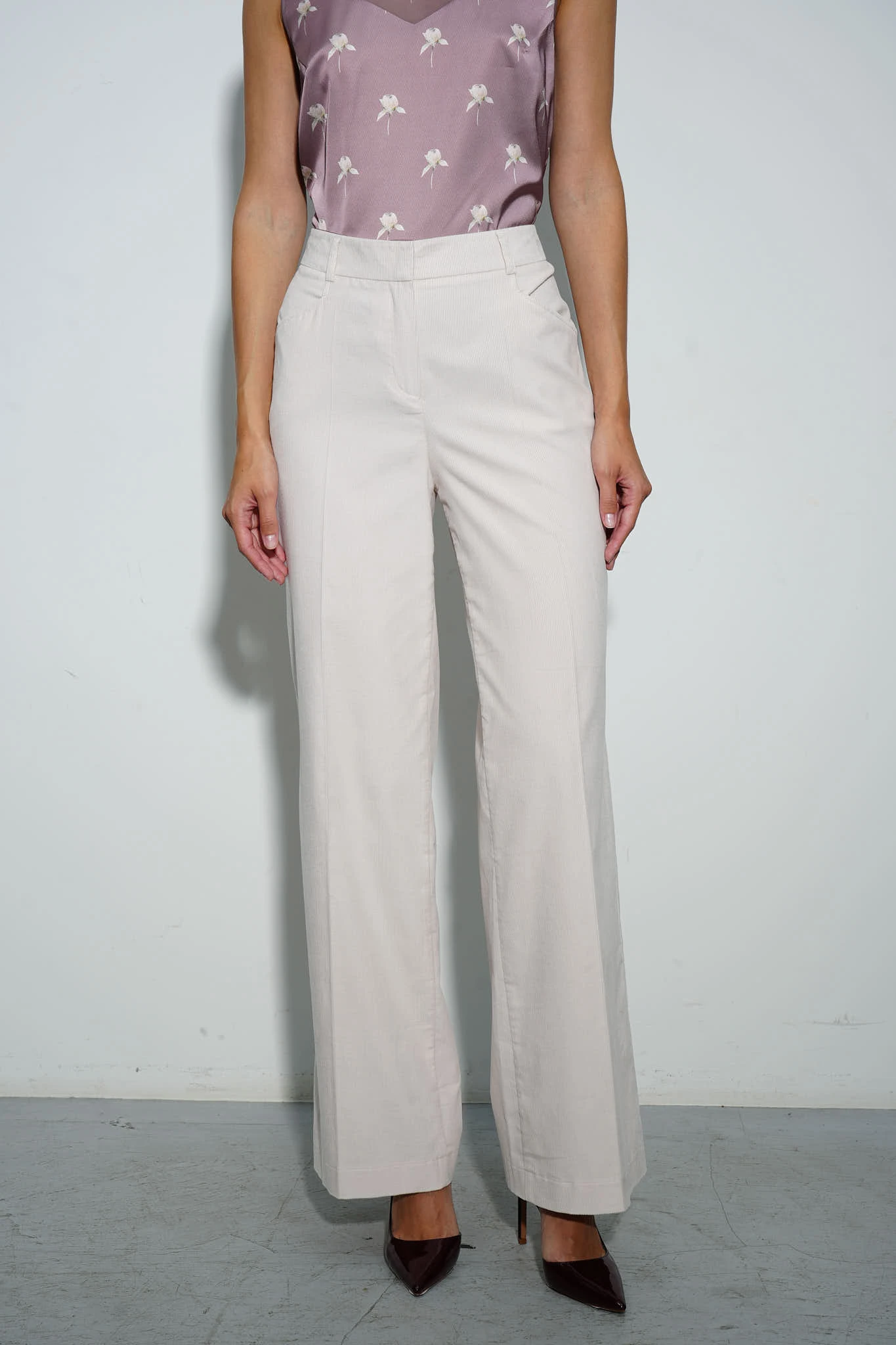 Монохромные вельветовые брюки из натурального хлопка в кремовом оттенке – классика в современном исполнении. Широкий прямой крой обеспечивает свободу движений и подчёркивает элегантность образа. По передним половинкам расположены стрелки, придающие структуру силуэту, и функциональные карманы. Задние вытачки создают идеальную посадку по фигуре. Пояс дополнен шлёвками для ремня. Застёжка - на молнию, крючок и пуговицу. Брюки гармонично сочетаются с жакетами и блузами, создавая безупречный офисный или вечерний образ.