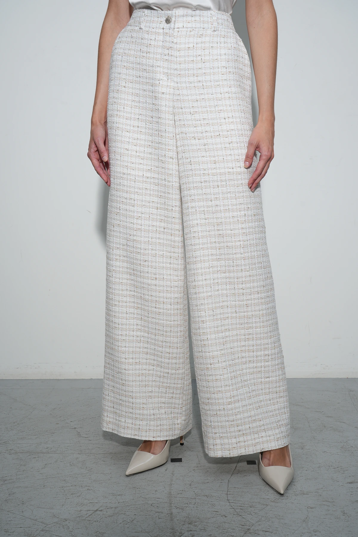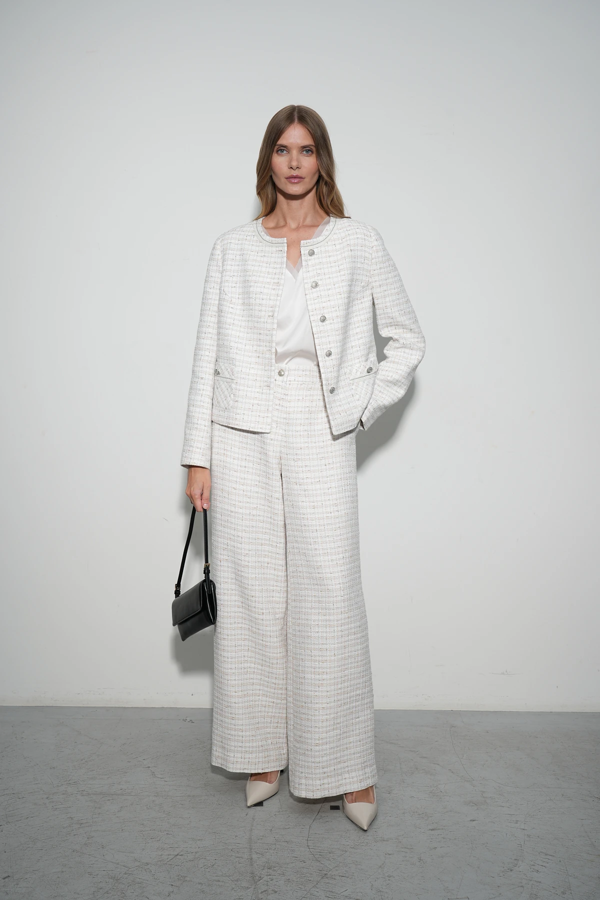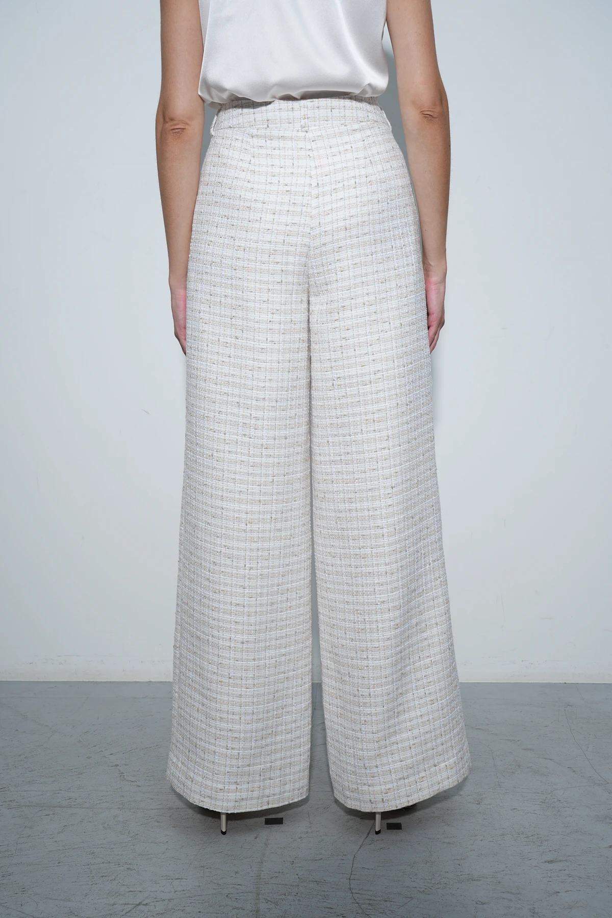 Брюки из фактурного твида с добавлением хлопка – изящное сочетание комфорта и стиля. Переплетение нитей молочных и песочных оттенков формирует выразительный узор в виде геометричной клетки, добавляя модели элегантности. Широкий крой брюк обеспечивает свободу движений и универсальность, подходящую для повседневных и деловых образов. На передних половинках предусмотрены комфортные карманы, а задние дополнены вытачками для лучшей посадки. Застёжка на молнию и фактурную металлическую пуговицу.
