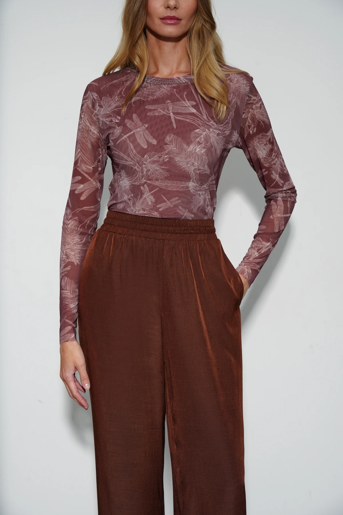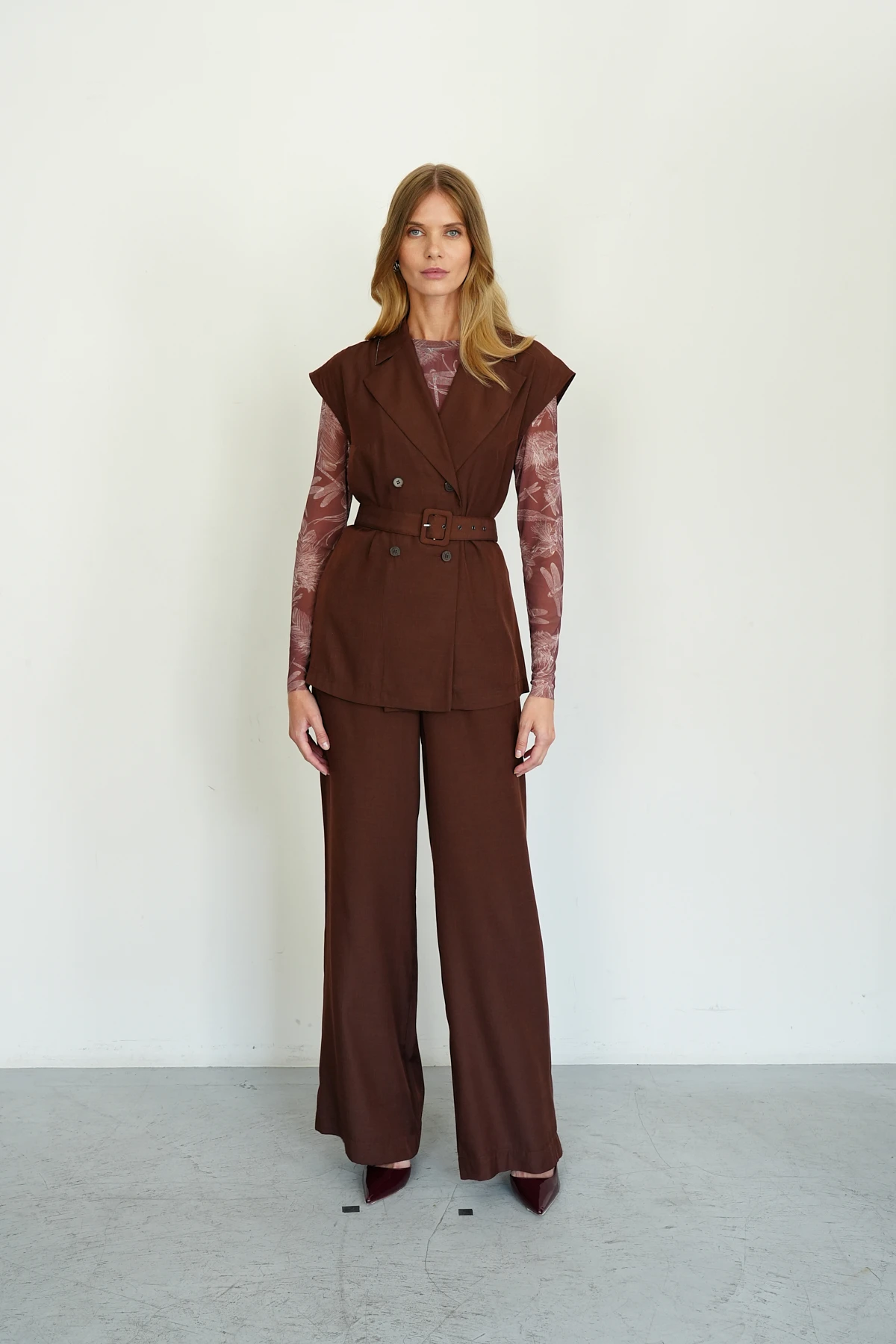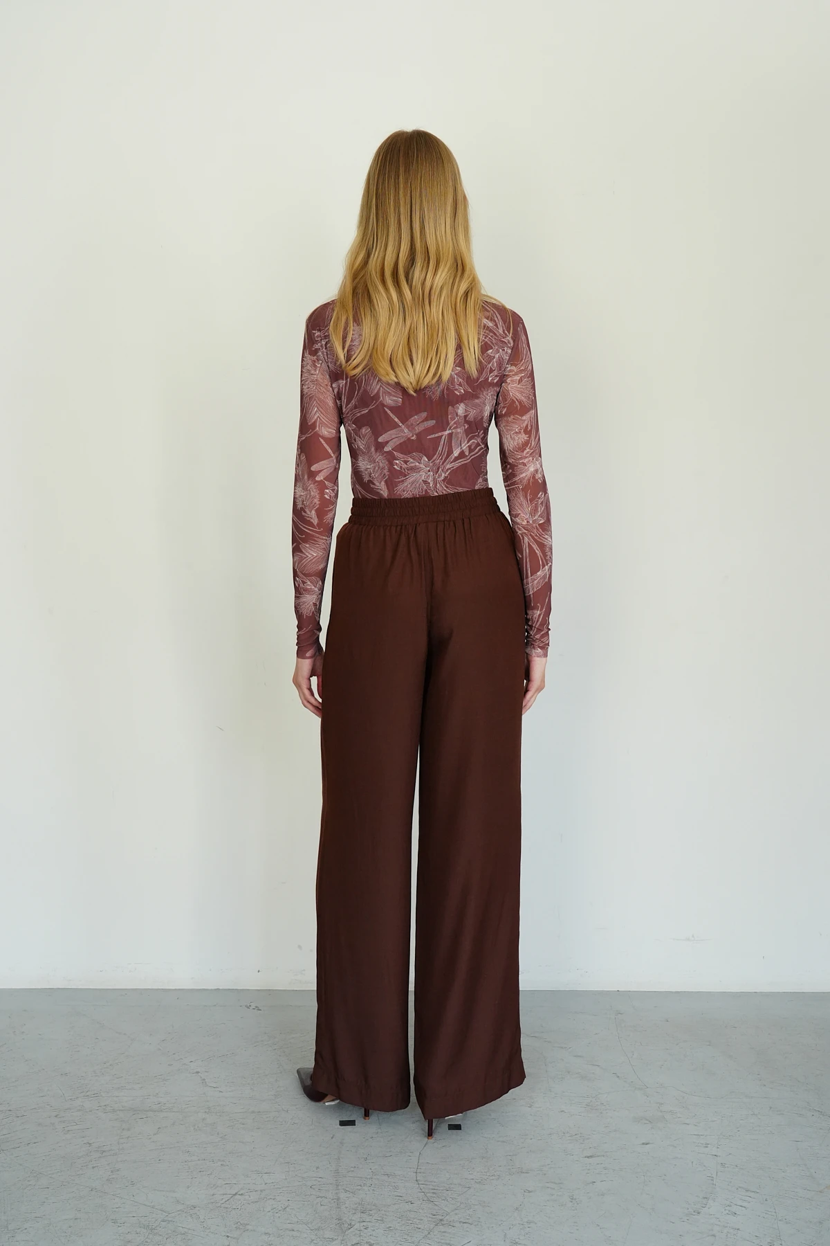 Широкие брюки из тактильно приятной струящейся ткани с добавлением вискозы в шоколадном оттенке с благородным отливом. Эластичный пояс обеспечивает идеальную посадку по талии. Карманы в боковых швах добавляют практичности модели, сохраняя её минималистичный стиль. Универсальный фасон позволяет сочетать брюки как с классическими блузками и жакетами, так и с повседневными топами для расслабленного образа.