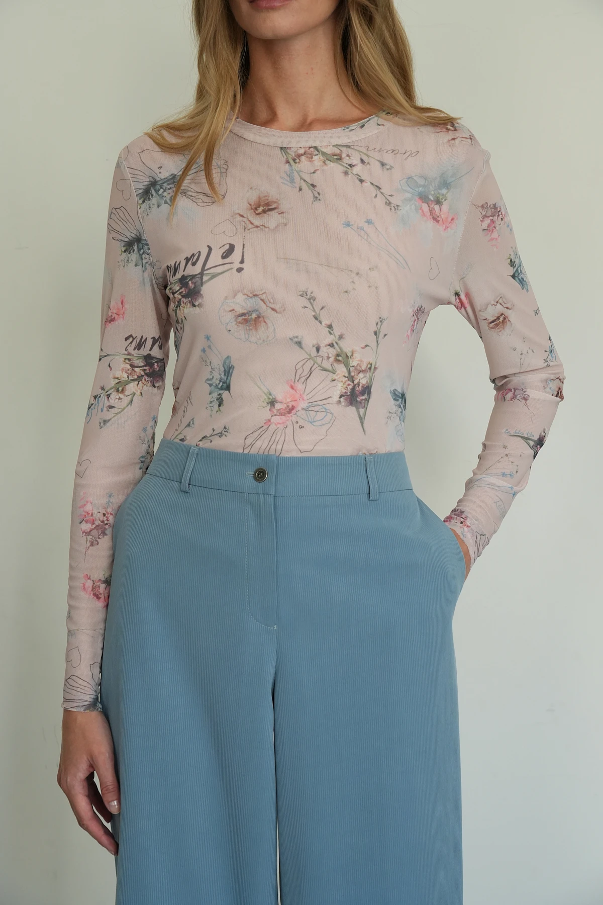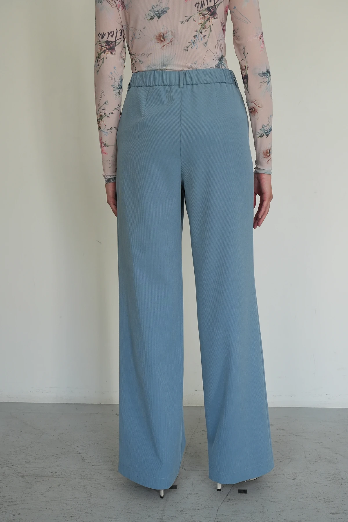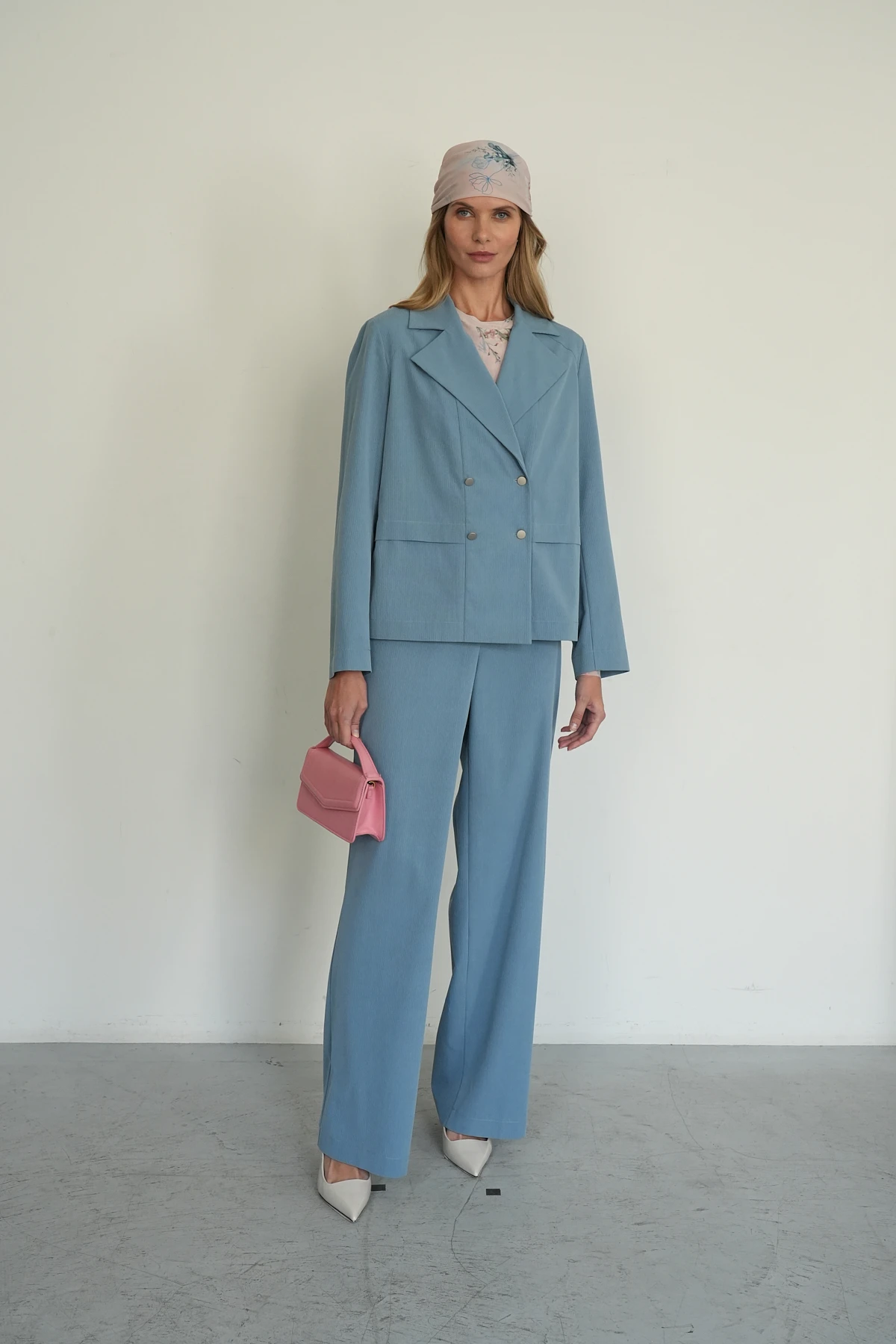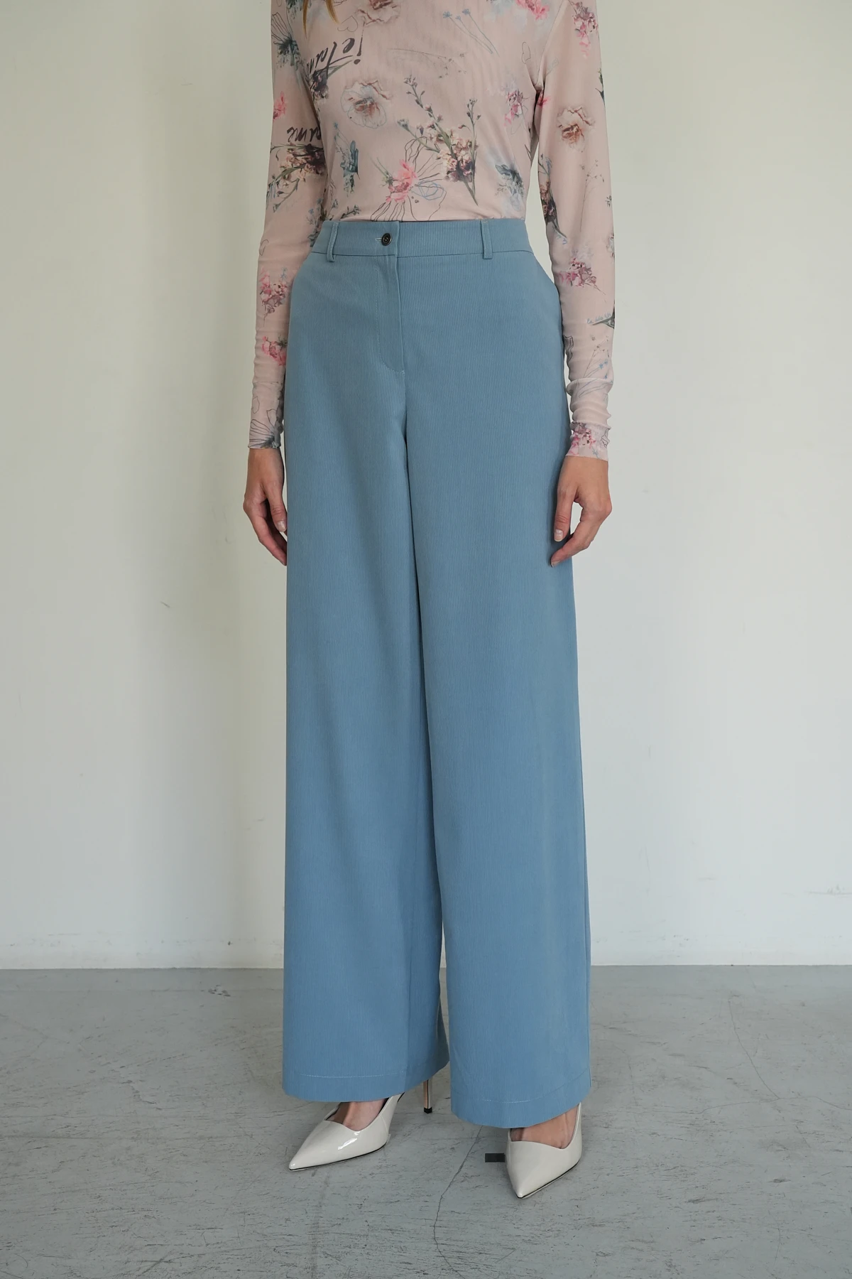 Монохромные брюки из ткани на основе премиального района с эффектом бархатистого вельвета в изысканном серо-голубом оттенке. Широкий прямой крой подчёркивает элегантность и современность модели. По передним половинкам расположены притачной пояс и карманы с подкройными бочками, обеспечивающие удобство. Задняя часть дополнена поясом на эластичной ленте и вытачками для идеальной посадки. Шлёвки на поясе позволяют дополнить образ ремнём, а застёжка на молнию и брендированная пуговица из шлифованного металла завершают лаконичный и утончённый дизайн. Брюки — отличный выбор для повседневного и делового гардероба.