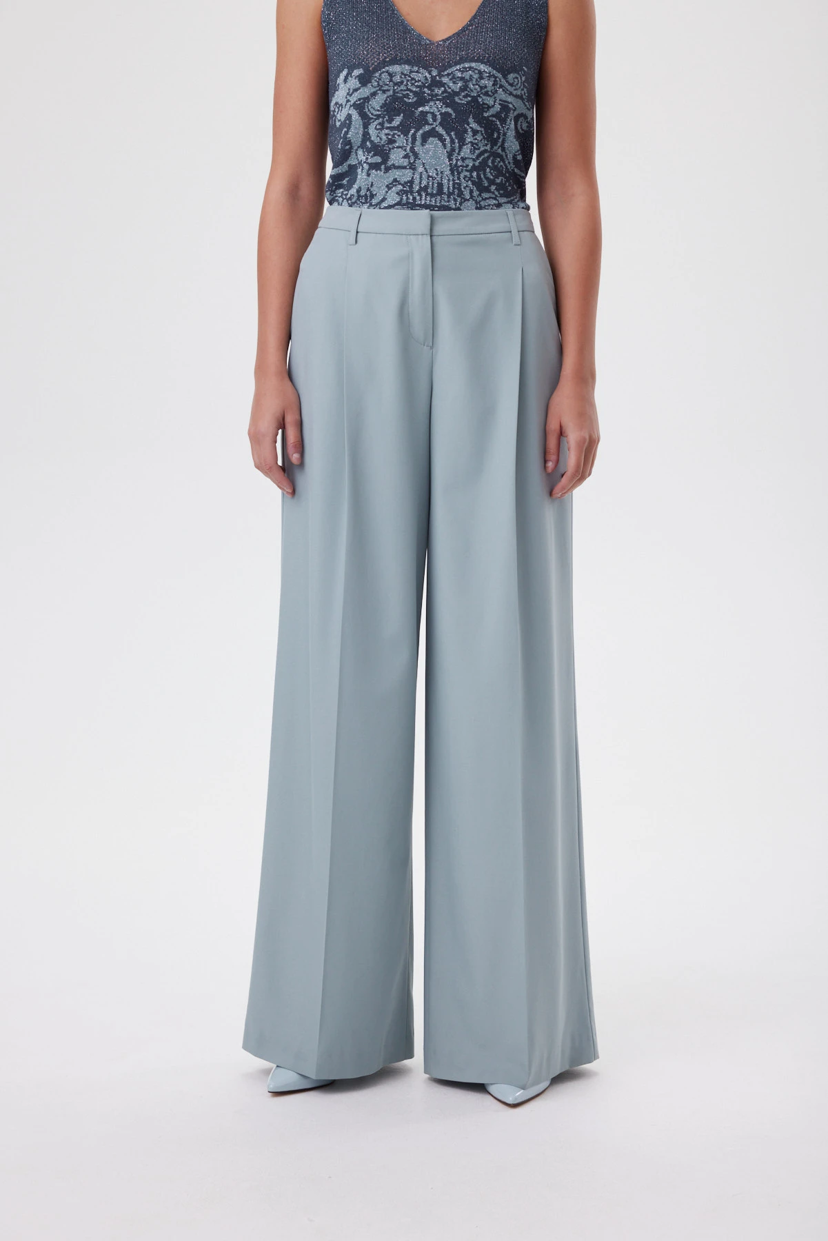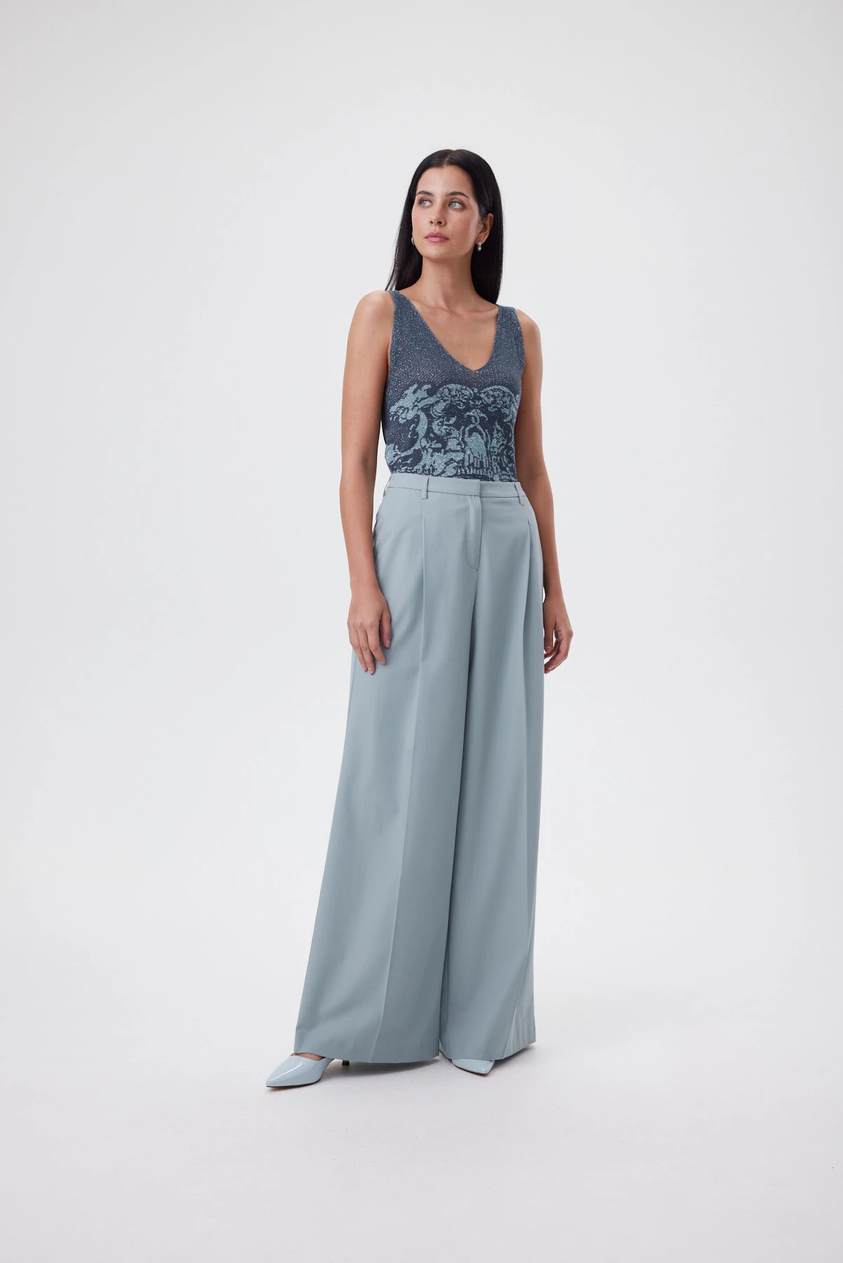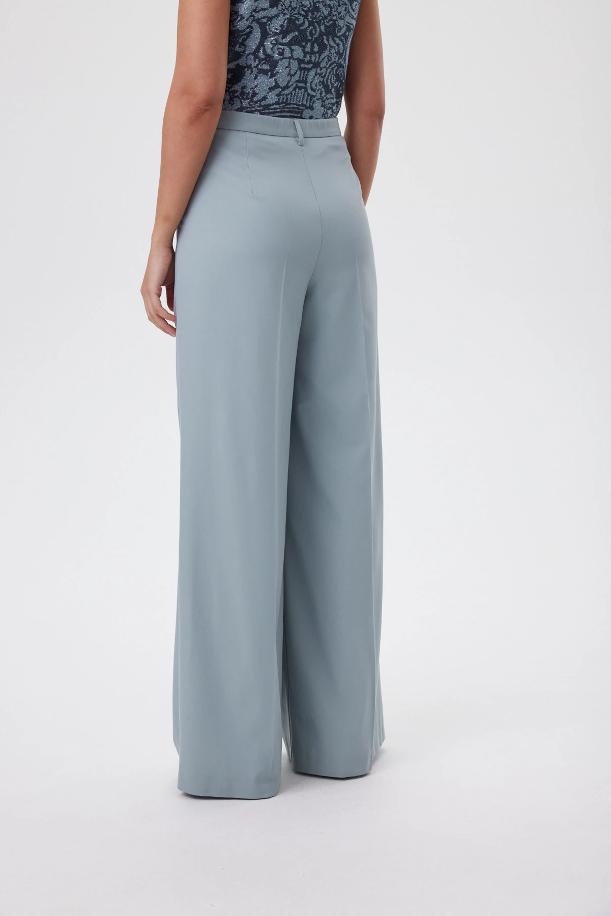 Брюки в современной форме wide leg плавно раскрываются к низу, сохраняя аккуратно очерченную талию — силуэт визуально вытягивается, а пропорции выглядят особенно гармонично. Классическая стрелка зафиксирована точной отстрочкой, а одна мягкая складка поддерживает чистоту линий и красивое движение ткани. Премиальный материал сложного мятного оттенка ложится ровно, держит форму без заломов. Универсальная пара для ситуаций от офиса до вечернего выхода — минимализм без строгого официоза.