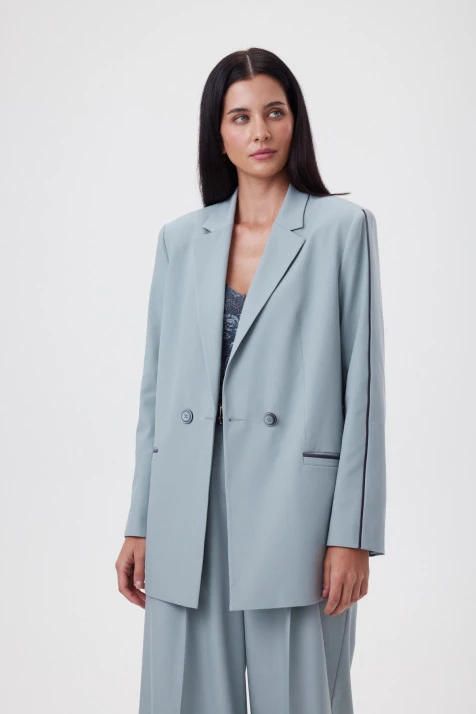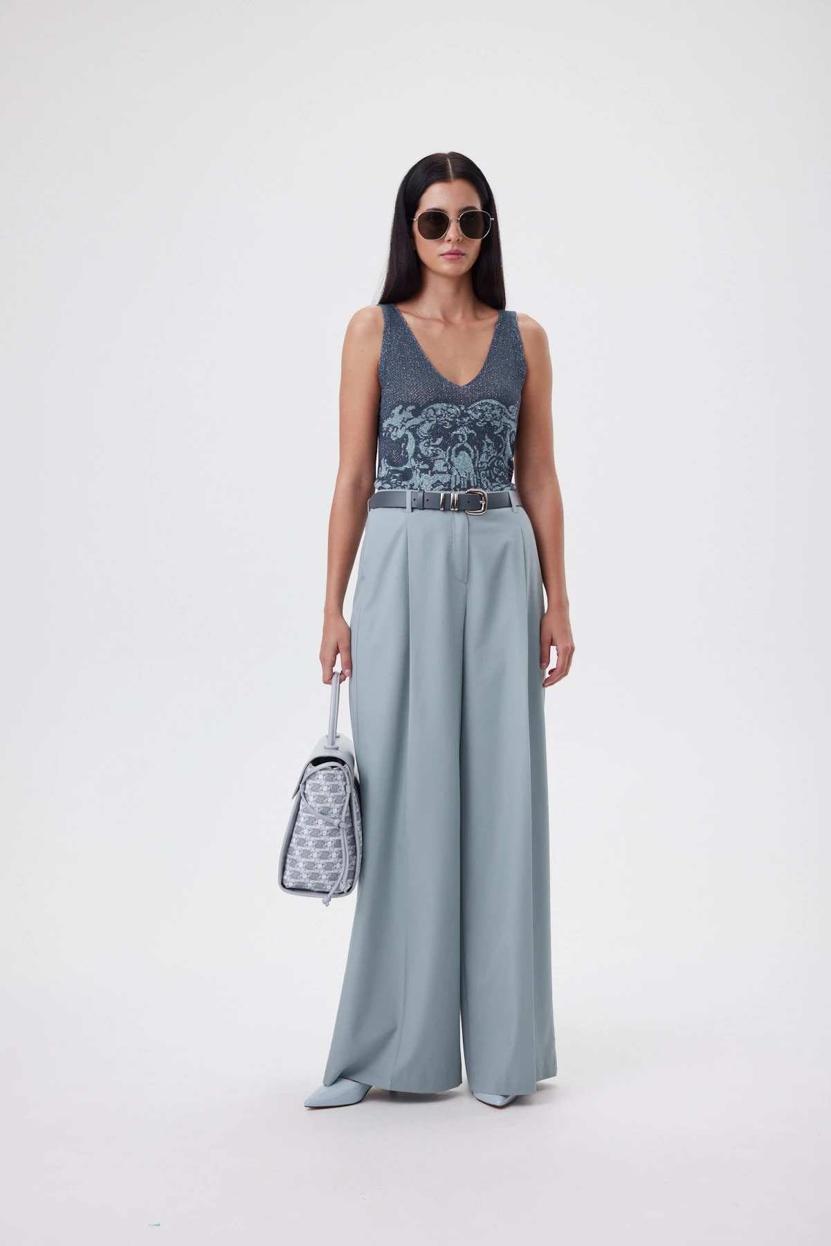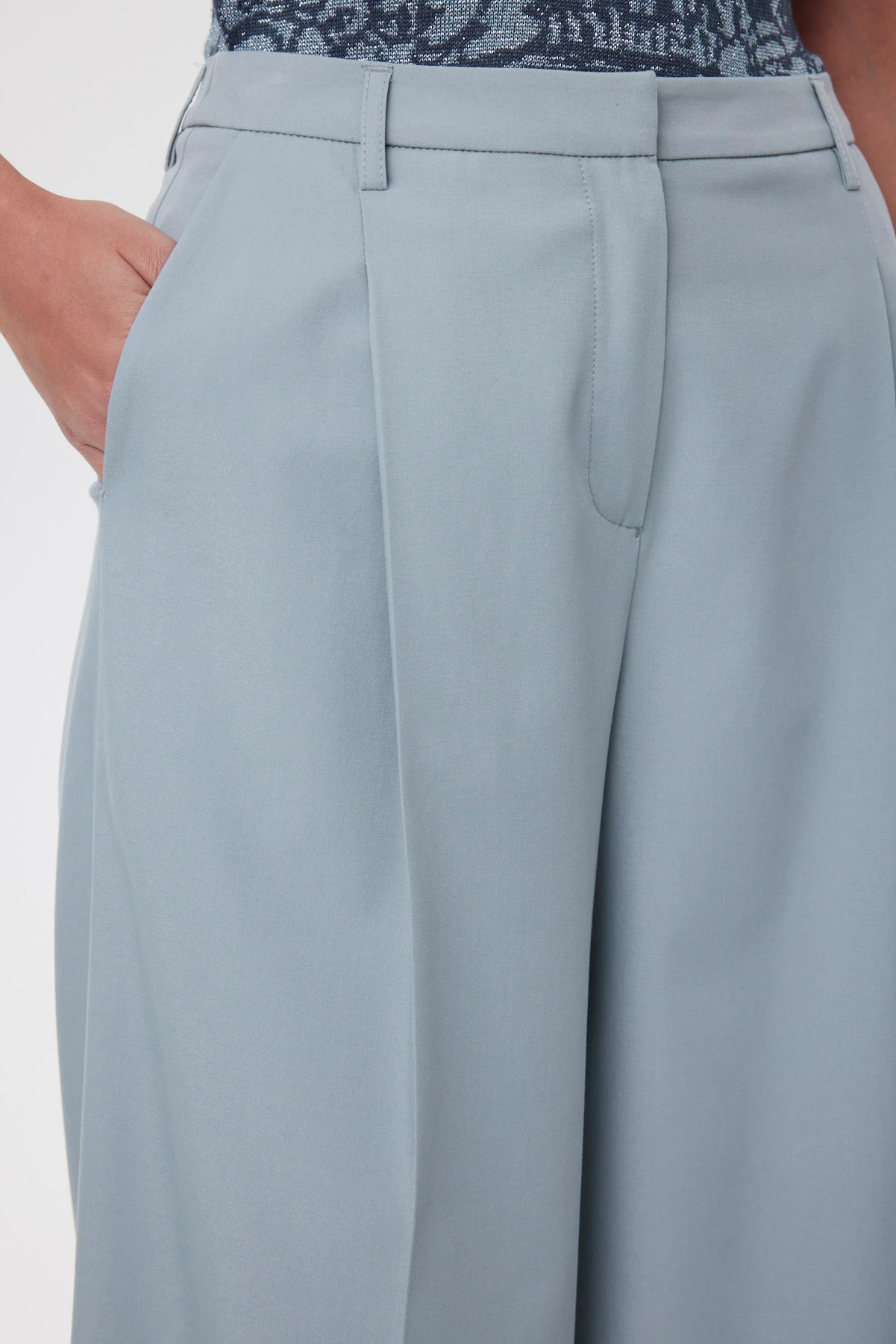 Брюки в современной форме wide leg плавно раскрываются к низу, сохраняя аккуратно очерченную талию — силуэт визуально вытягивается, а пропорции выглядят особенно гармонично. Классическая стрелка зафиксирована точной отстрочкой, а одна мягкая складка поддерживает чистоту линий и красивое движение ткани. Премиальный материал сложного мятного оттенка ложится ровно, держит форму без заломов. Универсальная пара для ситуаций от офиса до вечернего выхода — минимализм без строгого официоза.