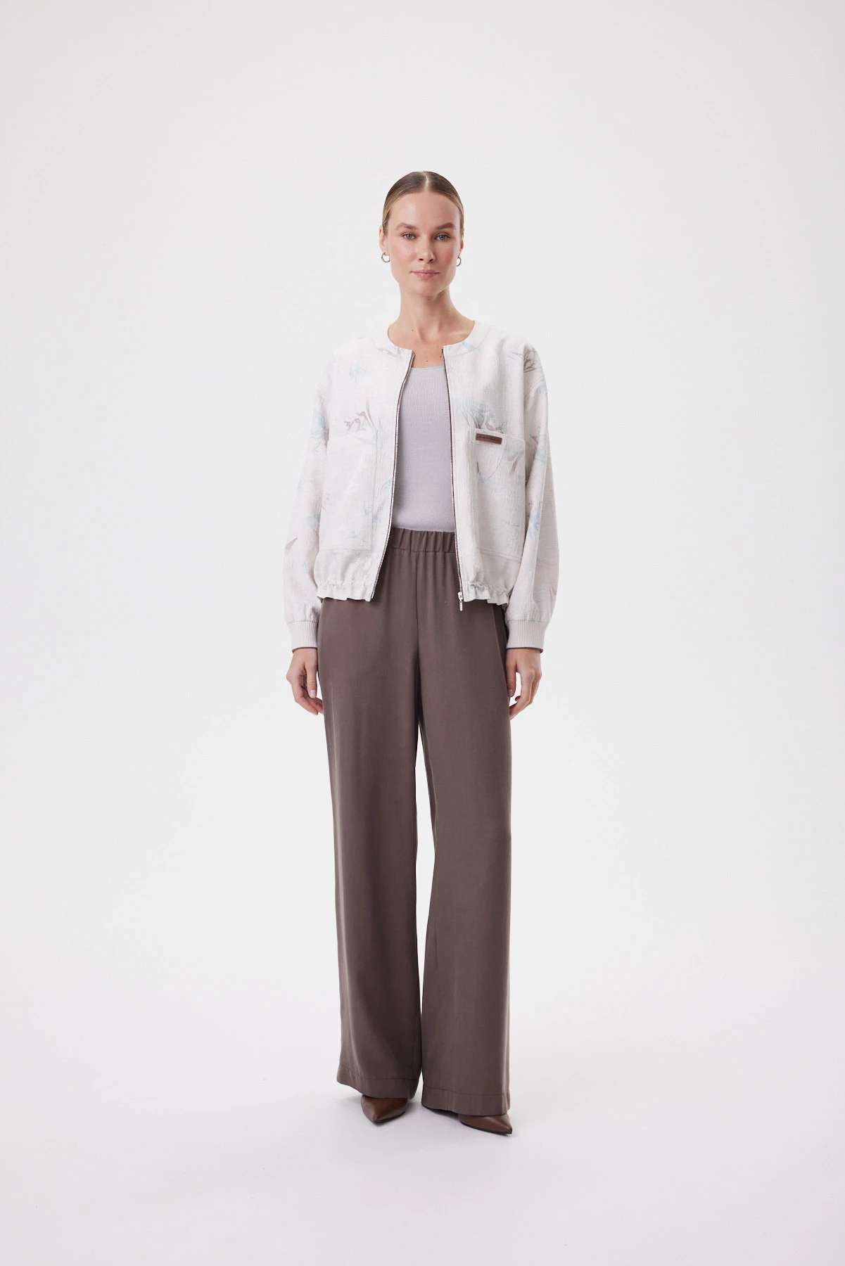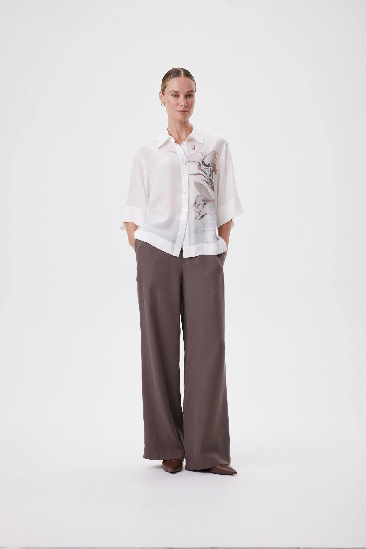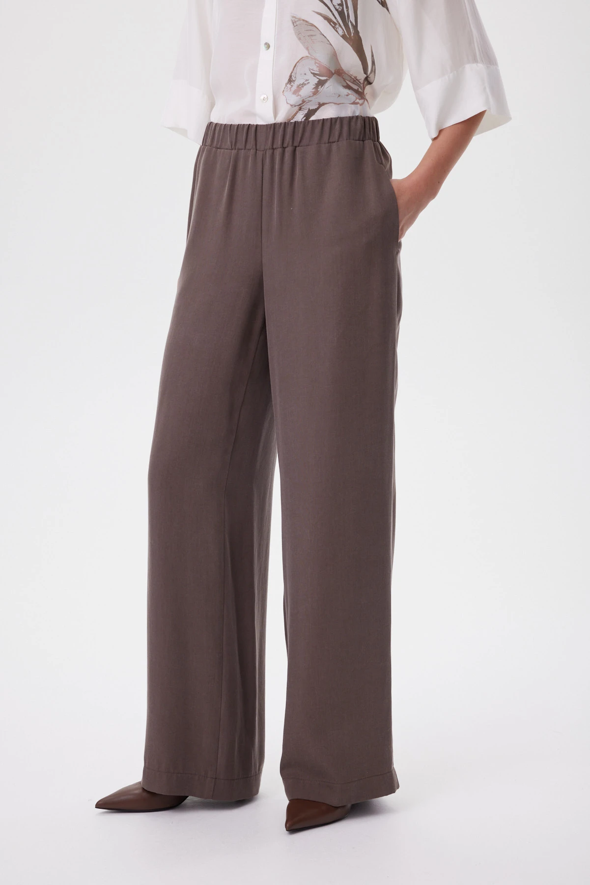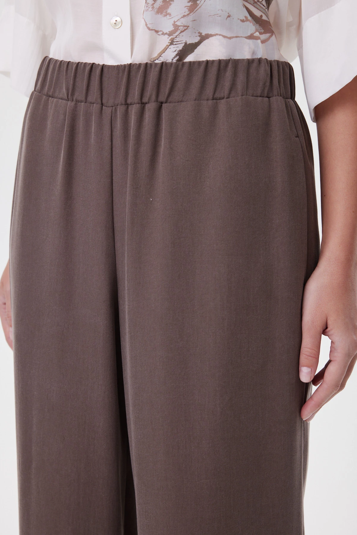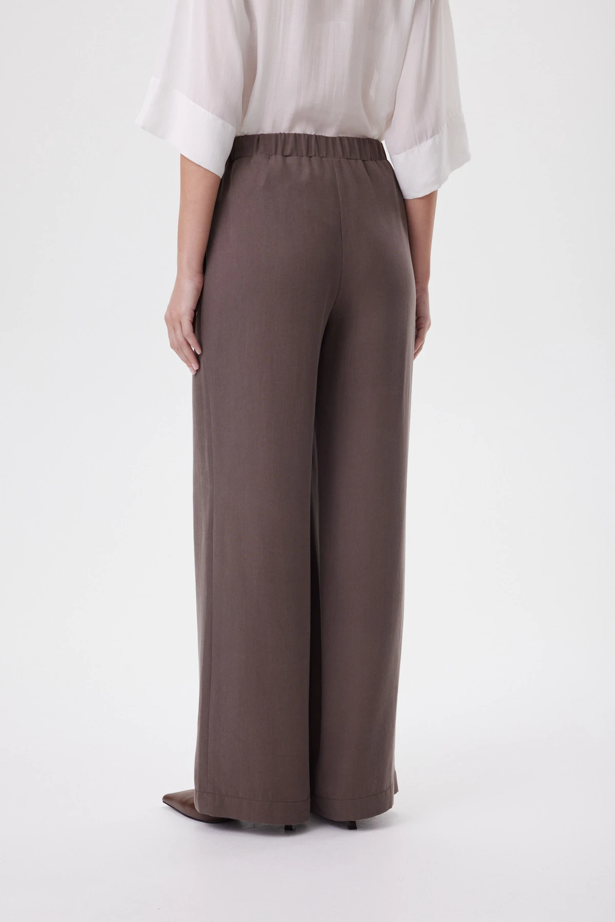 Прямые, слегка широкие брюки на мягкой посадке с полностью эластичным поясом садятся без усилий и дают ощущение свободы в движении. Силуэт расслабленный, но собранный: тенсел струится ровной вертикалью, не «висит» и не добавляет объёма в бёдрах, а карманы в боковых швах остаются незаметными и сохраняют чистую линию. Премиальный тенсел шелковистый и прохладный к коже, почти не мнётся и красиво драпируется за счёт лёгкого веса — брюки выглядят аккуратно даже после долгого дня. Сочетайте с молочной рубашкой и сандалиями, с лаконичным топом для монохрома или с жакетом — чтобы собрать вечерний городской комплект.