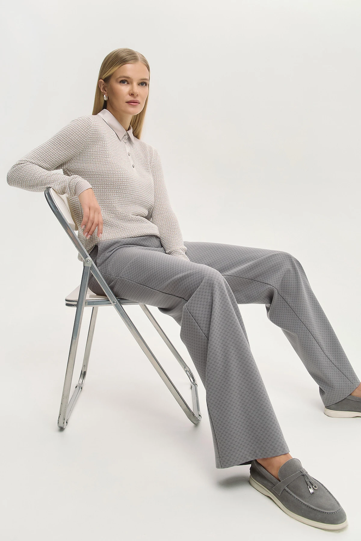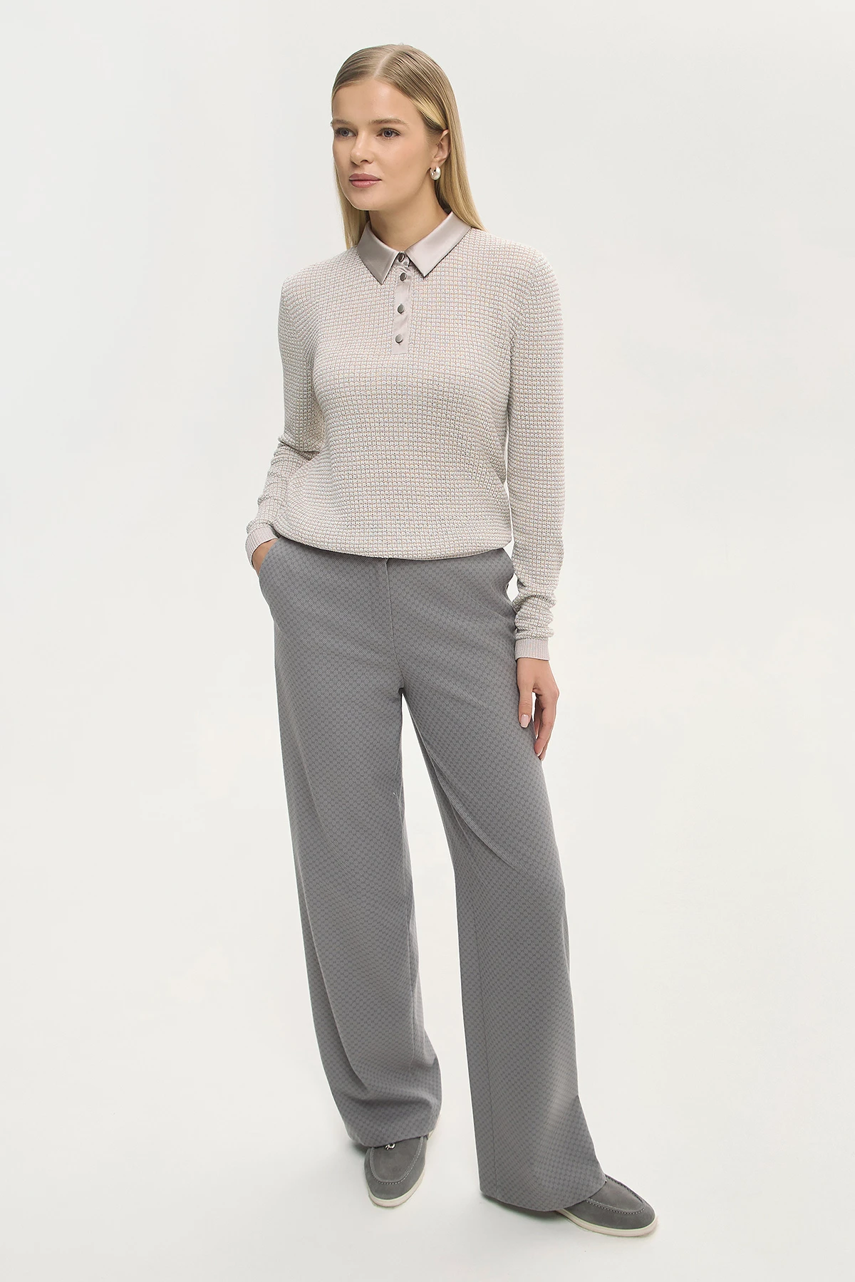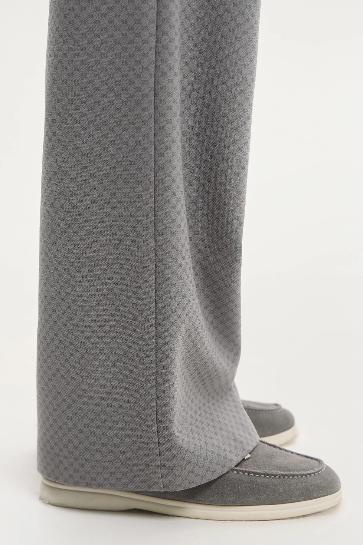 Мягкий материал с ненавязчивым паттерном в виде стилизованного числа 88 добавляет фактурности и глубины. Комфортная средняя посадка – классический выбор для ежедневных образов. Прямой крой подходит для фигуры любого типа и сочетается с разными силуэтами. Утончённая серая палитра легко комбинируется с базовыми и акцентными вещами. Эластичный пояс сзади добавляет удобства в движении и не создаёт давления. Модель дополнена карманами и шлёвками для ношения ремня.