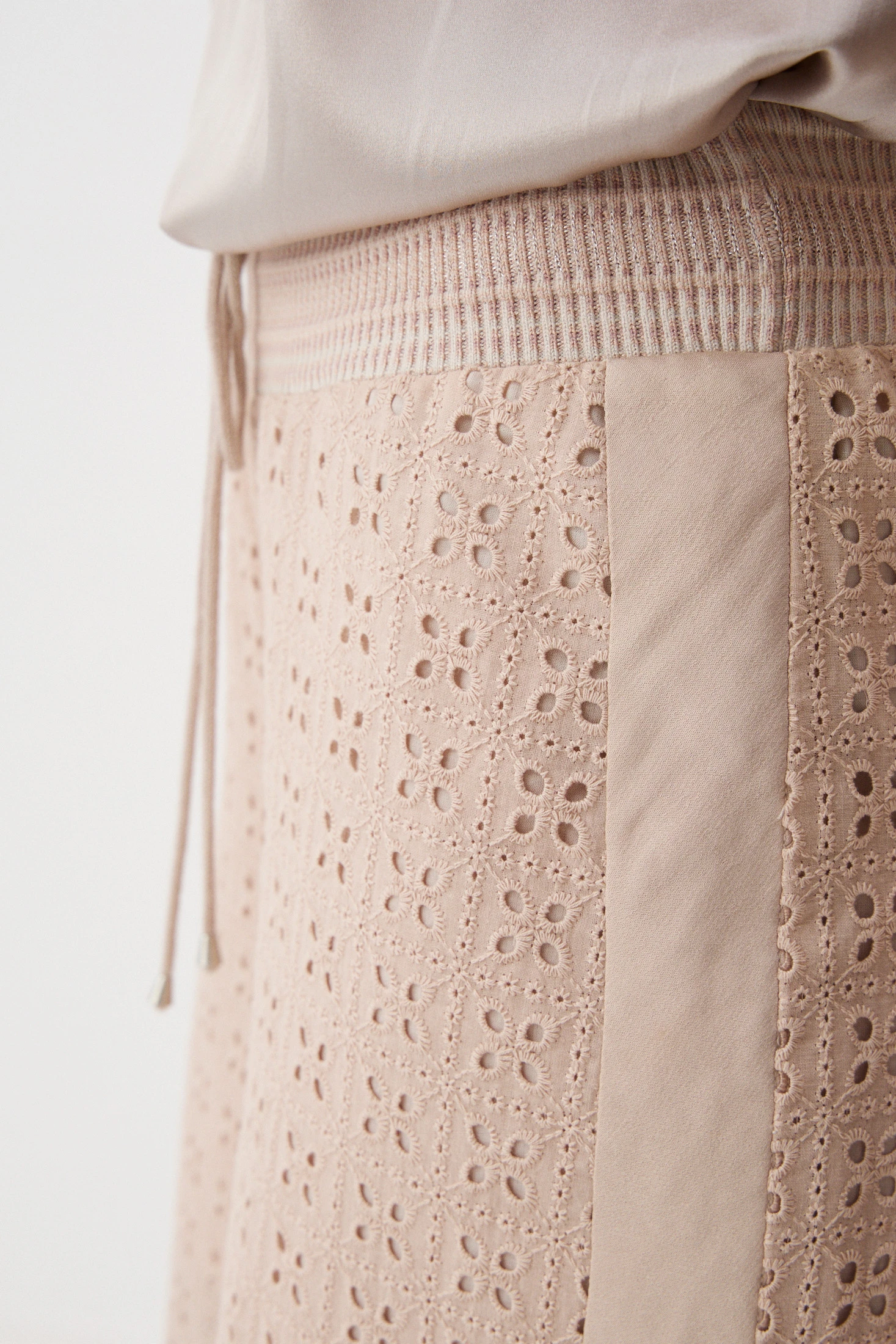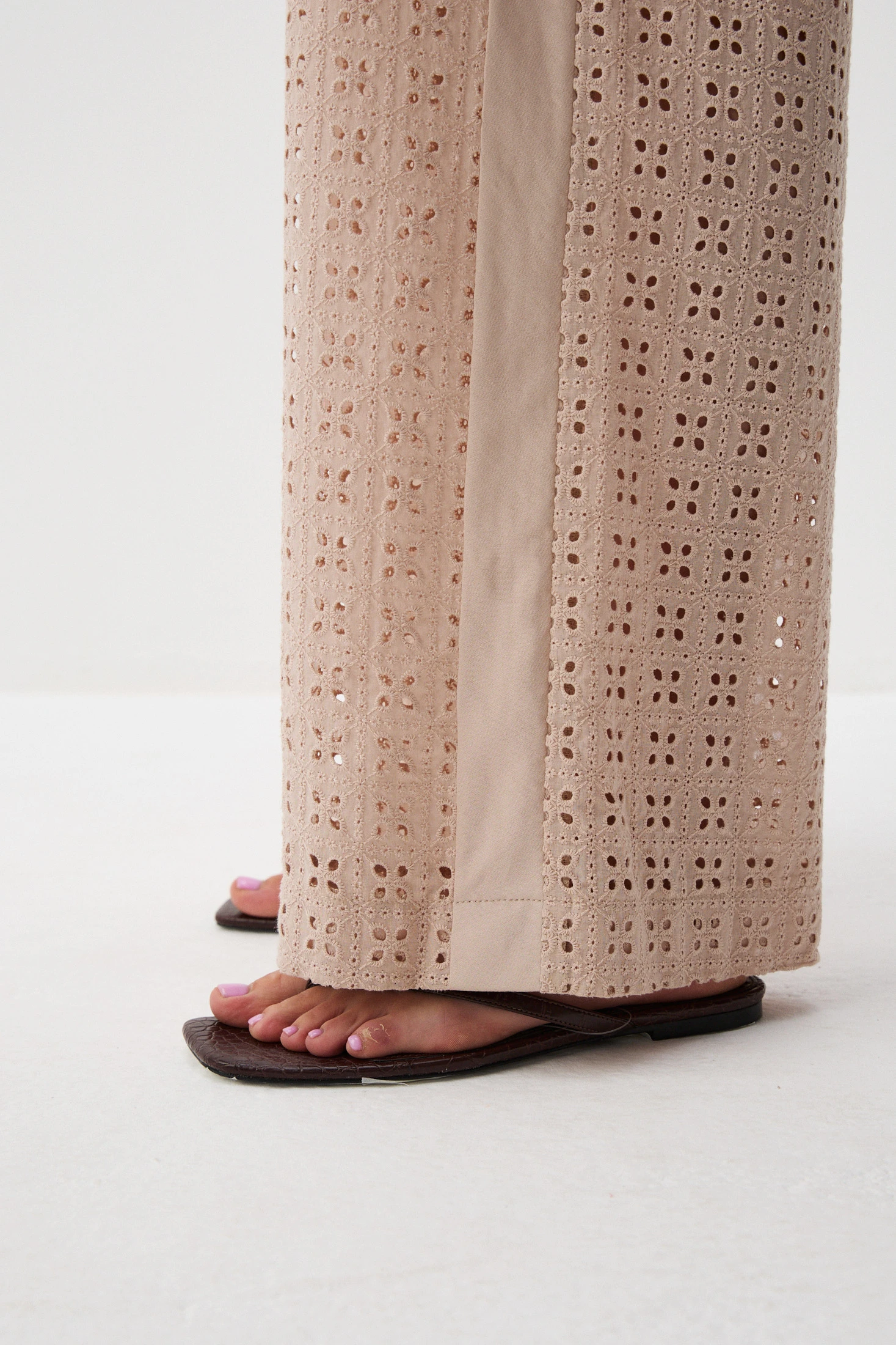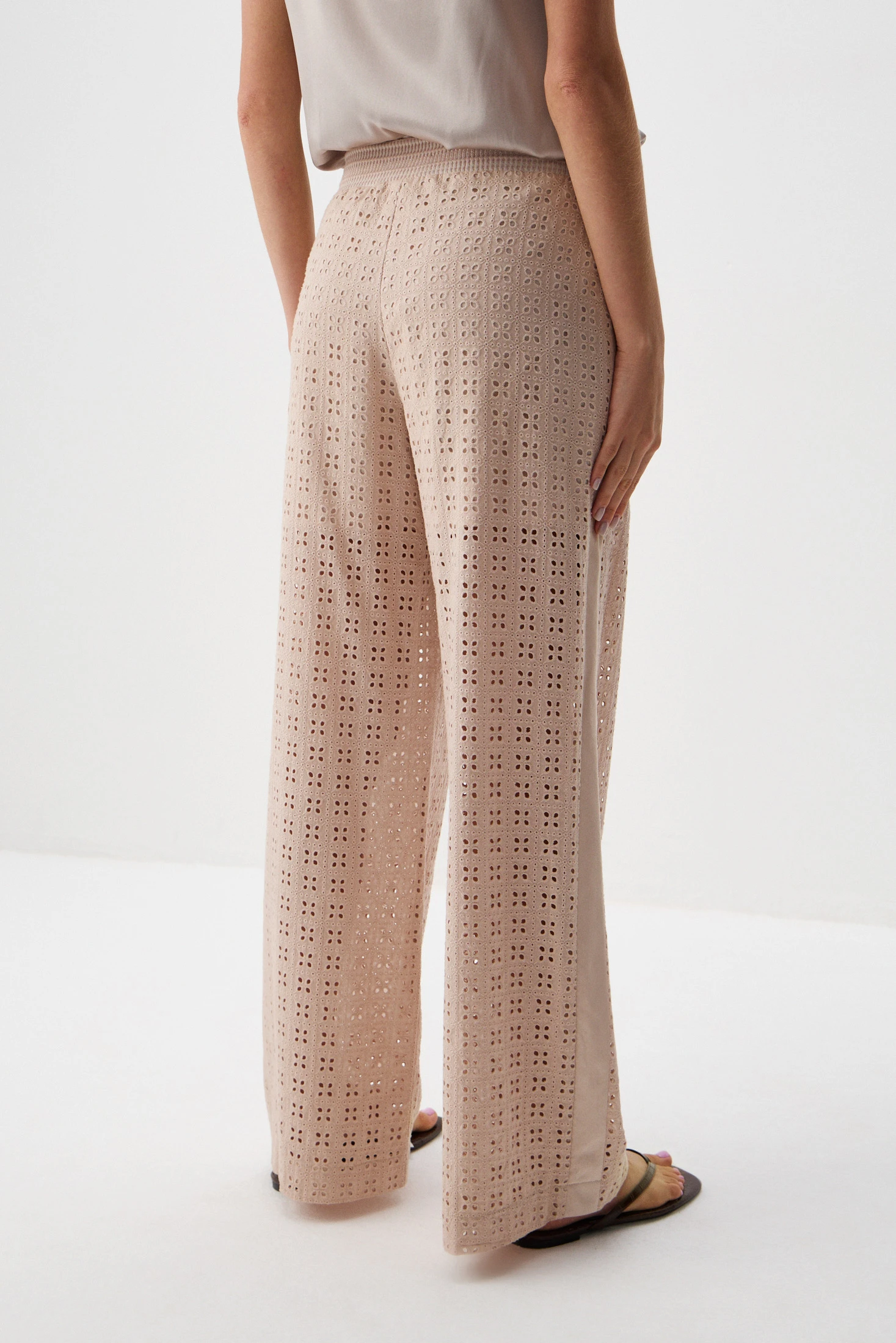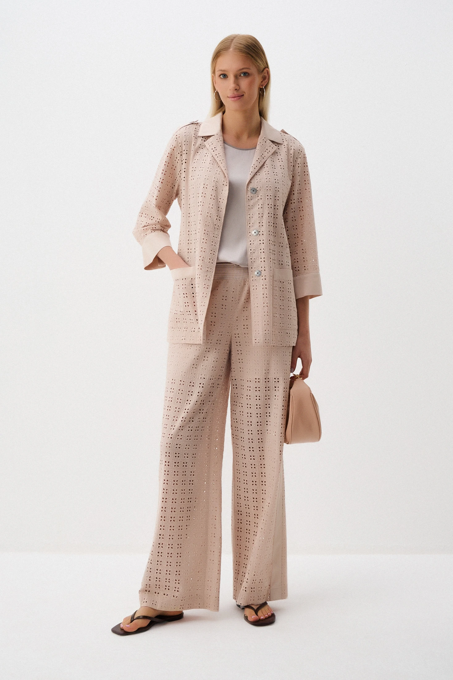 ALEXANDER BOGDANOV привносит ноту романтики в трендовые брюки-палаццо: брюки «Светлый город» – это модный крой в сочетании с изысканным шитьём. Невозможно представить летнюю коллекцию без этого уникального материала: натуральный состав, воздухопроницаемые и гигроскопичные свойства ткани позволяют создавать романтичные и удобные модели. Изюминка модели – в отделке. Обратите внимание на роскошные сатиновые лампасы и трикотажный пояс из авторской бейки в оттенке «пралине». Брюки дополнены комфортным подкладом.