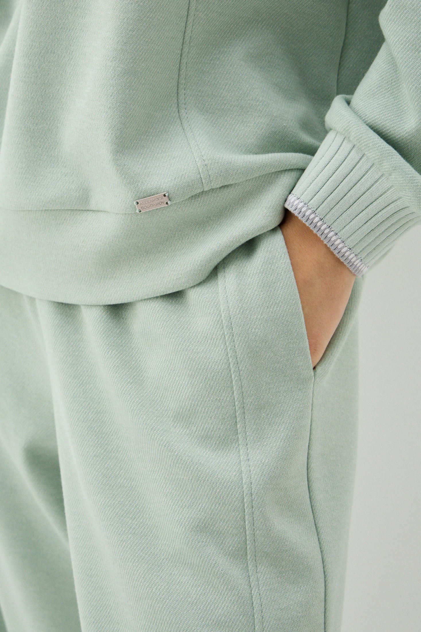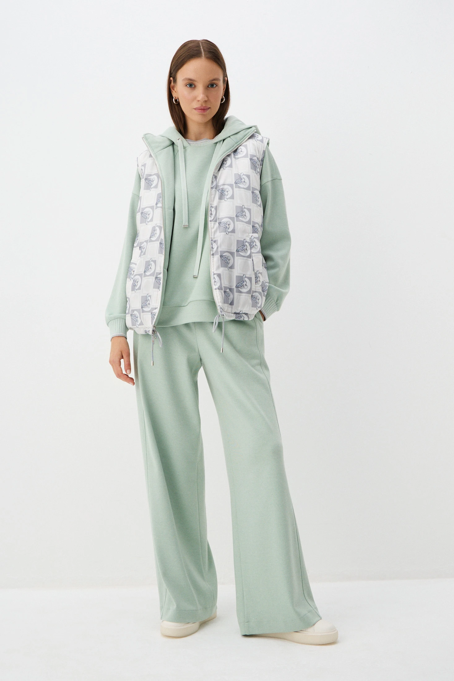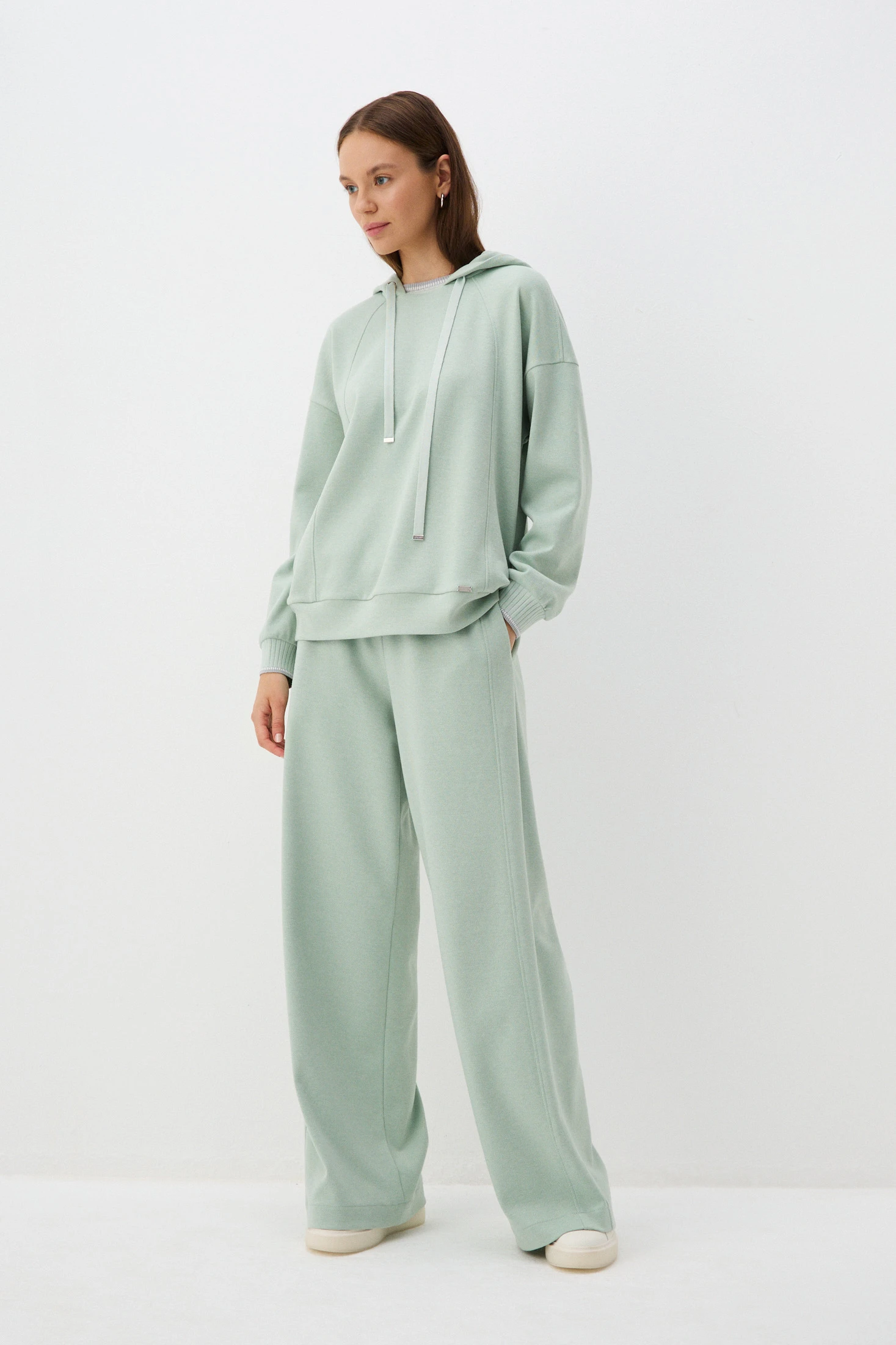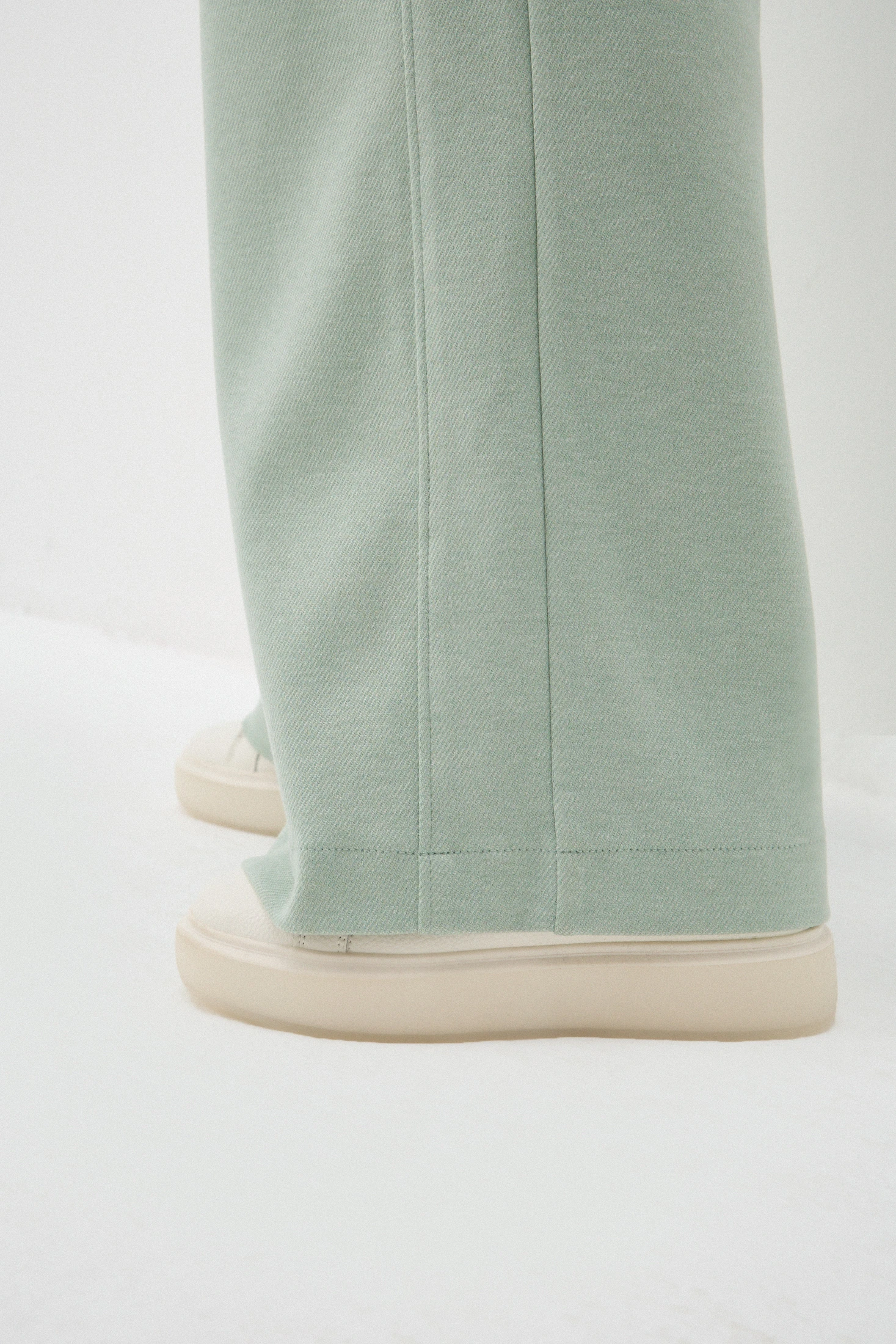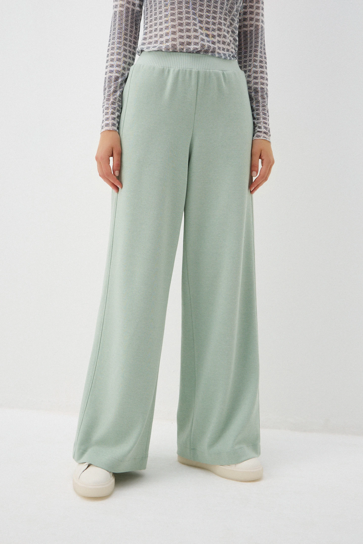 Брюки из мягкого трикотажного полотна на основе хлопка с добавлением вискозы гигроскопичны и комфортны в носке. Особенно эффектно прямые брюки будут смотреться со спортивной обувью на высокой подошве, а также в сочетании с верхней одеждой в стиле oversize – объёмным бомбером или косухой.