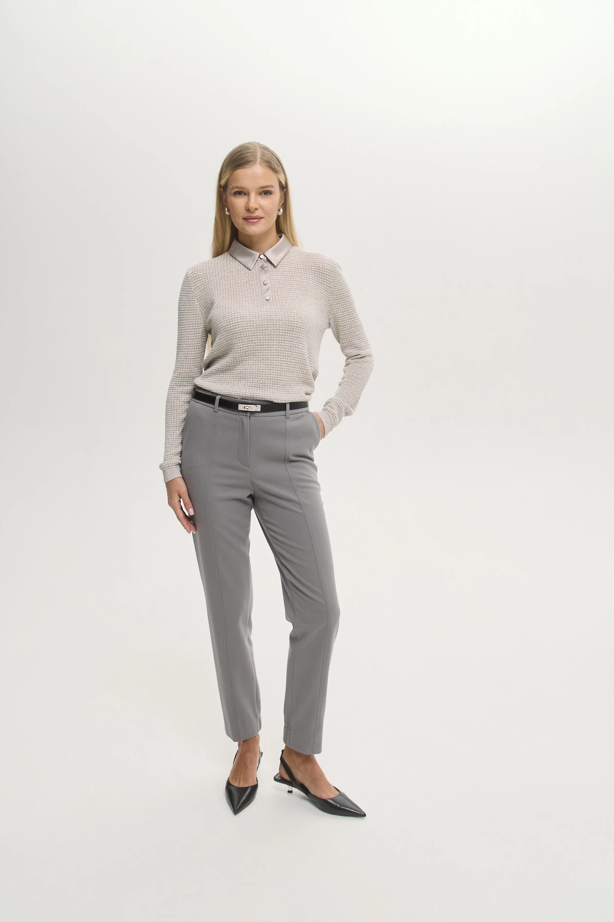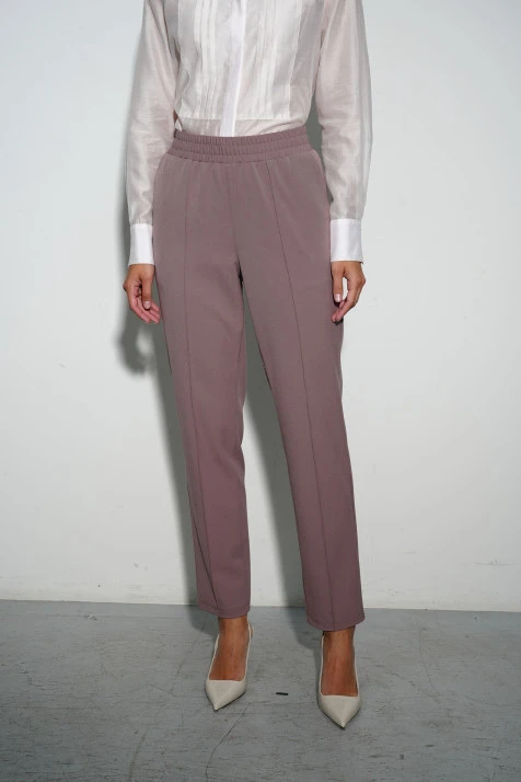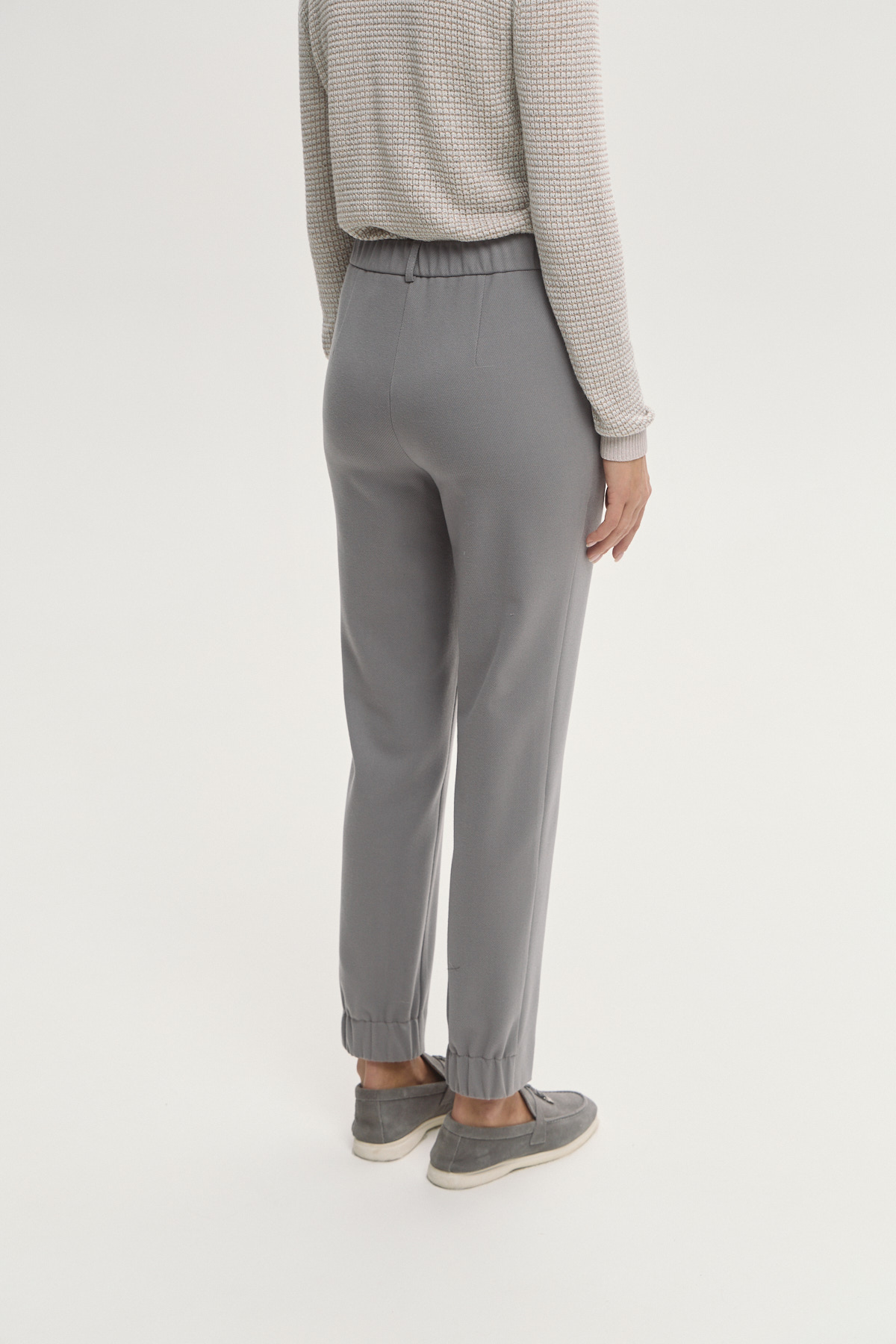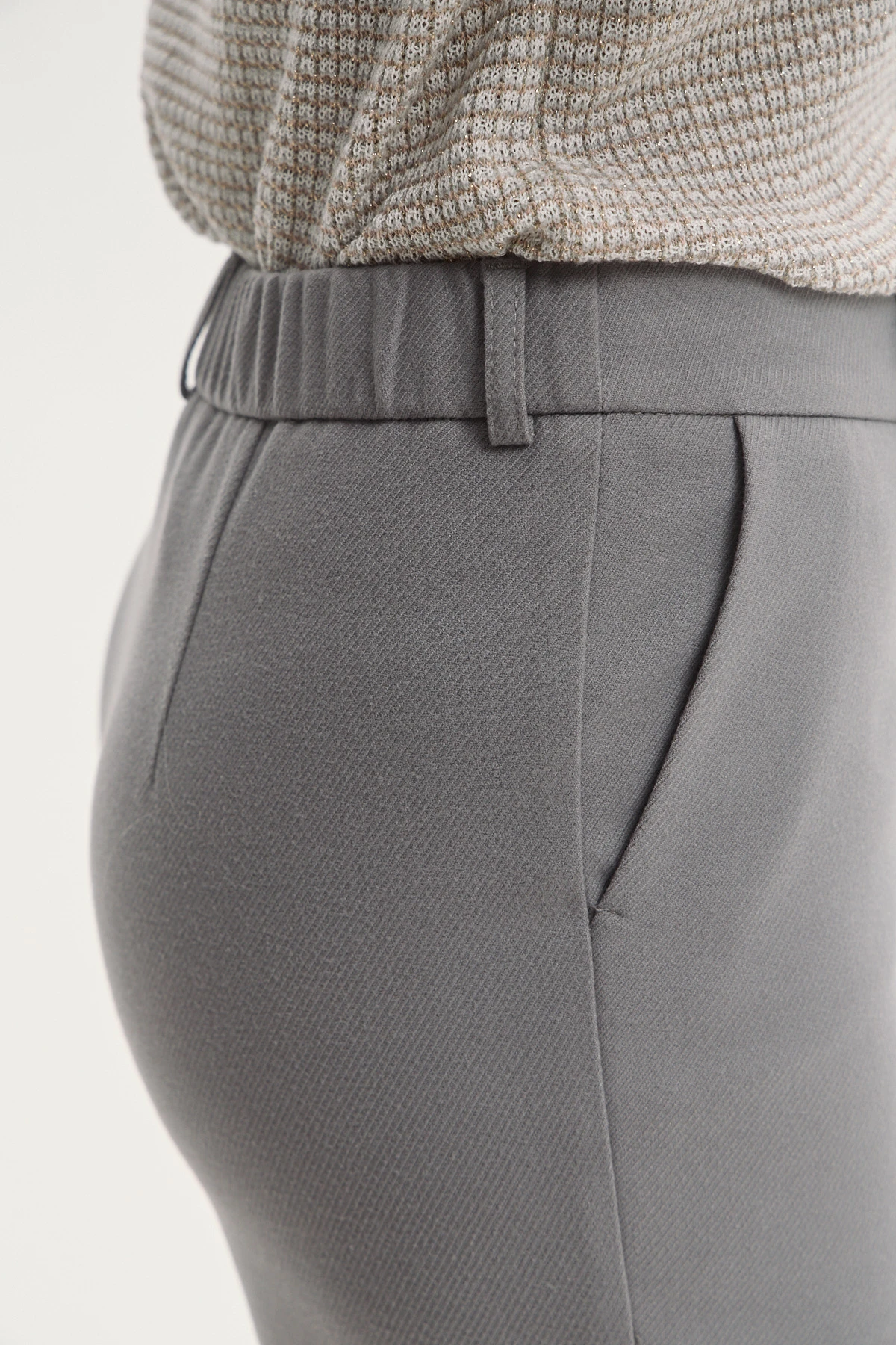 Зауженный крой с отстрочными стрелками визуально подчеркивает стройность ног. Средняя посадка брюк и эластичная лента сзади по поясу и низу брючин обеспечивают комфорт при носке в течение всего дня. Универсальный серый цвет легко сочетается с яркими, пастельными и нейтральными оттенками. Плотный, но мягкий материал держит форму и подходит как для офиса, так и для повседневных образов. Модель дополнена комфортными карманами.