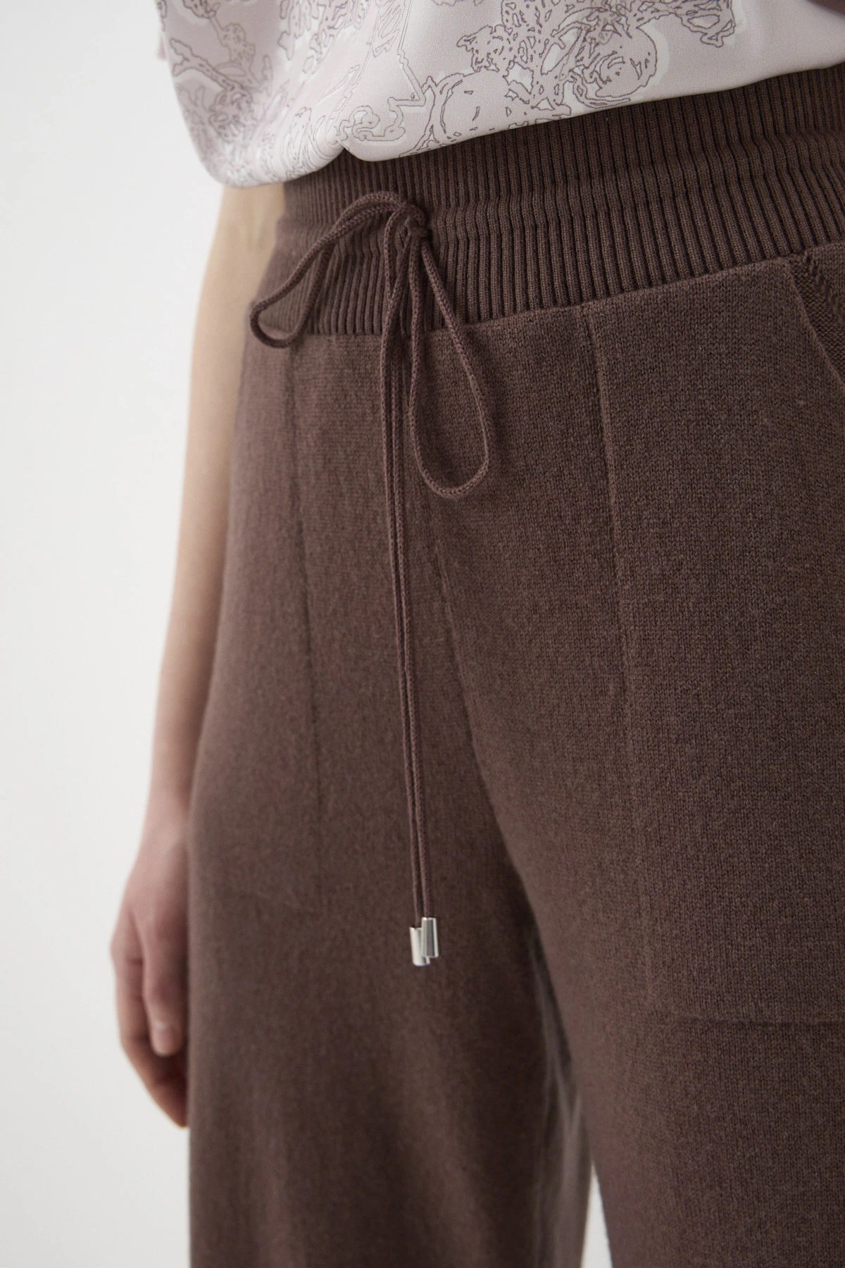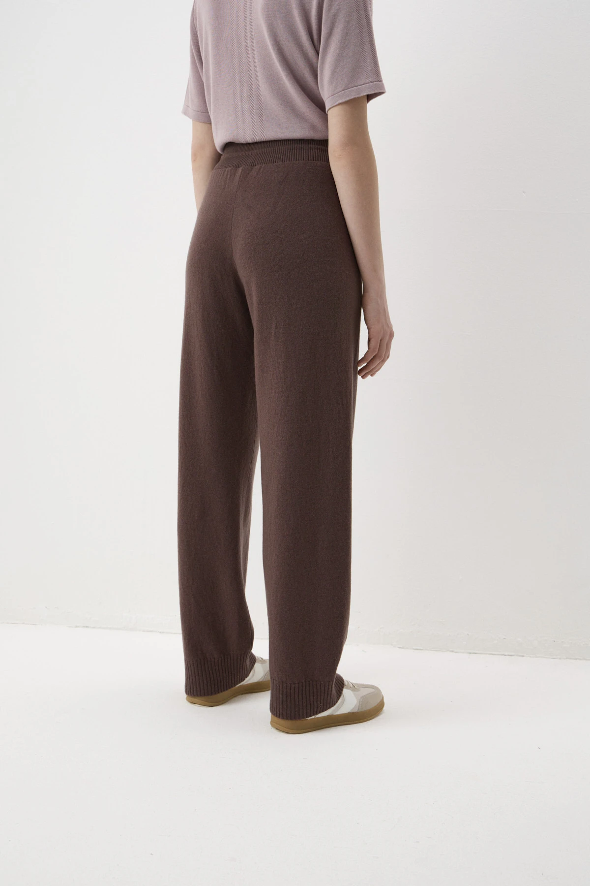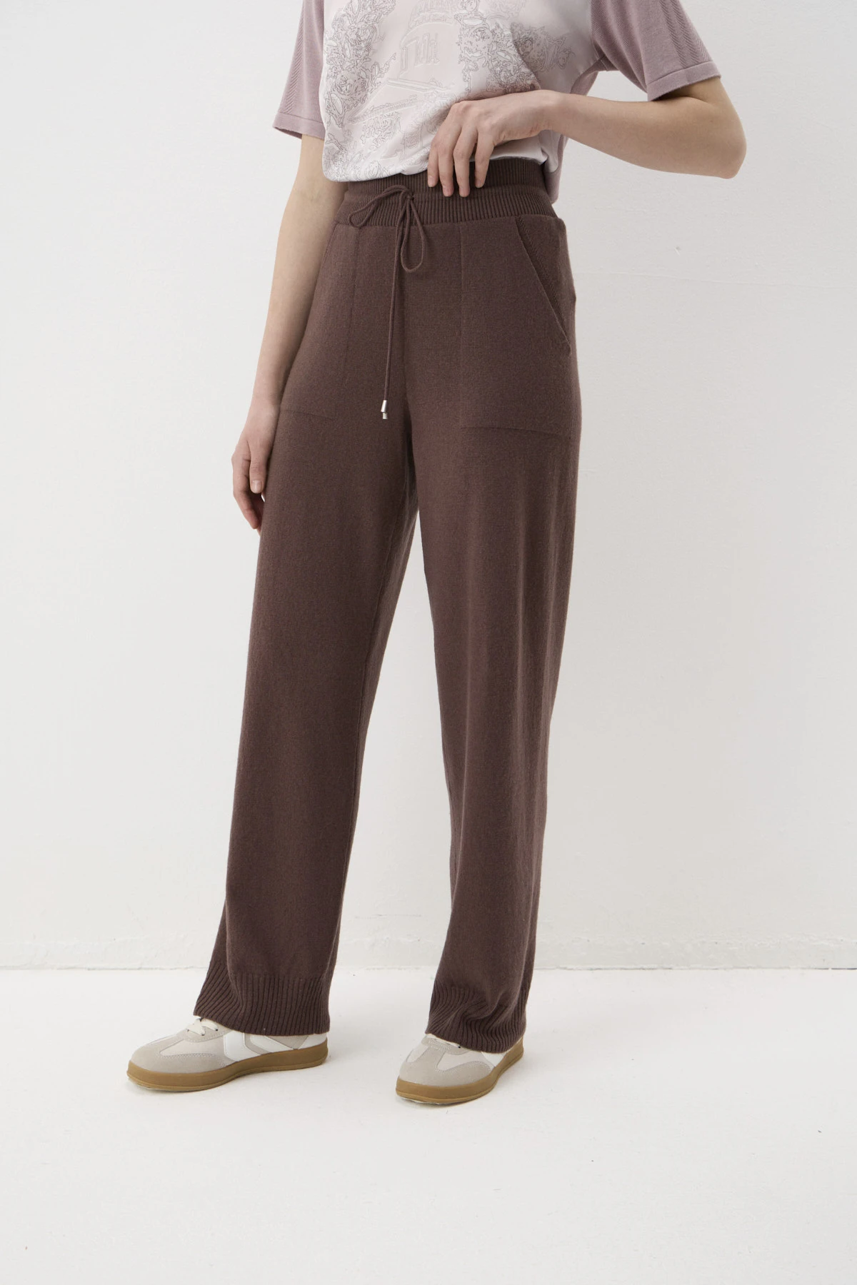 Прямые трикотажные брюки из пряжи, сочетающей тёплую шерсть, нежный кашемир и комфортную вискозу в согревающем оттенке «горячий шоколад». Для удобства в носке в модели предусмотрены карманы и пояс из широкой трикотажной бейки. Низ брюк оформлен монохромной трикотажной бейкой в «рубчик».