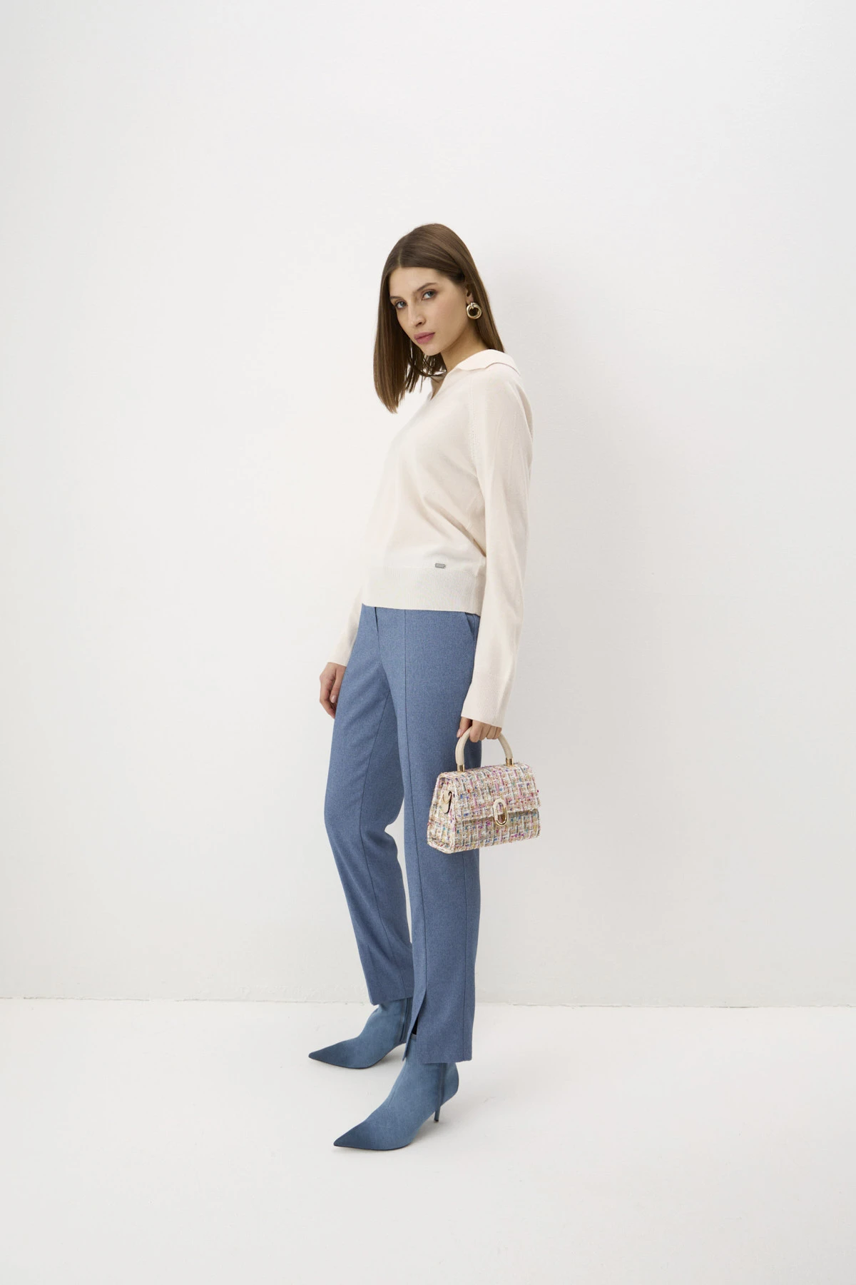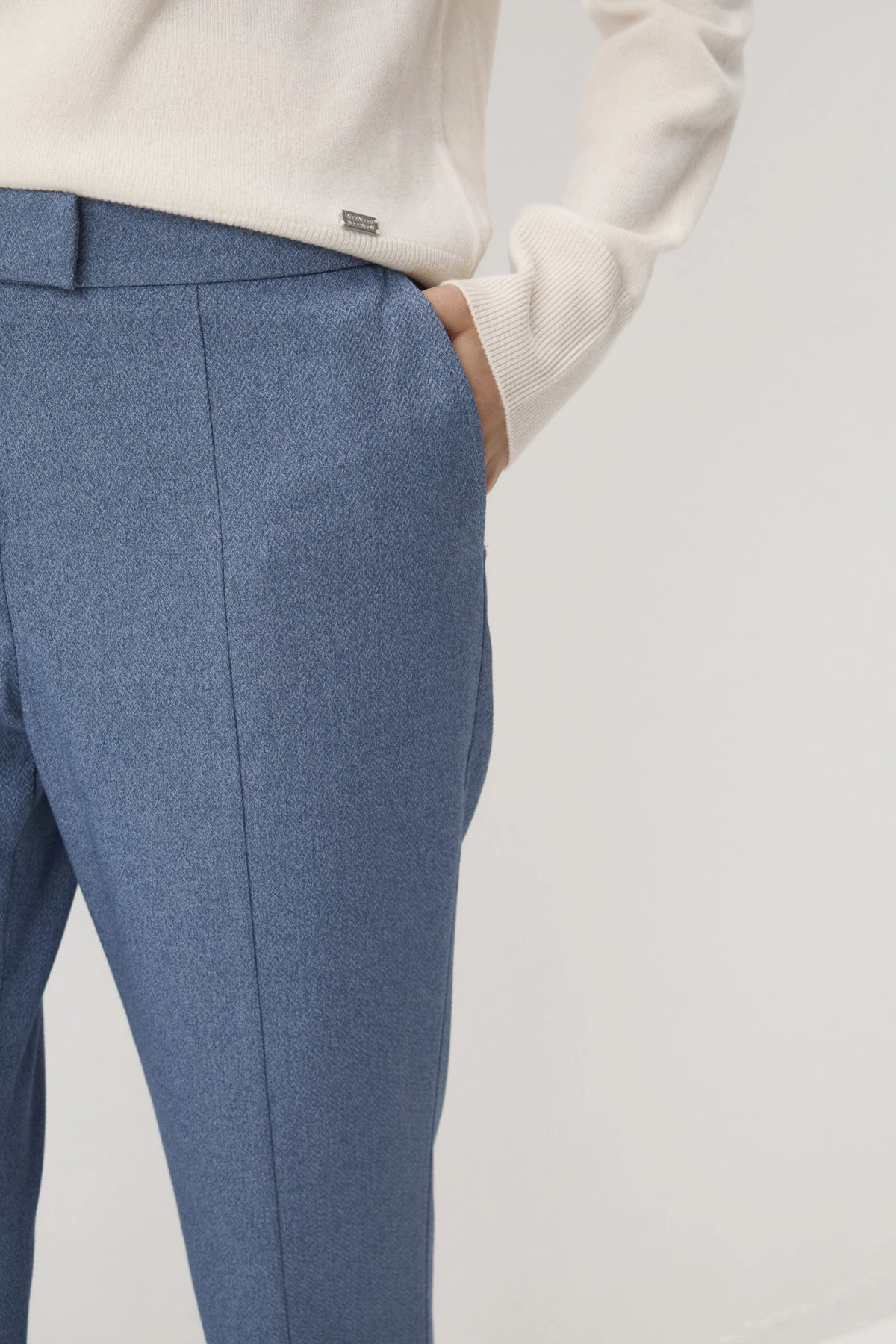 «fishbone» придаёт фактурности модели. Идеально выверенный крой создаст идеальную посадку, карманы добавляют комфорта в носке. Застёжка на молнию, пуговицу и крючок.