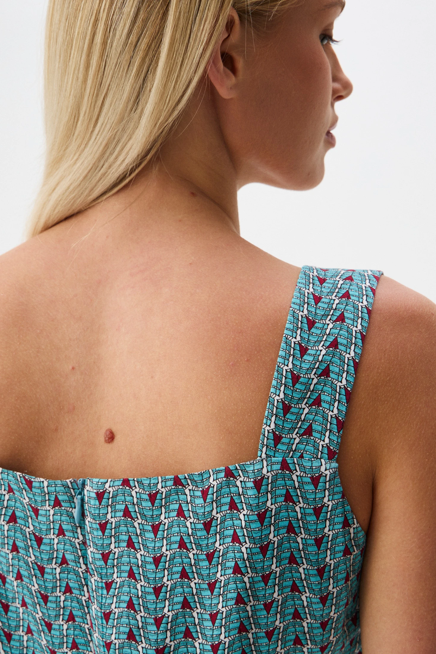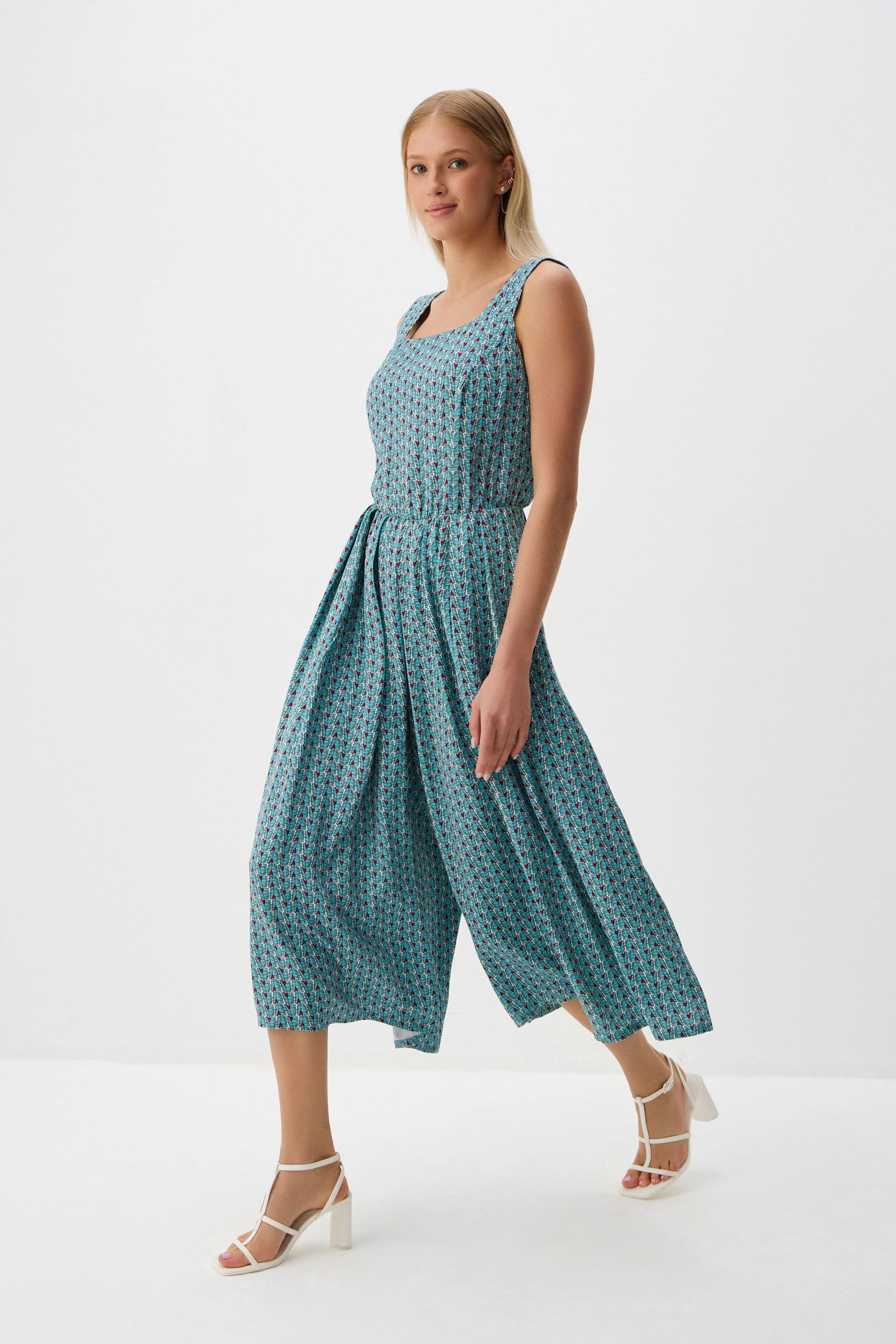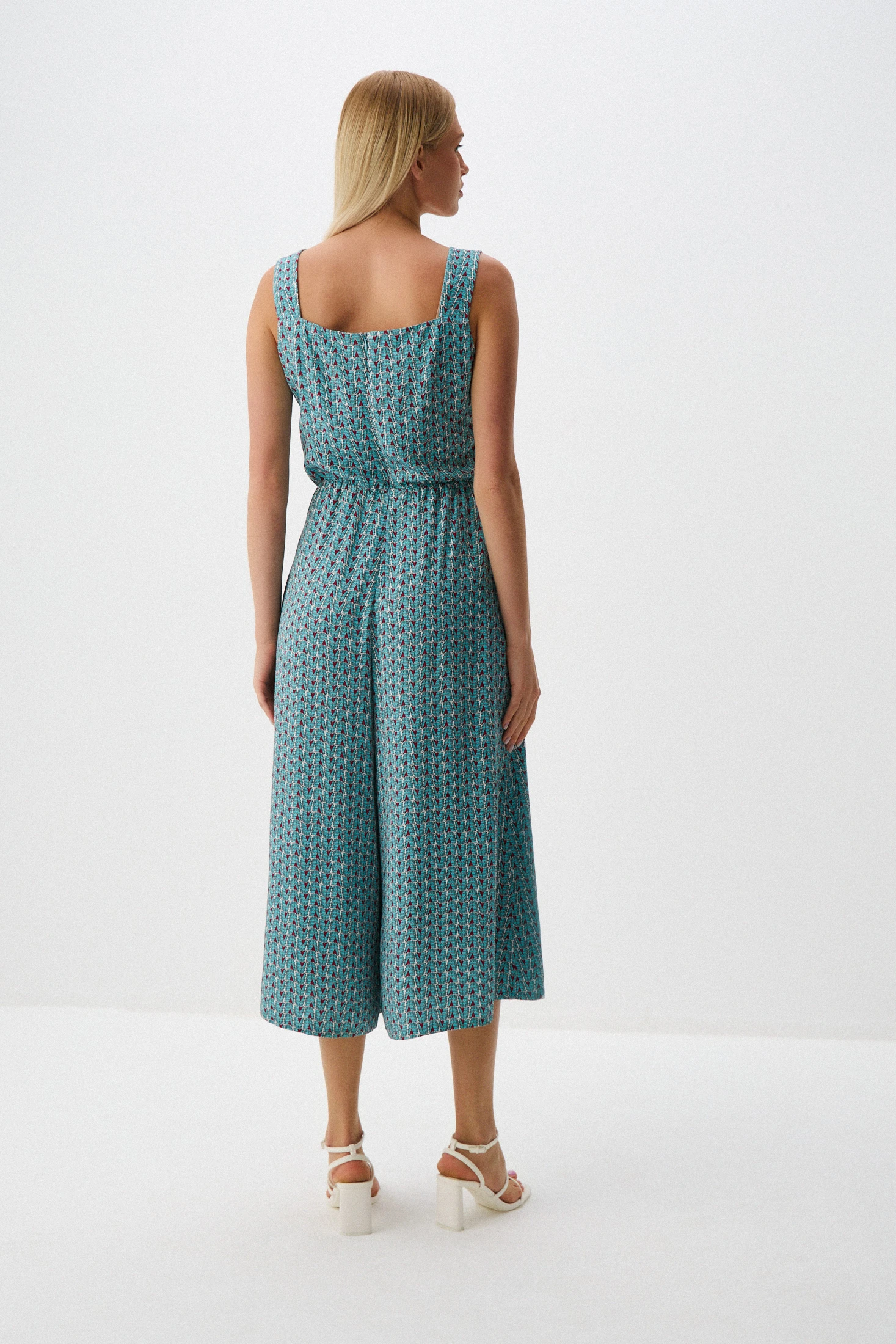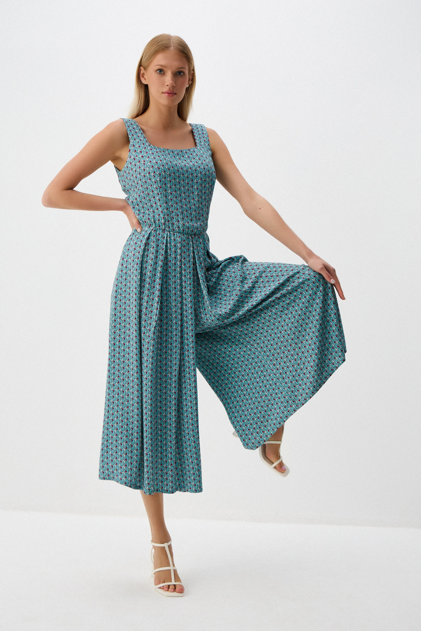 Комбинезон – современная, удобная, комфортная и яркая модель. В модели предусмотрено всё для Вашего удобства: широкие бретели, рельефы для комфортного прилегания, брюки-кюлоты с карманами. Тактильно приятная вискоза гигроскопична и воздухопроницаема. Абстрактный паттерн в бирюзовых и гранатовых оттенках создаёт летнее настроение.