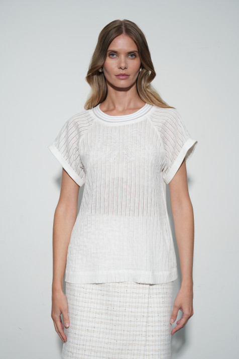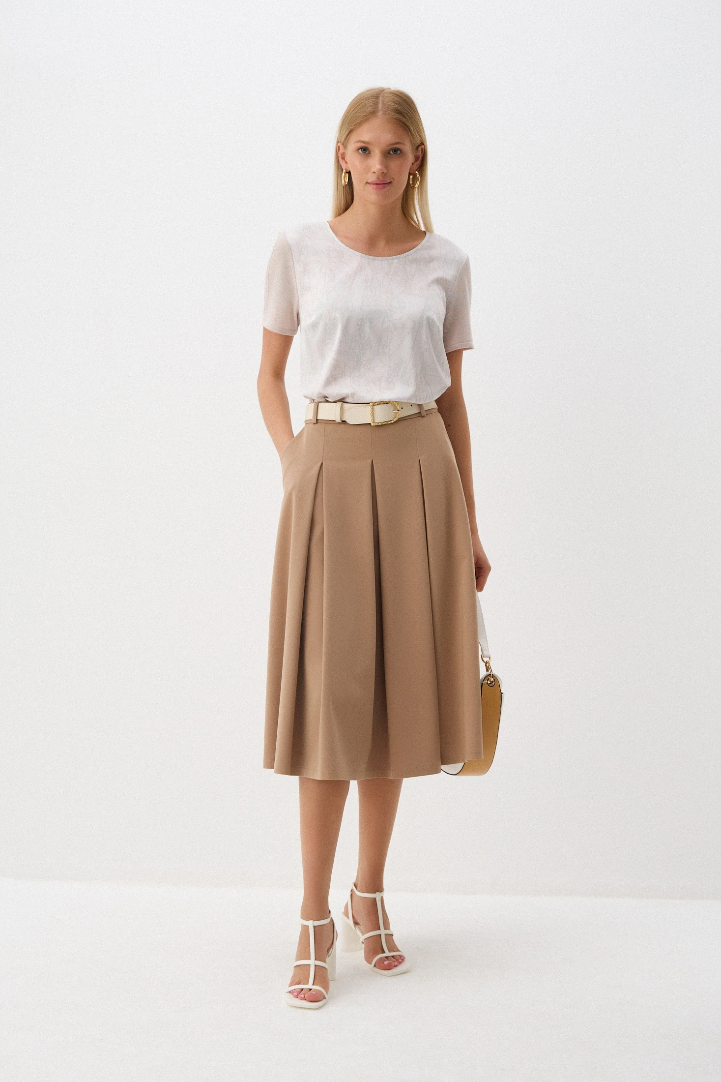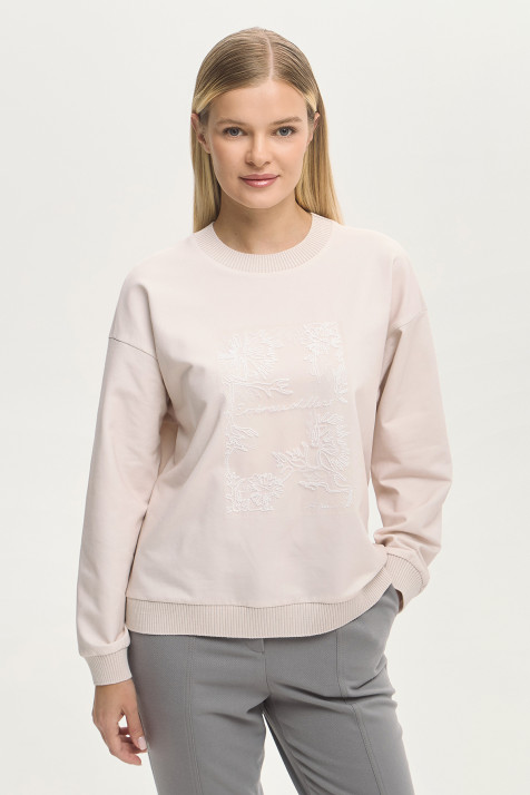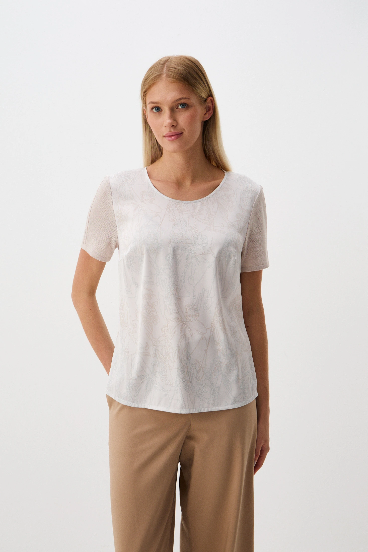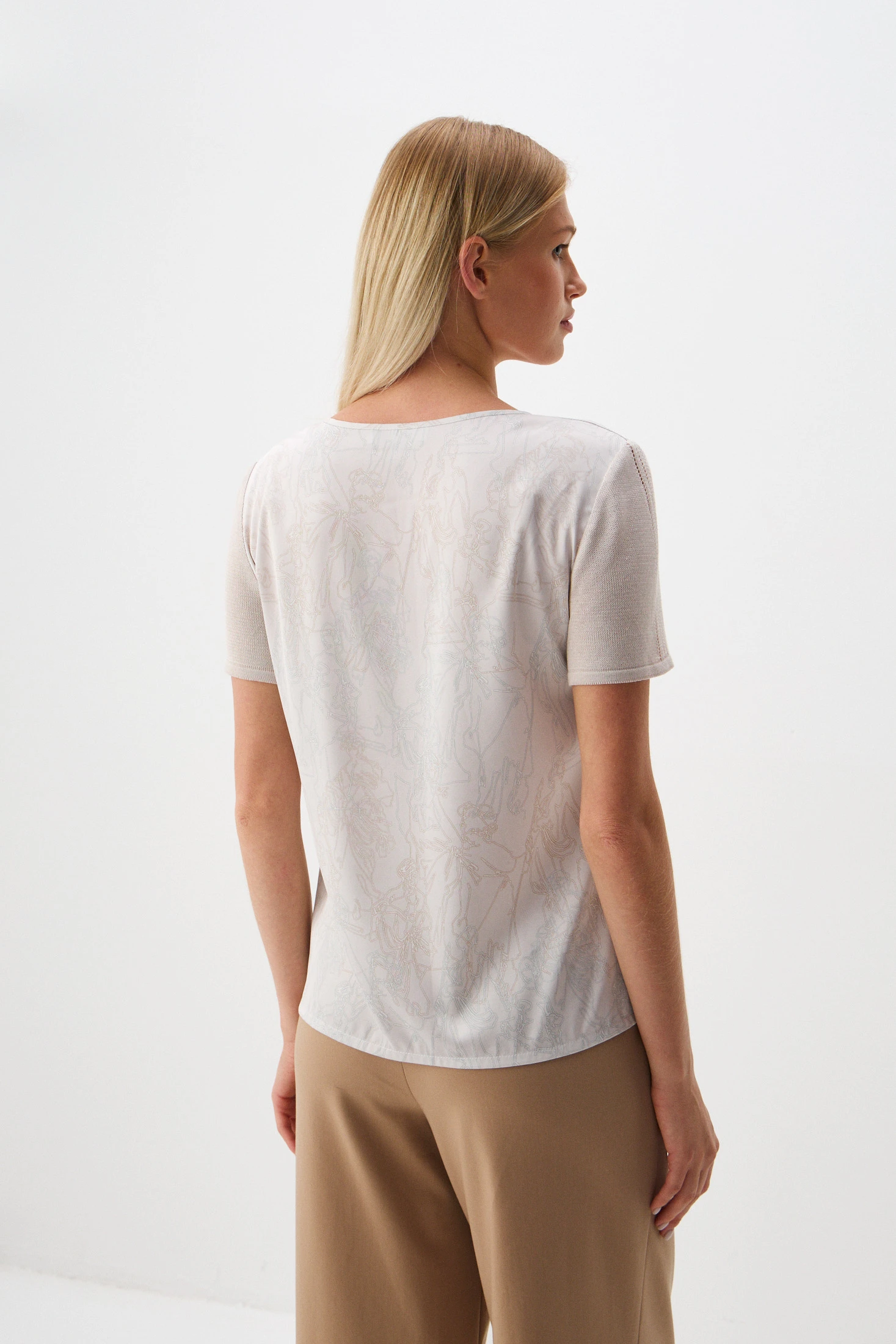 Джемпер выполнен в сочетании двух материалов: стан – атласная ткань с авторским принтом, рукава – вязаный трикотаж на основе вискозы. Оба материала филигранно подобраны друг к другу в пудровом оттенке. По центру рукавов – ажурная вязка, деликатно имитирующая лампасы. Джемпер станет прекрасным решением для Вашего повседневного образа, придавая ему изысканность и легкость. Комбинируйте его с джинсами для расслабленного настроения или со стильными брюками для более формального образа.