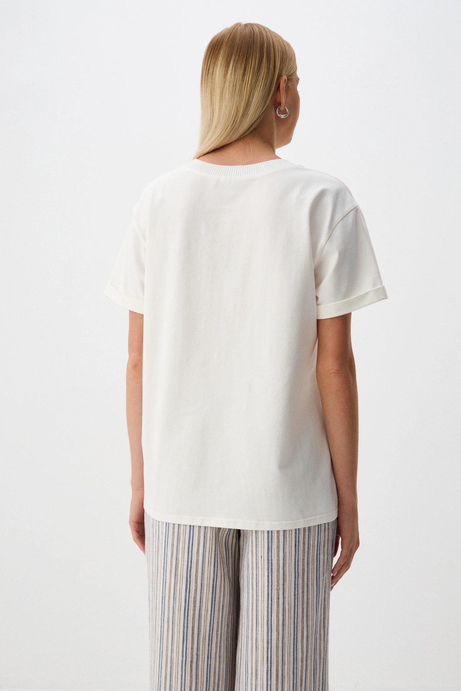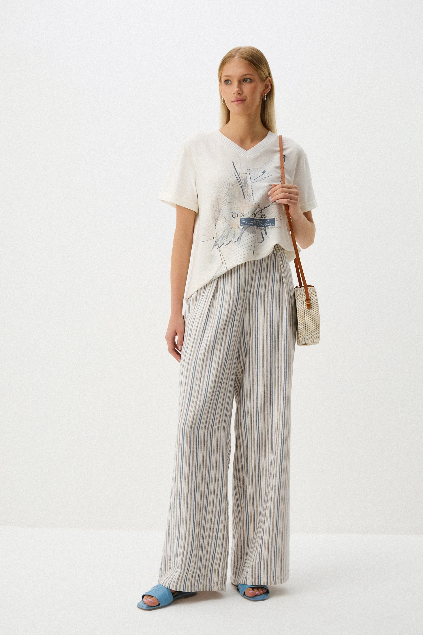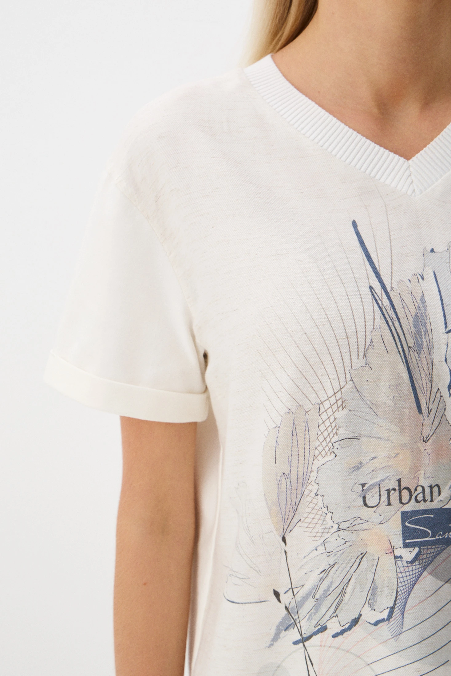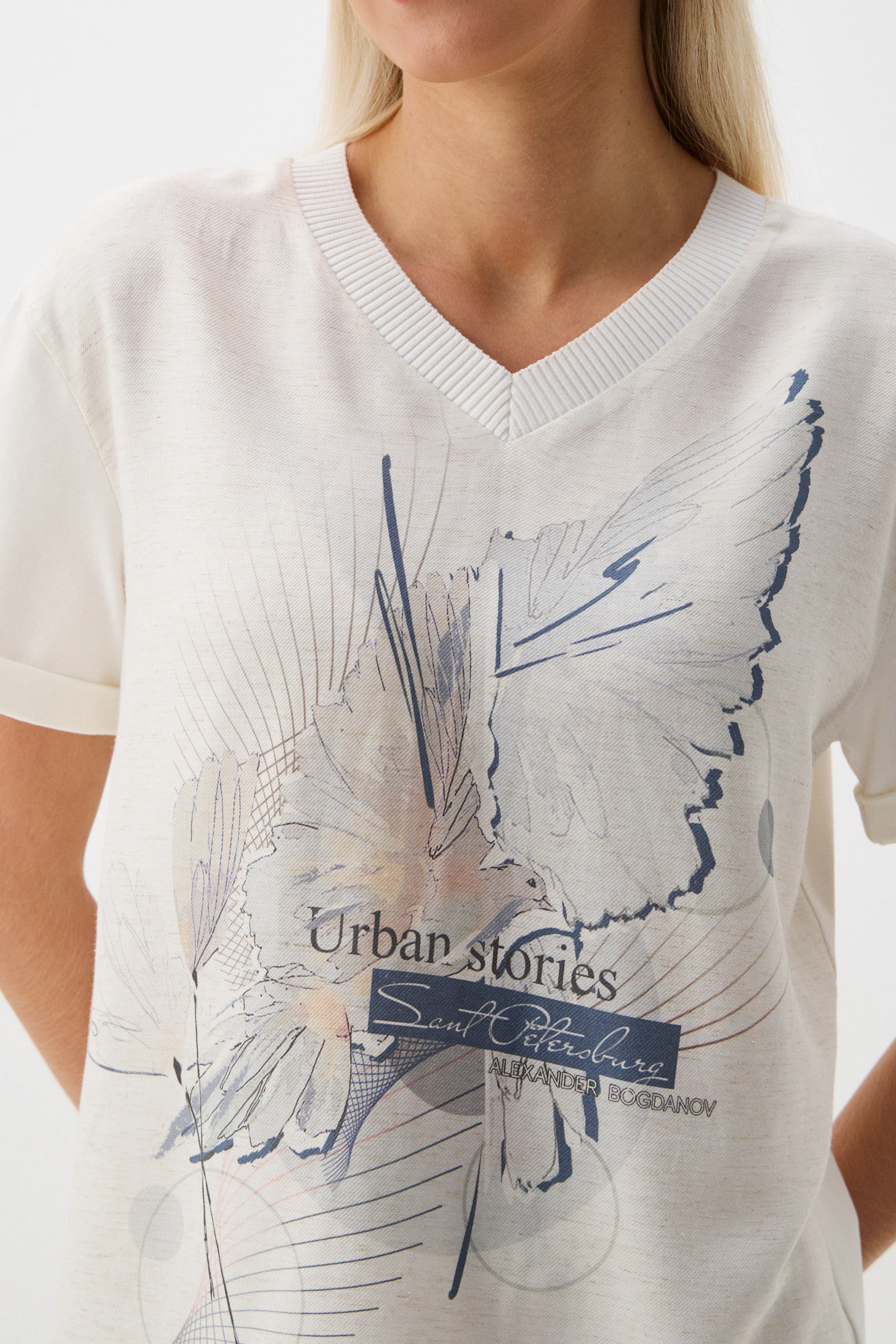 Джемпер-футболка свободного кроя – удобная и функциональная модель: лаконичный крой, нейтральные цвета и тактильно приятная ткань. Джемпер сочетает в себе два материала: перед – из фактурной смесовой ткани с авторским принтом на фоне натурального льняного оттенка; спинка и рукава – комфортный и эластичный трикотаж Пенье в молочном оттенке. Свободный крой комфортен в носке, а V-образный вырез создает женственный и элегантный вид, подчеркивая линию шеи и делая образ более открытым.