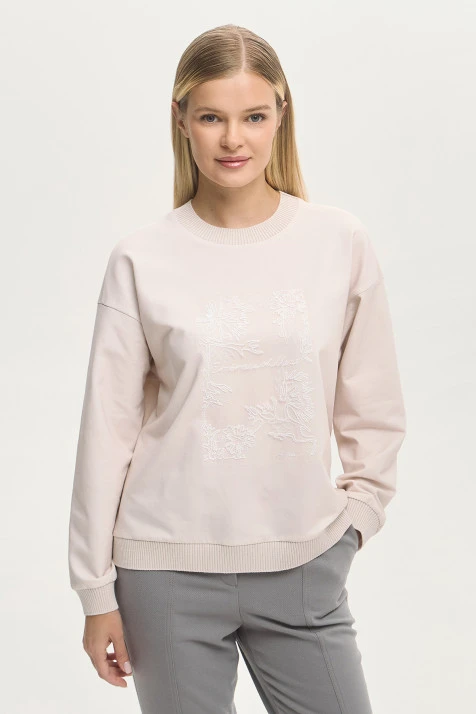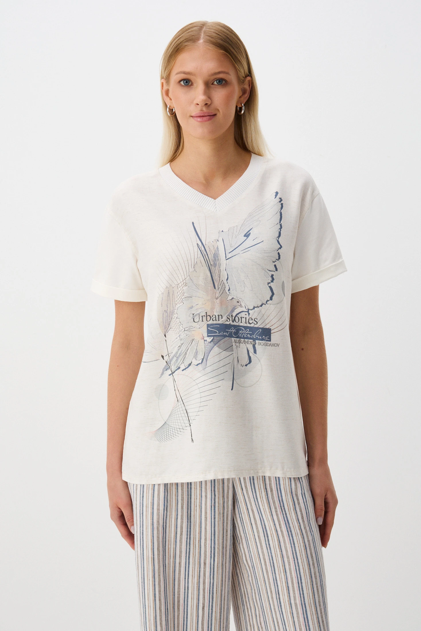 Джемпер-футболка свободного кроя – удобная и функциональная модель: лаконичный крой, нейтральные цвета и тактильно приятная ткань. Джемпер сочетает в себе два материала: перед – из фактурной смесовой ткани с авторским принтом на фоне натурального льняного оттенка; спинка и рукава – комфортный и эластичный трикотаж Пенье в молочном оттенке. Свободный крой комфортен в носке, а V-образный вырез создает женственный и элегантный вид, подчеркивая линию шеи и делая образ более открытым.