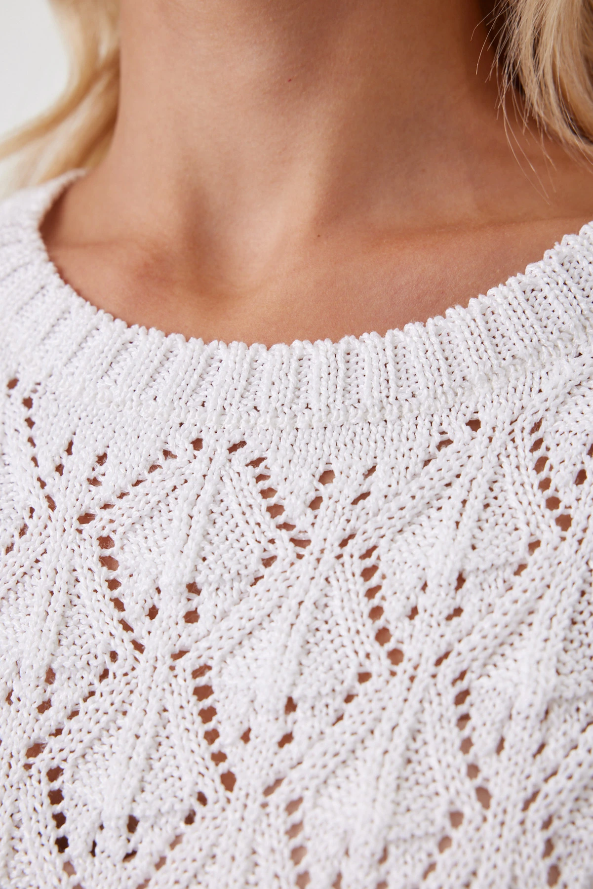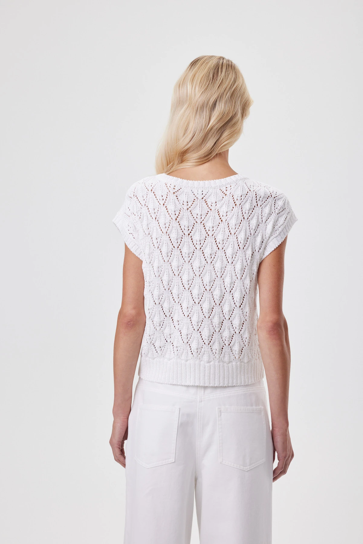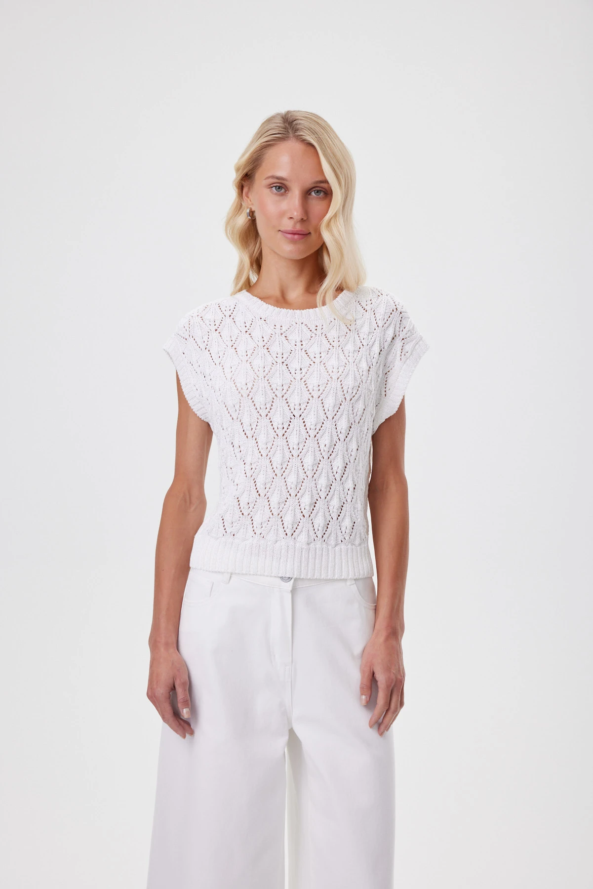 Объёмный джемпер с выразительным узором «ромб» — современная интерпретация ручной вязки: крупные петли, лёгкий винтажный характер и воздушная структура, которая создаёт комфортный микроклимат и при этом держит форму. Чистый белоснежный оттенок подчёркивает рельеф переплетения, освежает лицо и легко вписывается в летние сочетания. Расслабленная посадка со спущенной линией плеча формирует мягкий силуэт, а широкие бейки по горловине и проймам задают аккуратную, качественную рамку. Хлопок и вискоза приятны к телу, помогают полотну не растягиваться и не терять рисунок — джемпер остаётся воздухопроницаемым и комфортным даже в тёплый сезон.