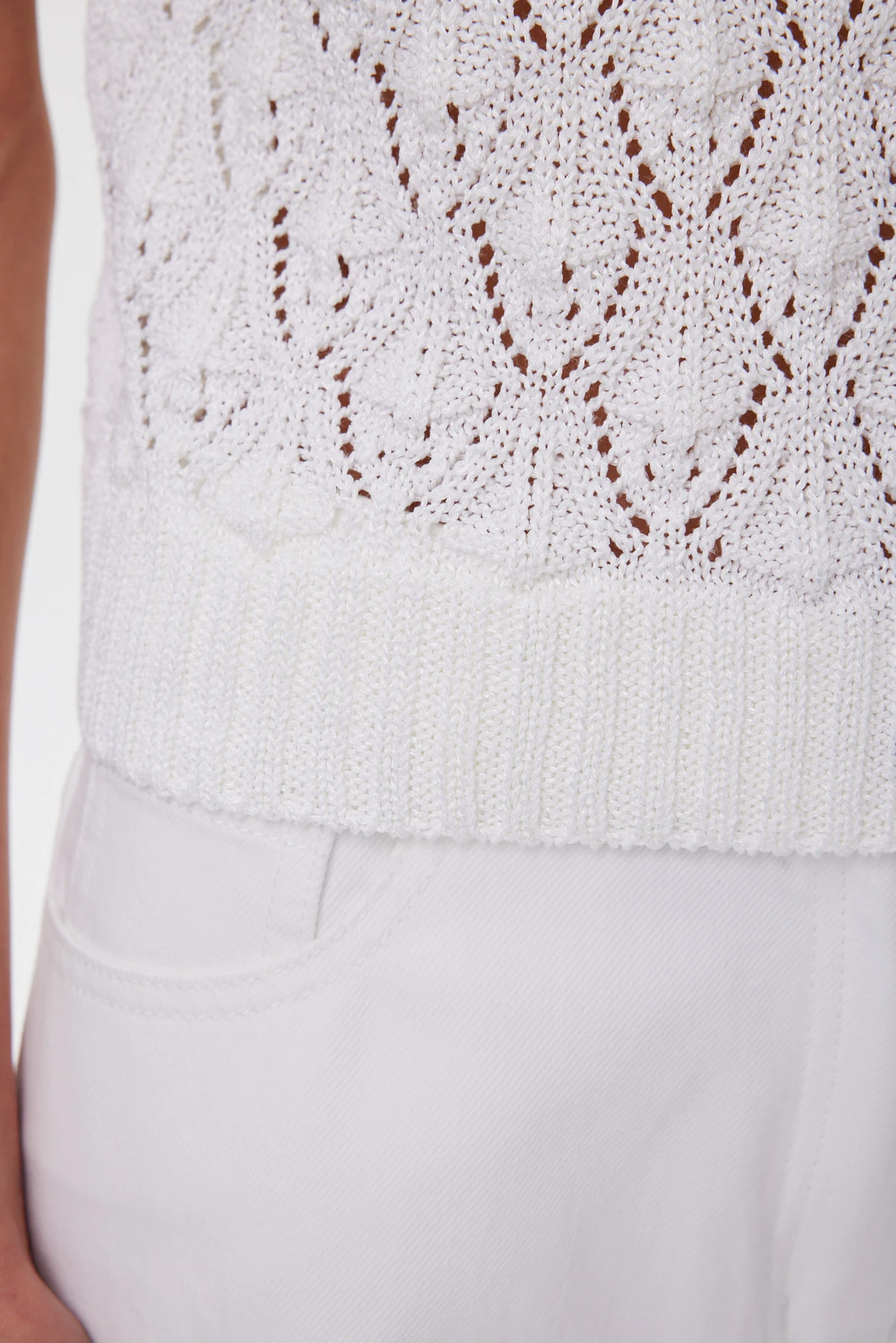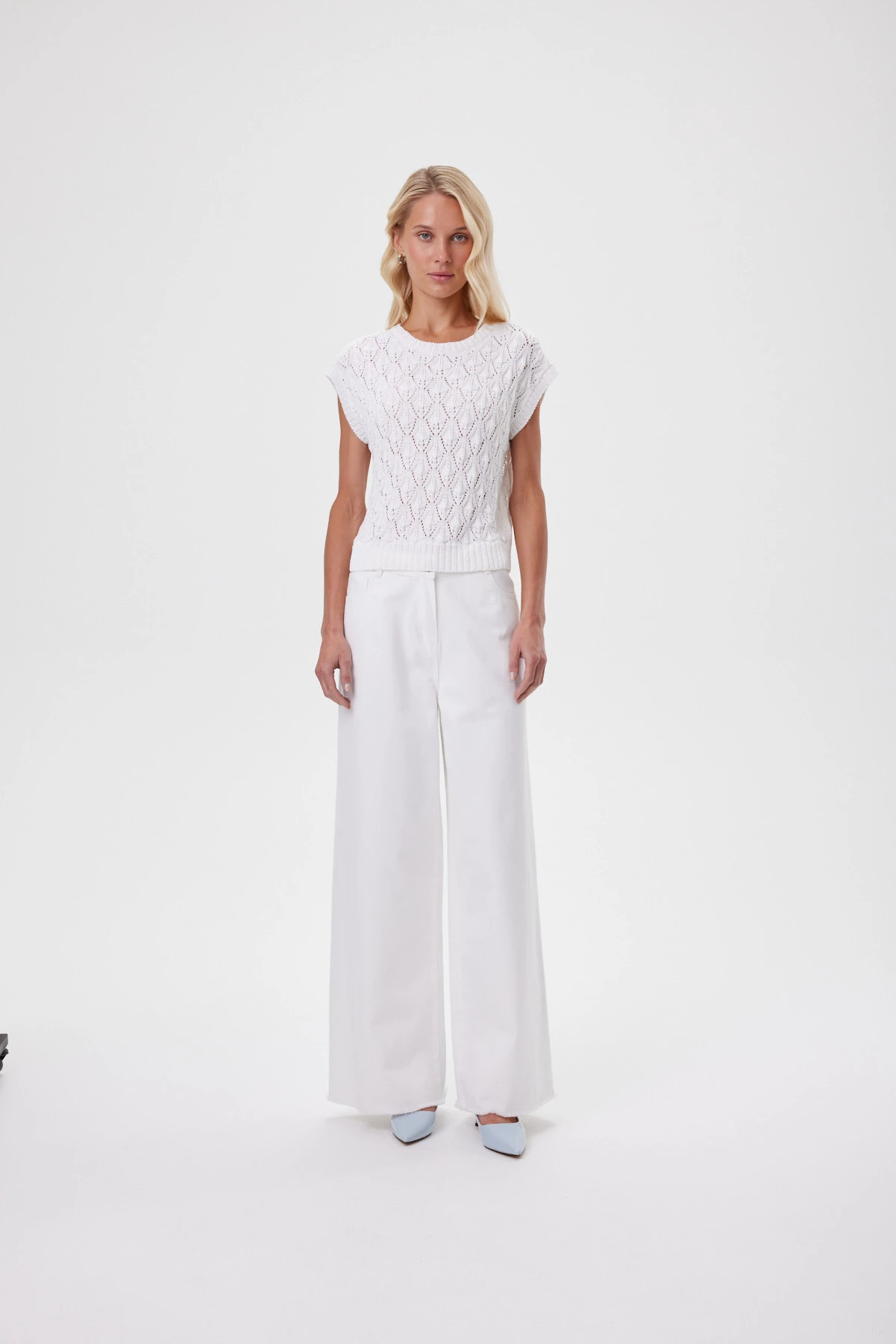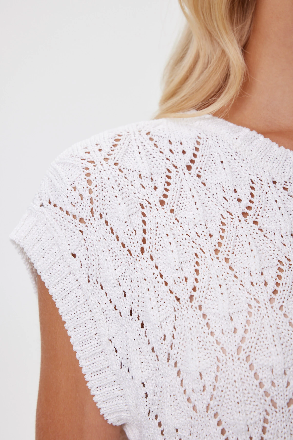 Объёмный джемпер с выразительным узором «ромб» — современная интерпретация ручной вязки: крупные петли, лёгкий винтажный характер и воздушная структура, которая создаёт комфортный микроклимат и при этом держит форму. Чистый белоснежный оттенок подчёркивает рельеф переплетения, освежает лицо и легко вписывается в летние сочетания. Расслабленная посадка со спущенной линией плеча формирует мягкий силуэт, а широкие бейки по горловине и проймам задают аккуратную, качественную рамку. Хлопок и вискоза приятны к телу, помогают полотну не растягиваться и не терять рисунок — джемпер остаётся воздухопроницаемым и комфортным даже в тёплый сезон.