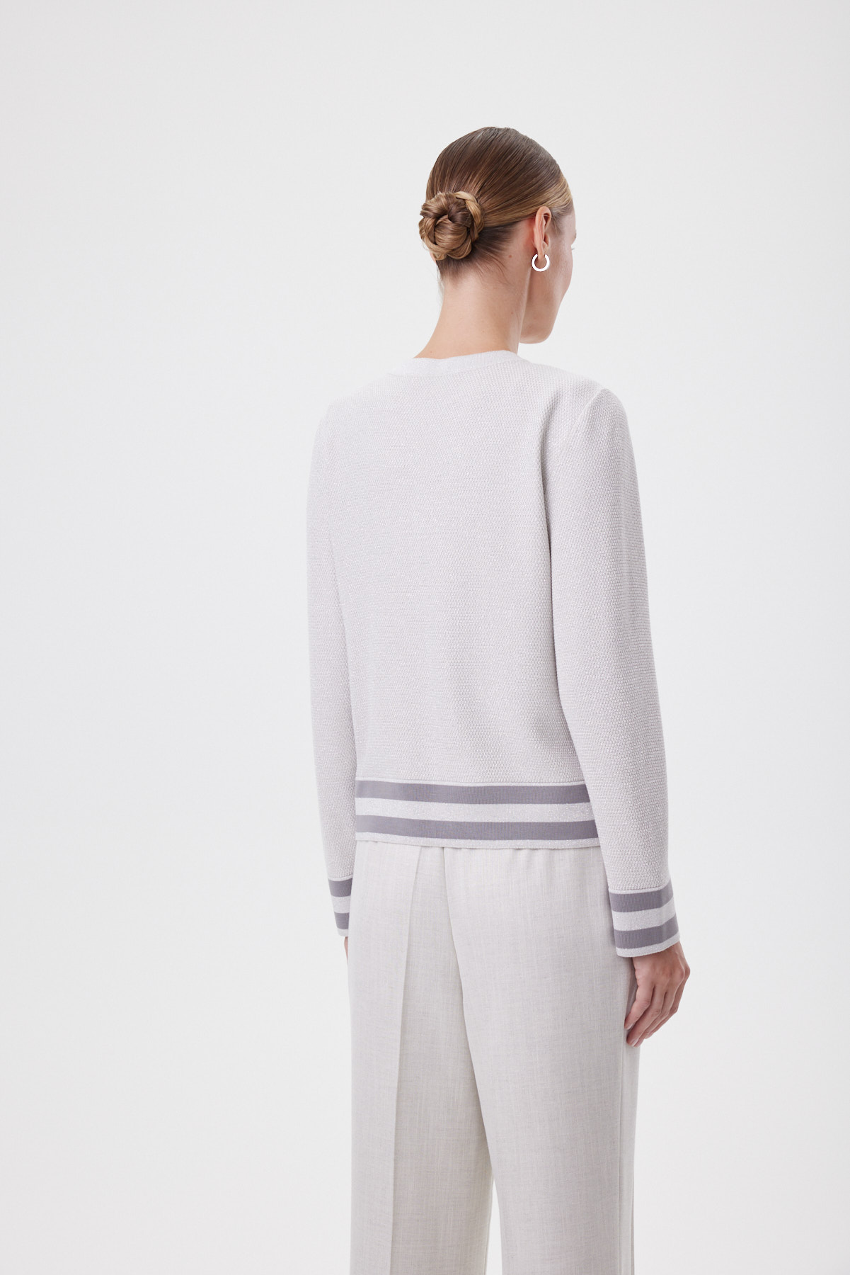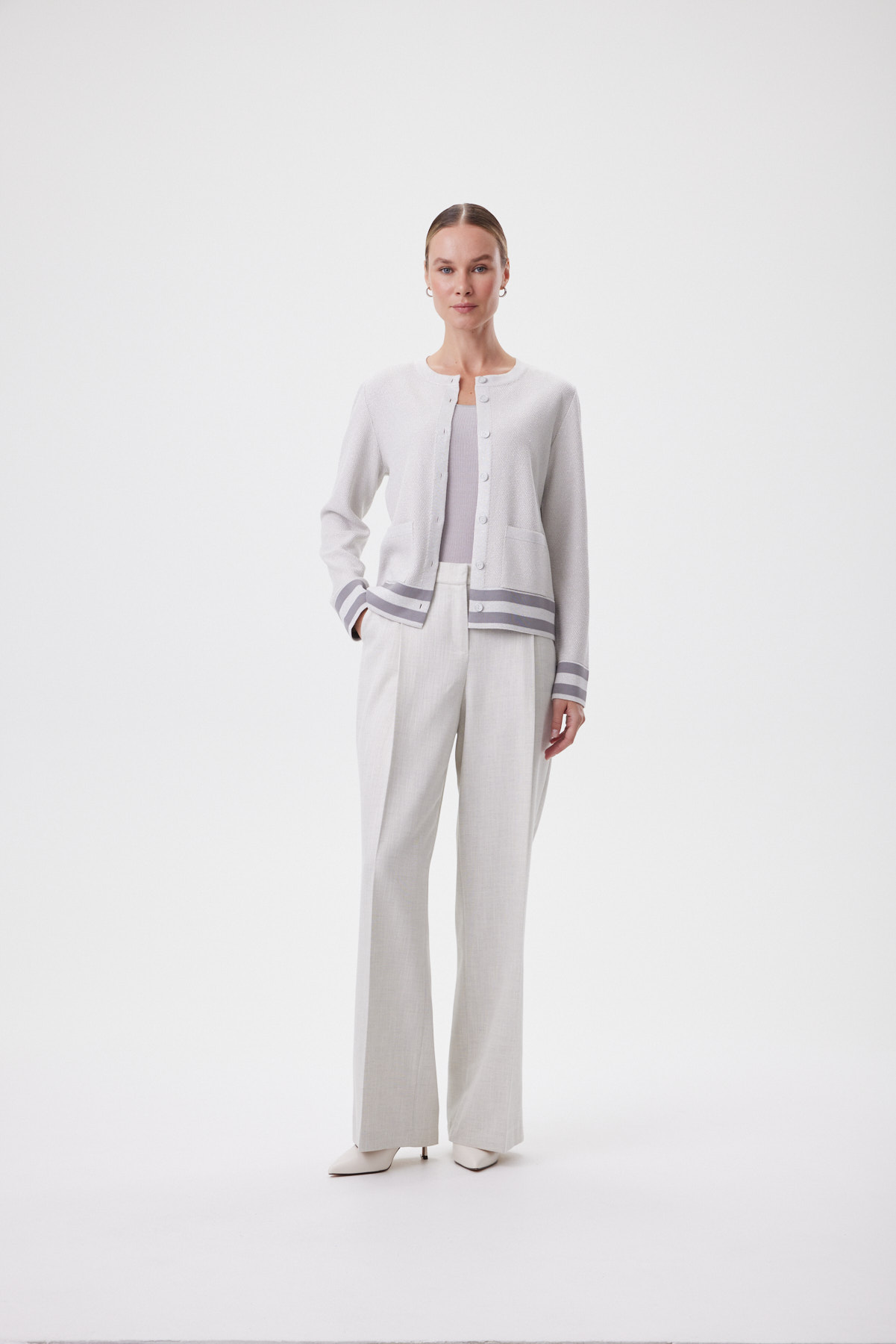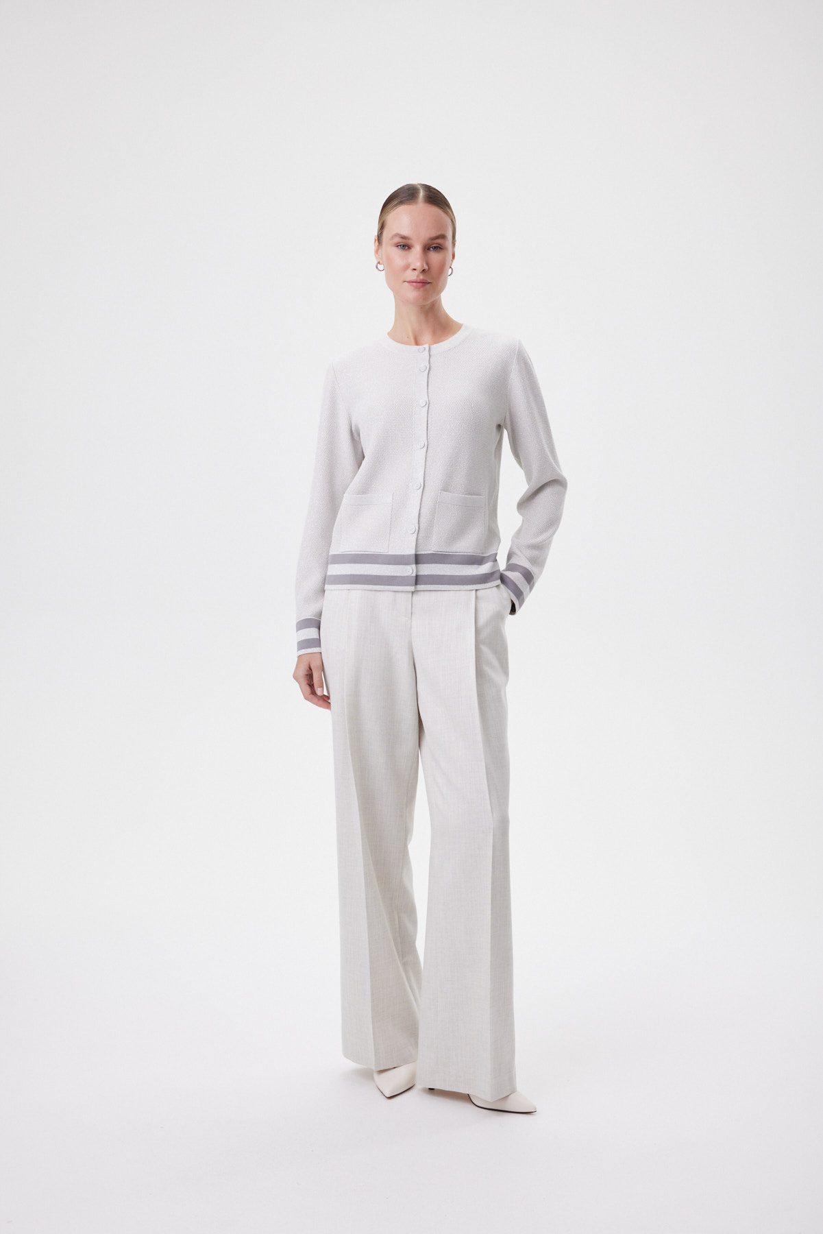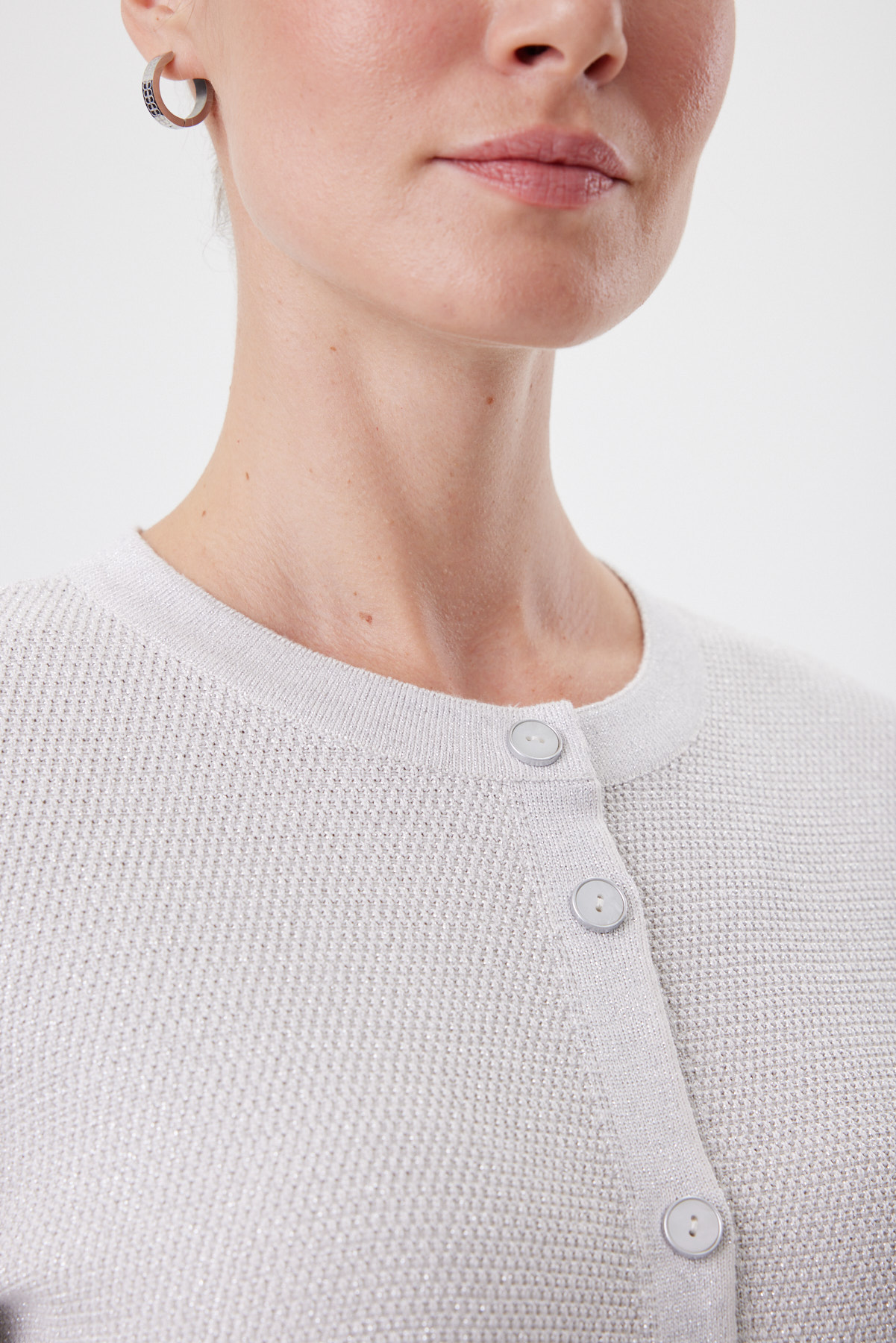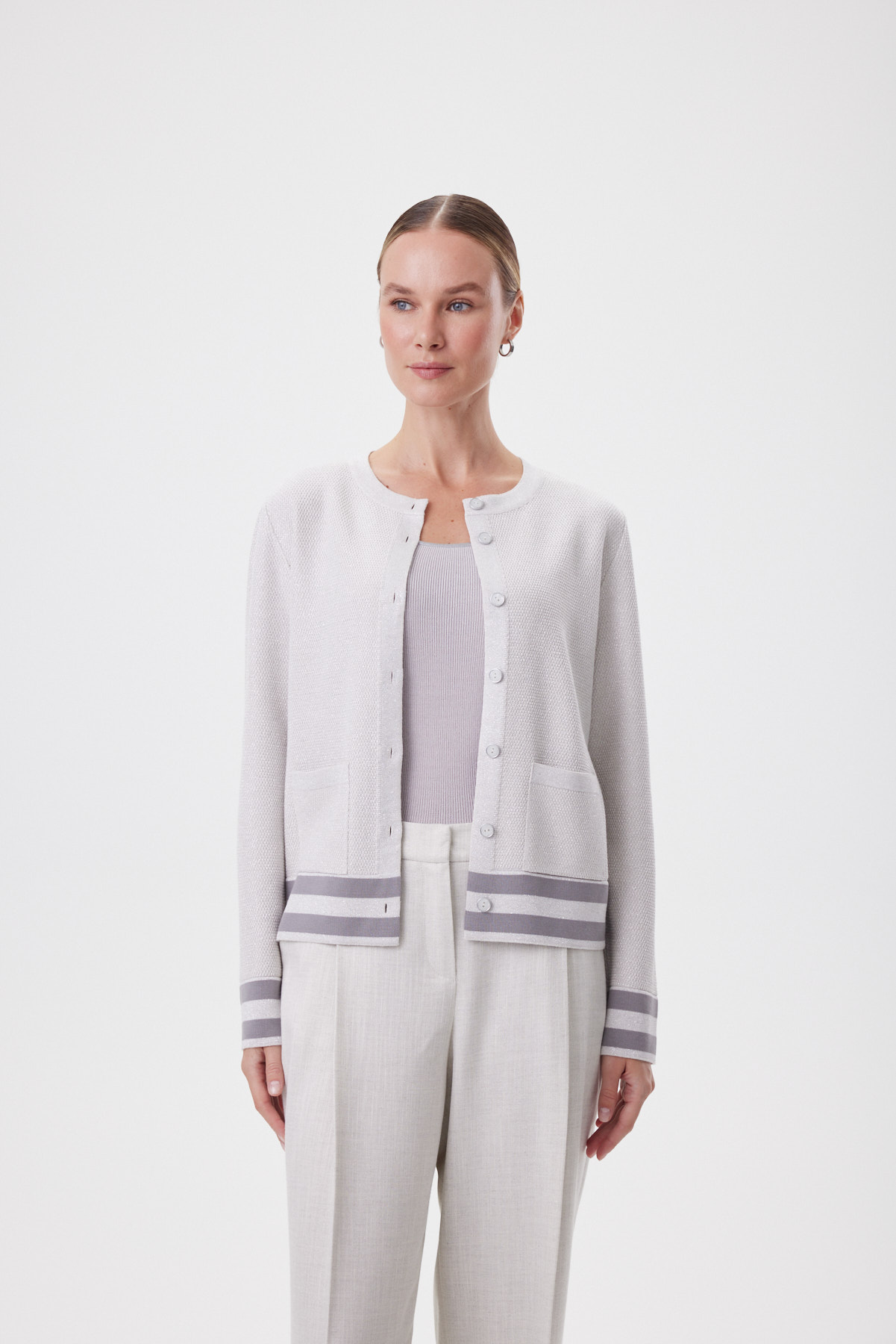 Джемпер связан как цельное полотно — это премиальный уровень создания изделий, требующий высокой точности. За счёт этого посадка выглядит особенно чисто, а линия силуэта — изящной и пластичной. Прямой крой подходит на разные фигуры. Мелкое букле создаёт эффект «жемчужной» фактуры — ткань плотная, мягкая и держит форму, поэтому кардиган комфортен и в офисе, и в прохладный летний вечер. Контрастные полосы по низу и манжетам с метанитом дают деликатный блеск в движении, а пуговицы с серебристой окантовкой собирают образ как ювелирный штрих. Носите с прямыми брюками и лоферами для классики, с денимом для современного casual или поверх платья — чтобы добавить фактуру и статусности без перегруза.