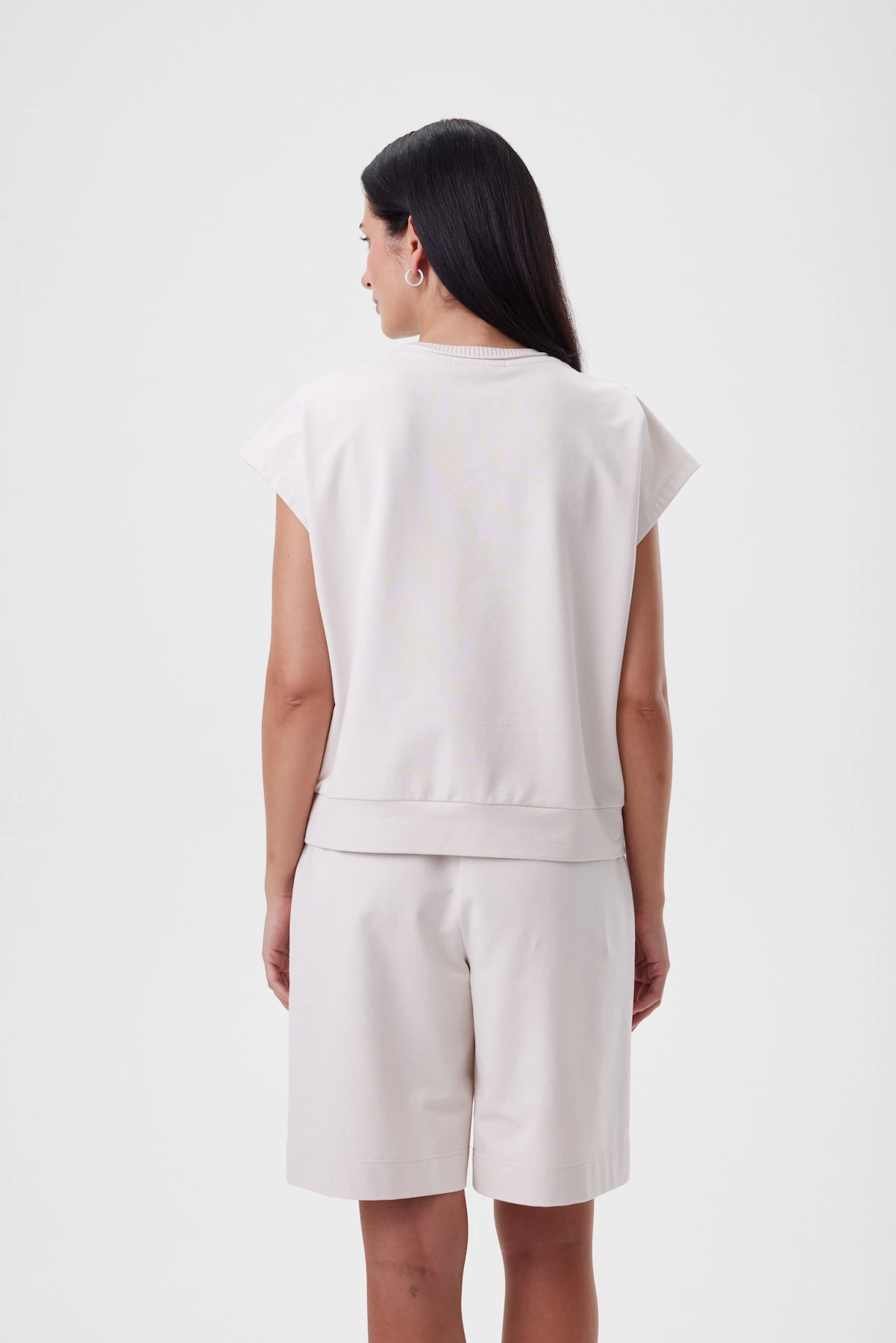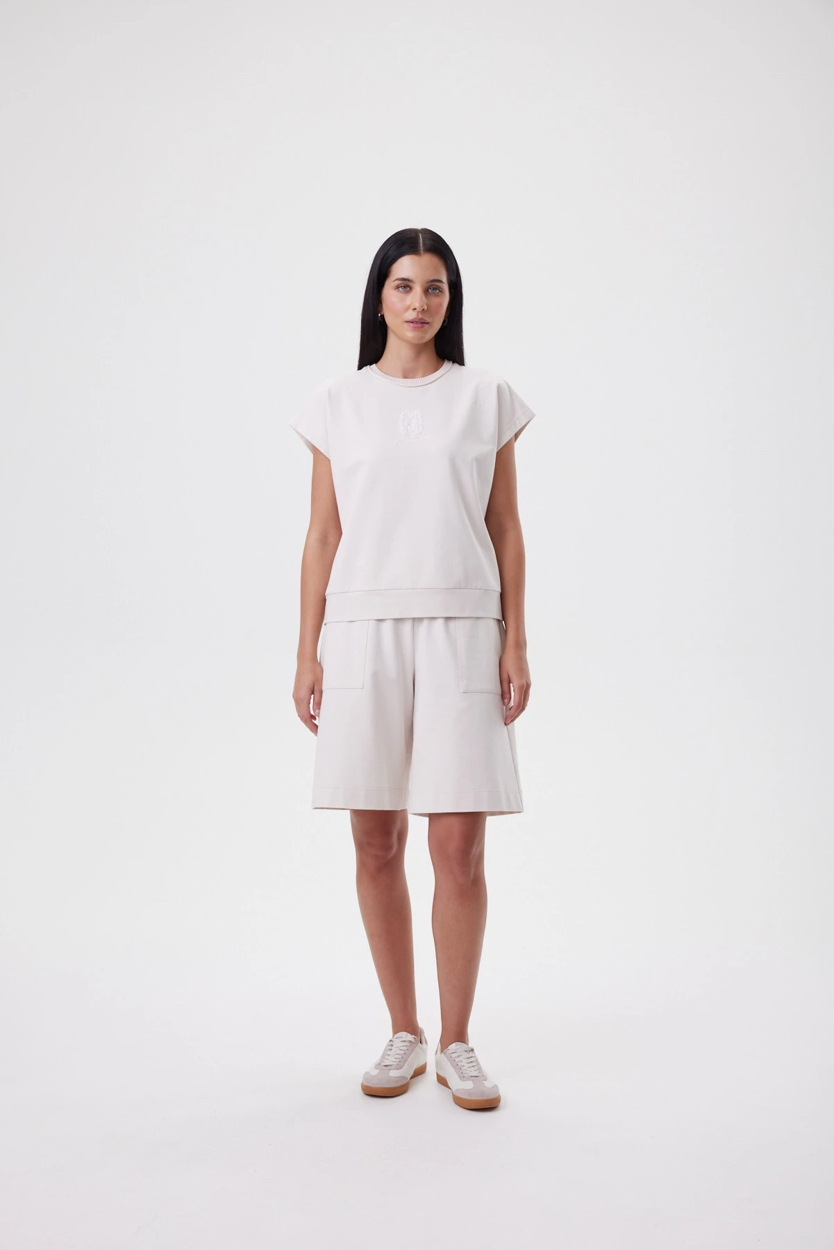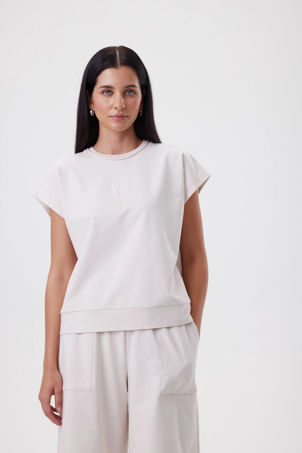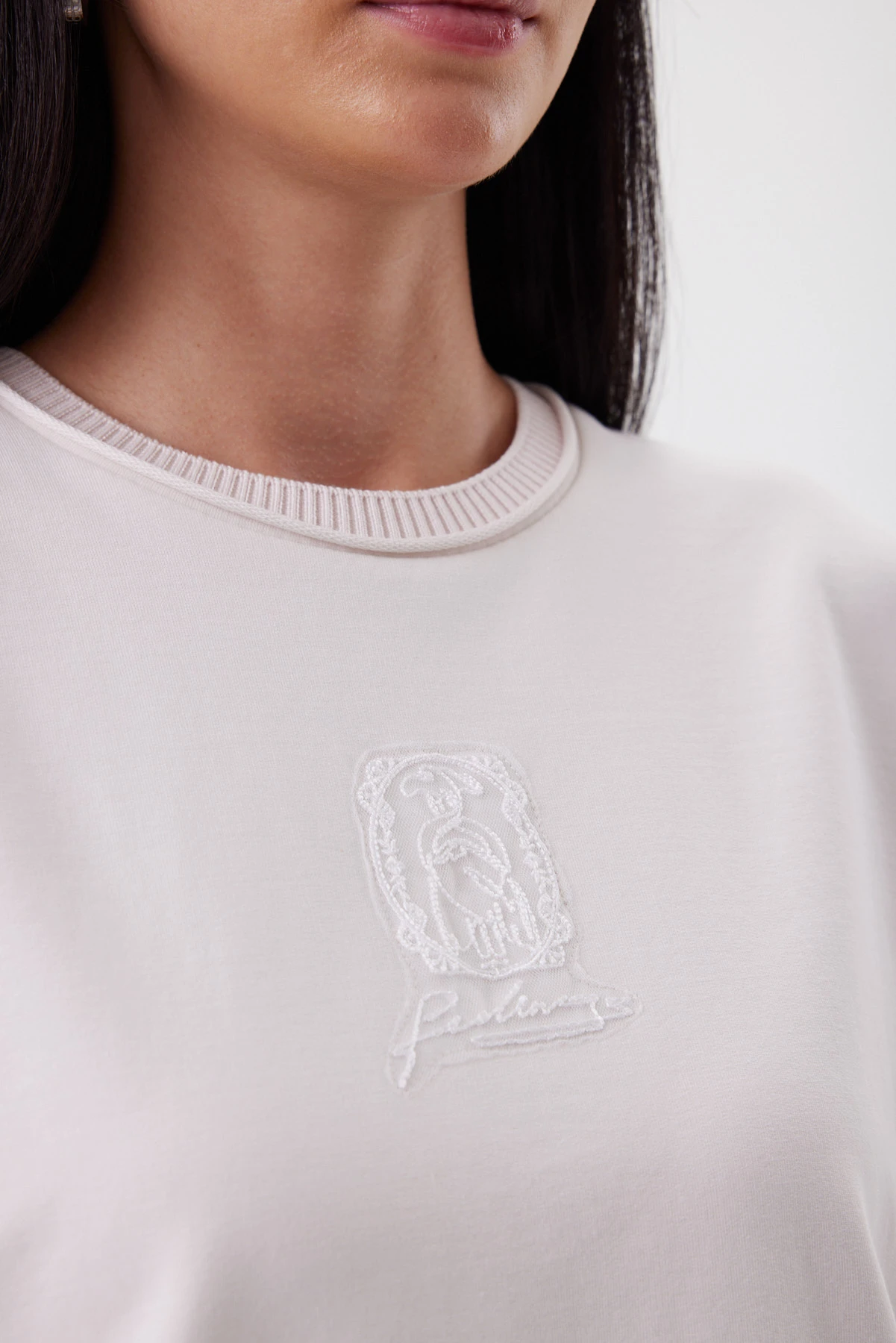 Джемпер в оттенке «миндальная пудра» даёт спокойный объём: свободная посадка аккуратно огибает фигуру, а мягкая линия плеча деликатно прикрывает руку. Для бренда важна тактильность, потому поверхность изделия гладкая, матовая, премиальная на ощупь — это тот тип материала, который одинаково хорошо работает и в спортивных образах, и в городских. Горловина с валиком и фирменной бейкой выглядит как тонкая рамка, а аппликация на сетке с фламинго — тот самый тихий знак, который добавляет характер и уникальность модели. Джемпер легко заменяет базовую футболку: с прямыми брюками или юбкой даёт мягкую собранность, с денимом — лёгкий smart casual.