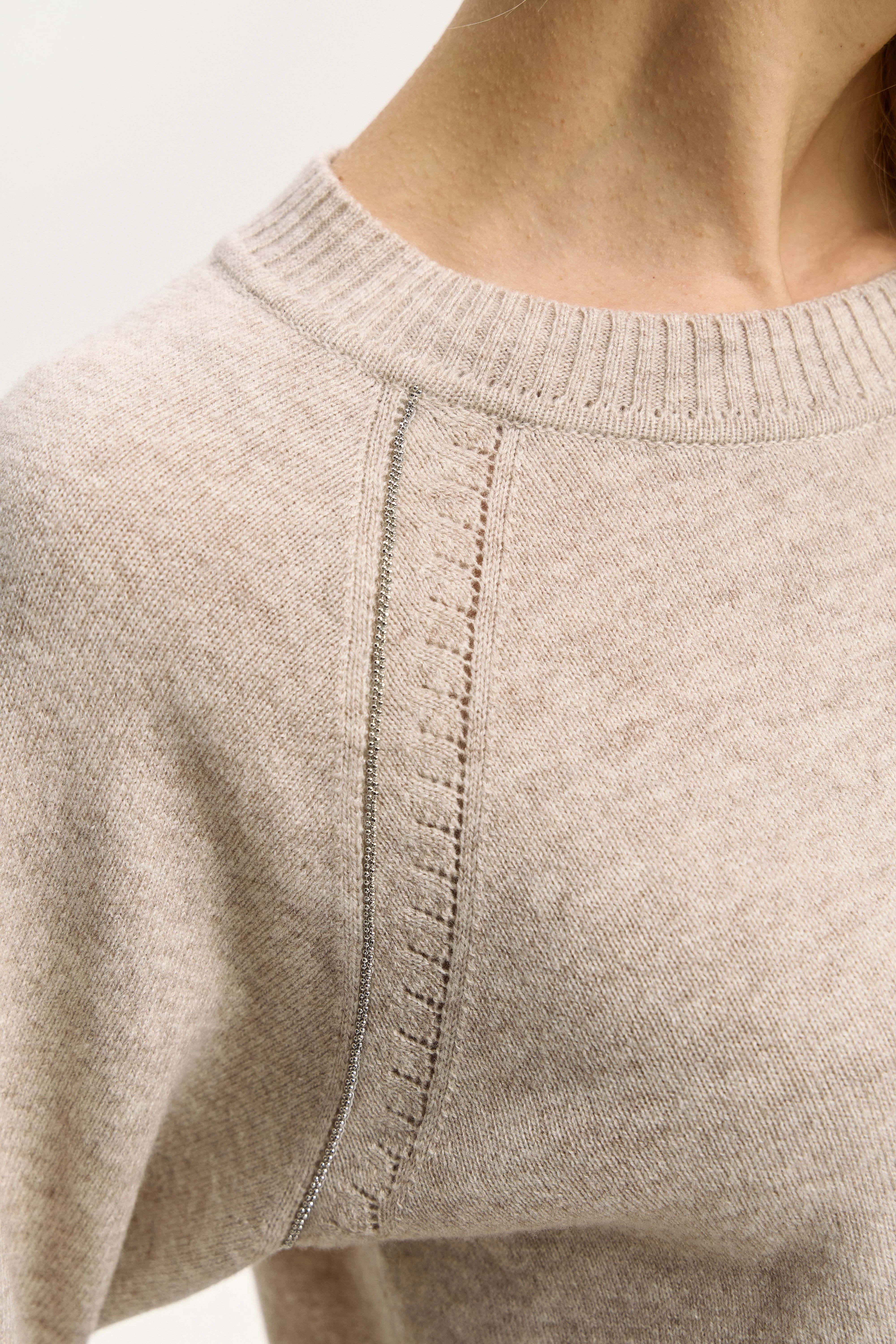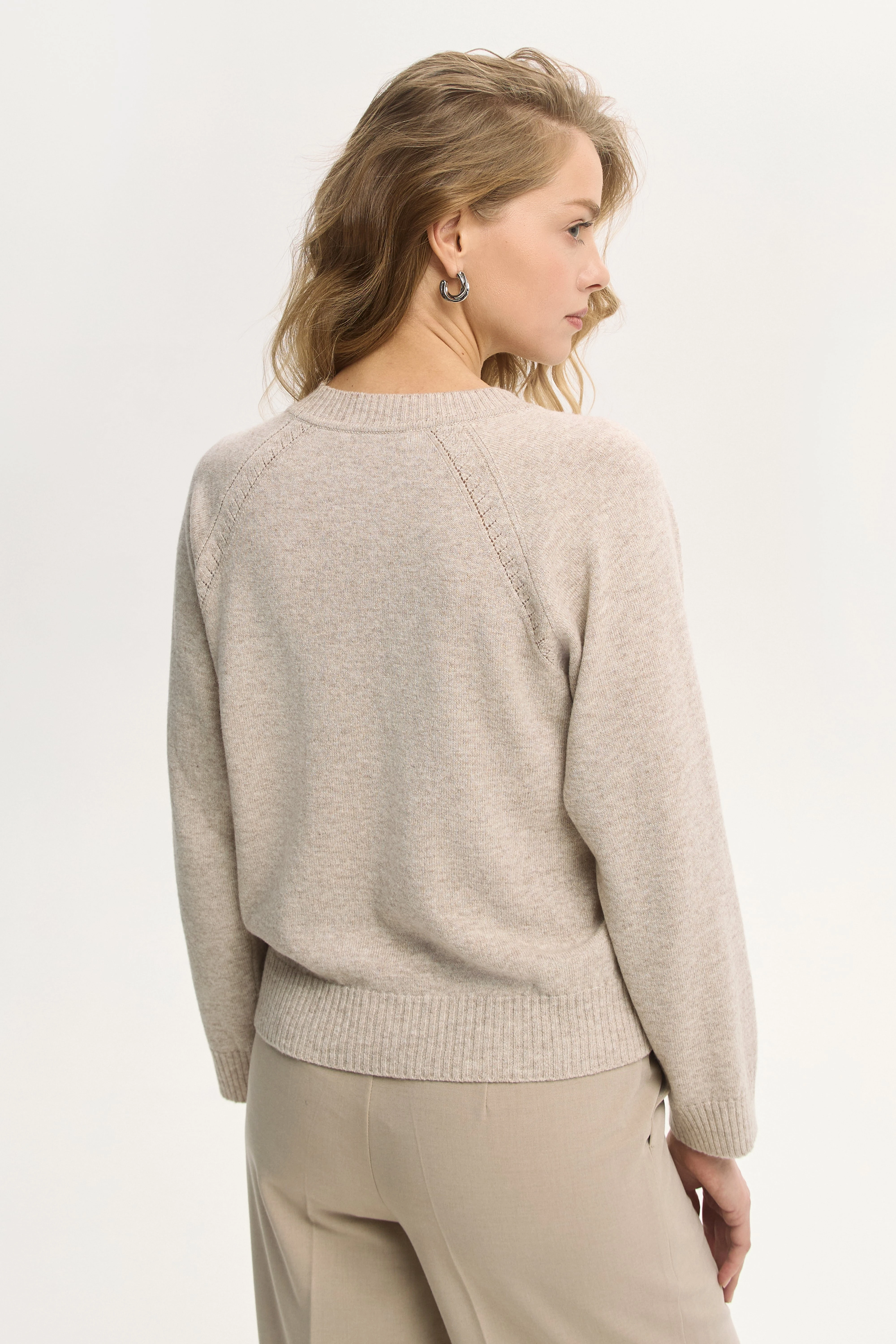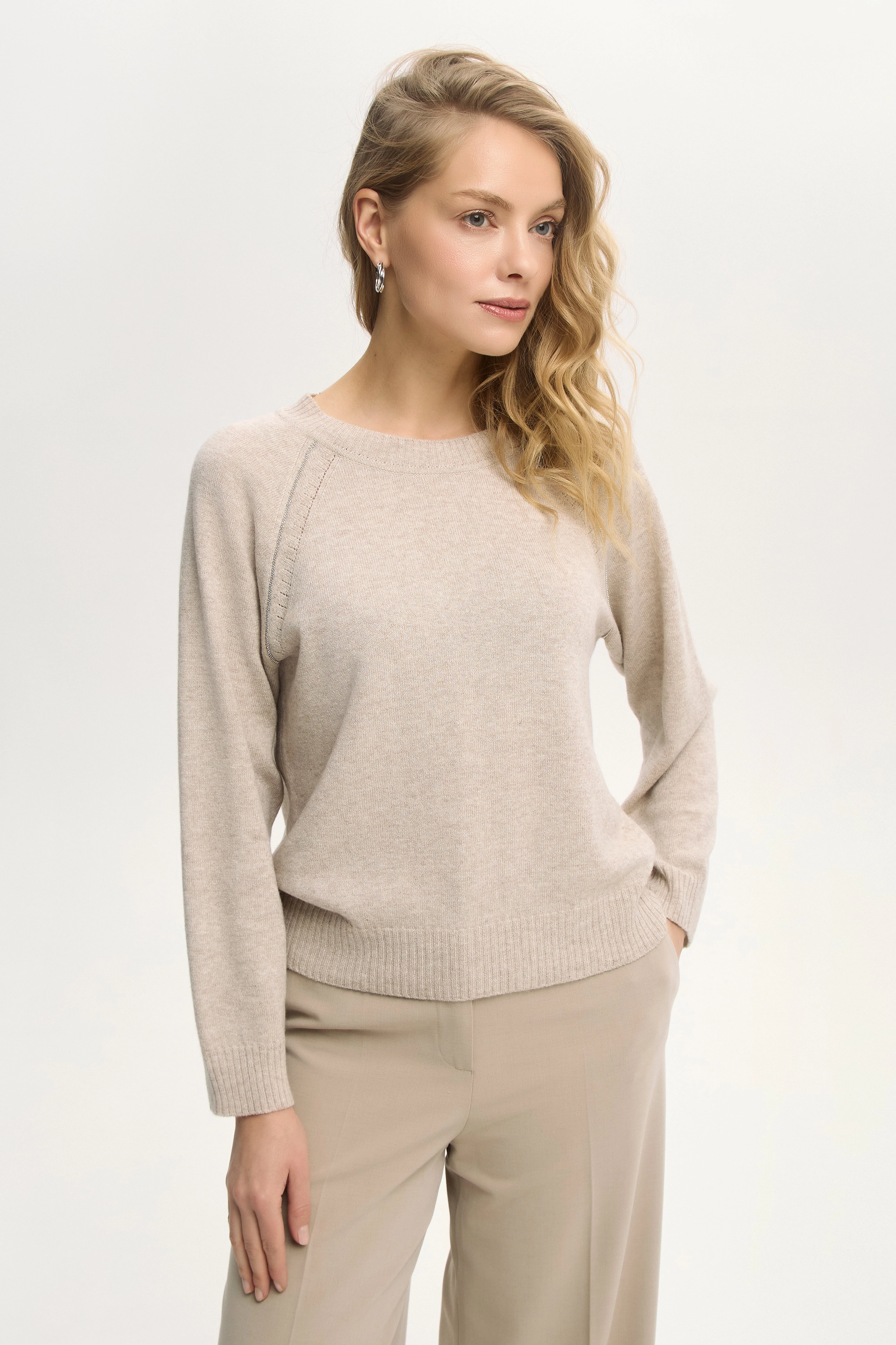Прямой силуэт джемпера с круглой горловиной — удобно, универсально, легко сочетается. Смесовый состав с шерстью, вискозой и кашемиром — мягкий, комфортный и приятный для тела. Натуральный песочный оттенок — базовый и актуальный в любом сезоне. Декор по линии рукава-реглан цепочкой мониль и вязаной аккуратной перфорацией добавляет изюминку базовой модели. Подходит как для многослойных образов, так и как самостоятельный элемент.
