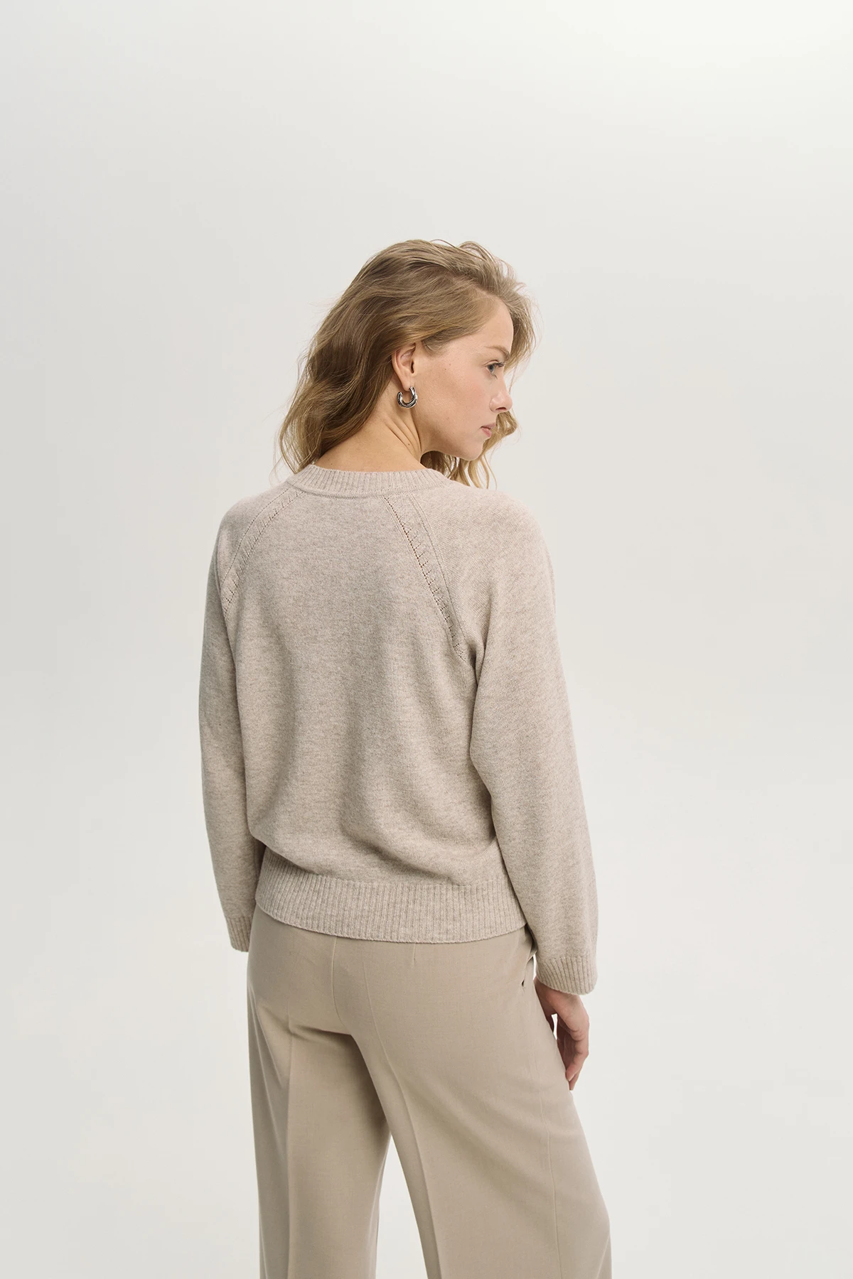 Прямой силуэт джемпера с круглой горловиной — удобно, универсально, легко сочетается. Смесовый состав с шерстью, вискозой и кашемиром — мягкий, комфортный и приятный для тела. Натуральный песочный оттенок — базовый и актуальный в любом сезоне. Декор по линии рукава-реглан цепочкой мониль и вязаной аккуратной перфорацией добавляет изюминку базовой модели. Подходит как для многослойных образов, так и как самостоятельный элемент.