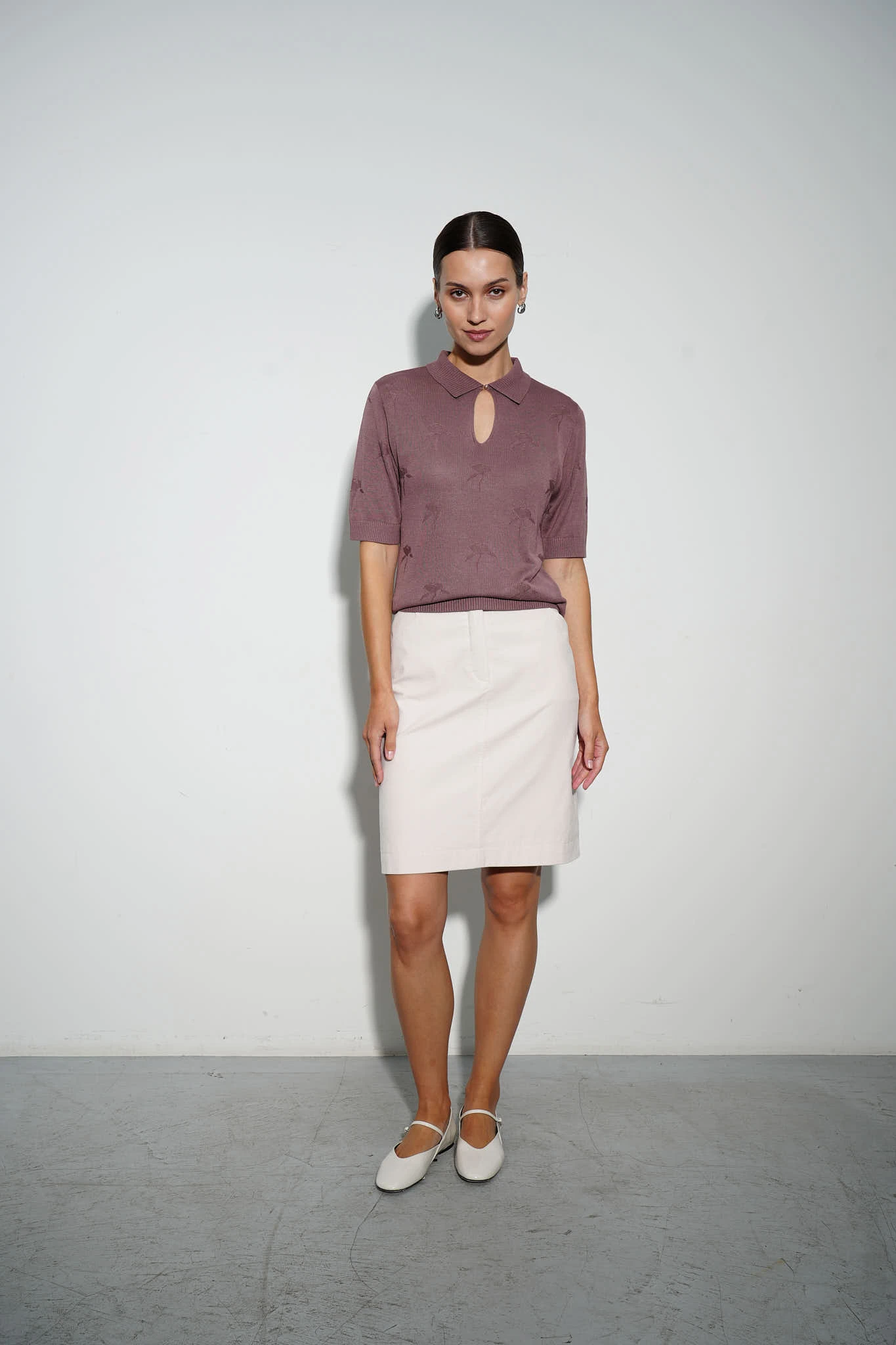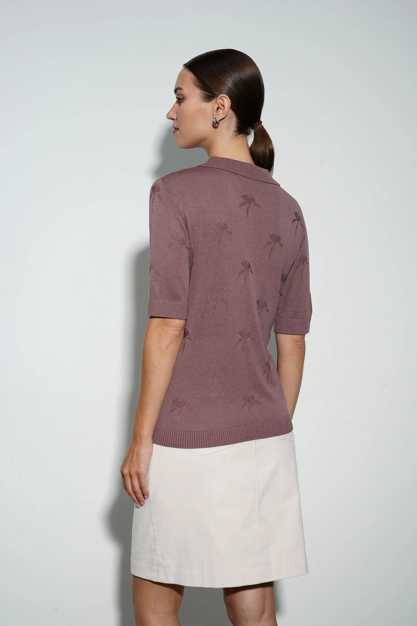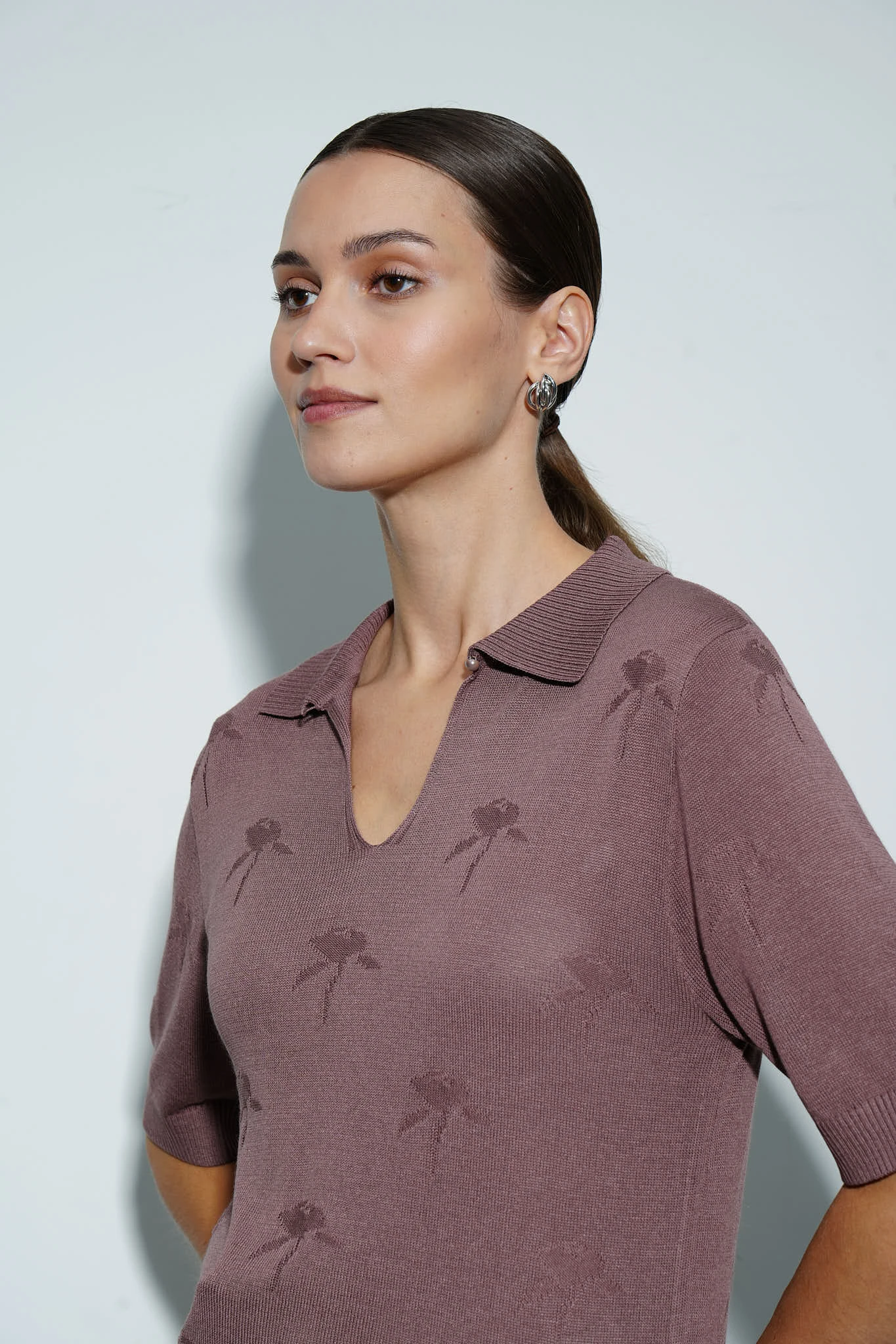Джемпер из мягкого трикотажа благородного оттенка «пралине» сочетает в себе лаконичность и женственность. Свободный крой мягко подчёркивает силуэт, обеспечивая комфортную посадку. Воротник-поло с вырезом-каплей добавляет игривую нотку, а декоративный раппорт в виде изящных пионов придаёт модели утончённость. Удобный и элегантный джемпер легко дополнит как повседневный, так и романтичный наряд.