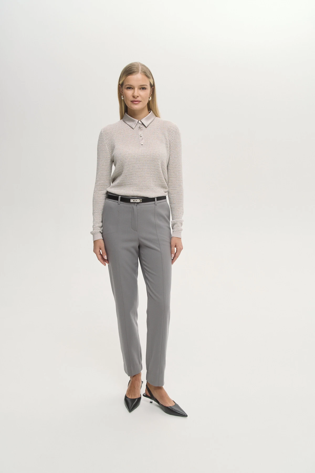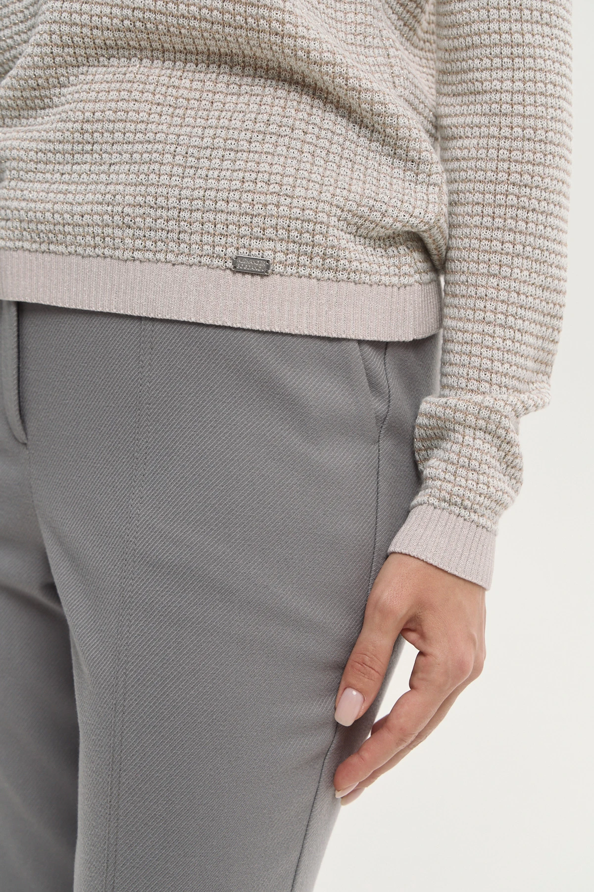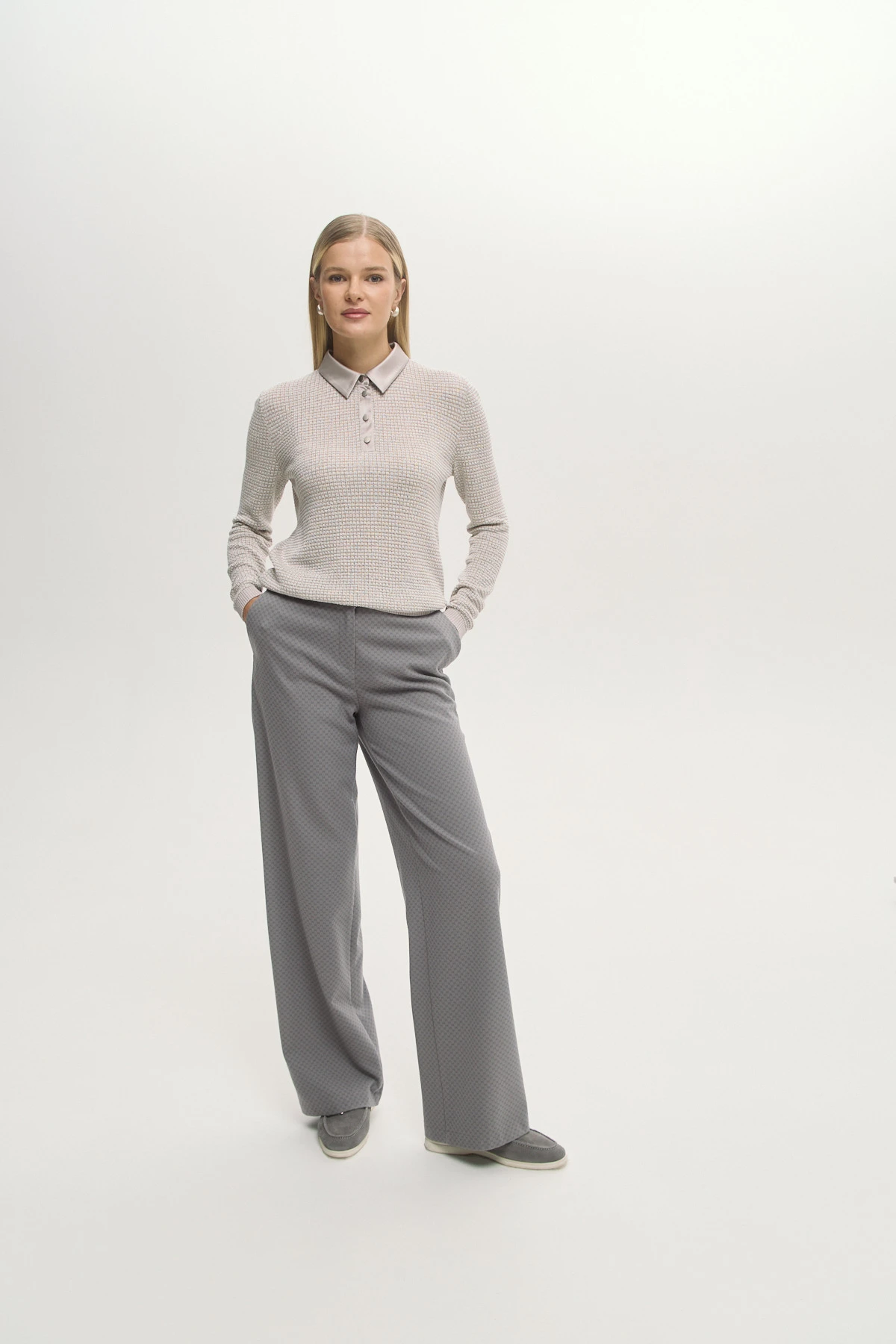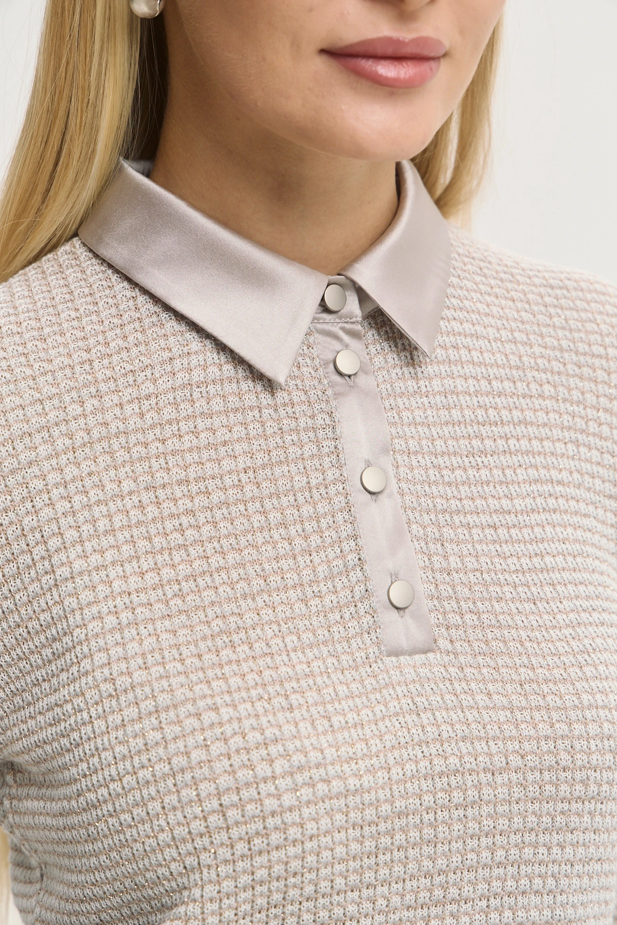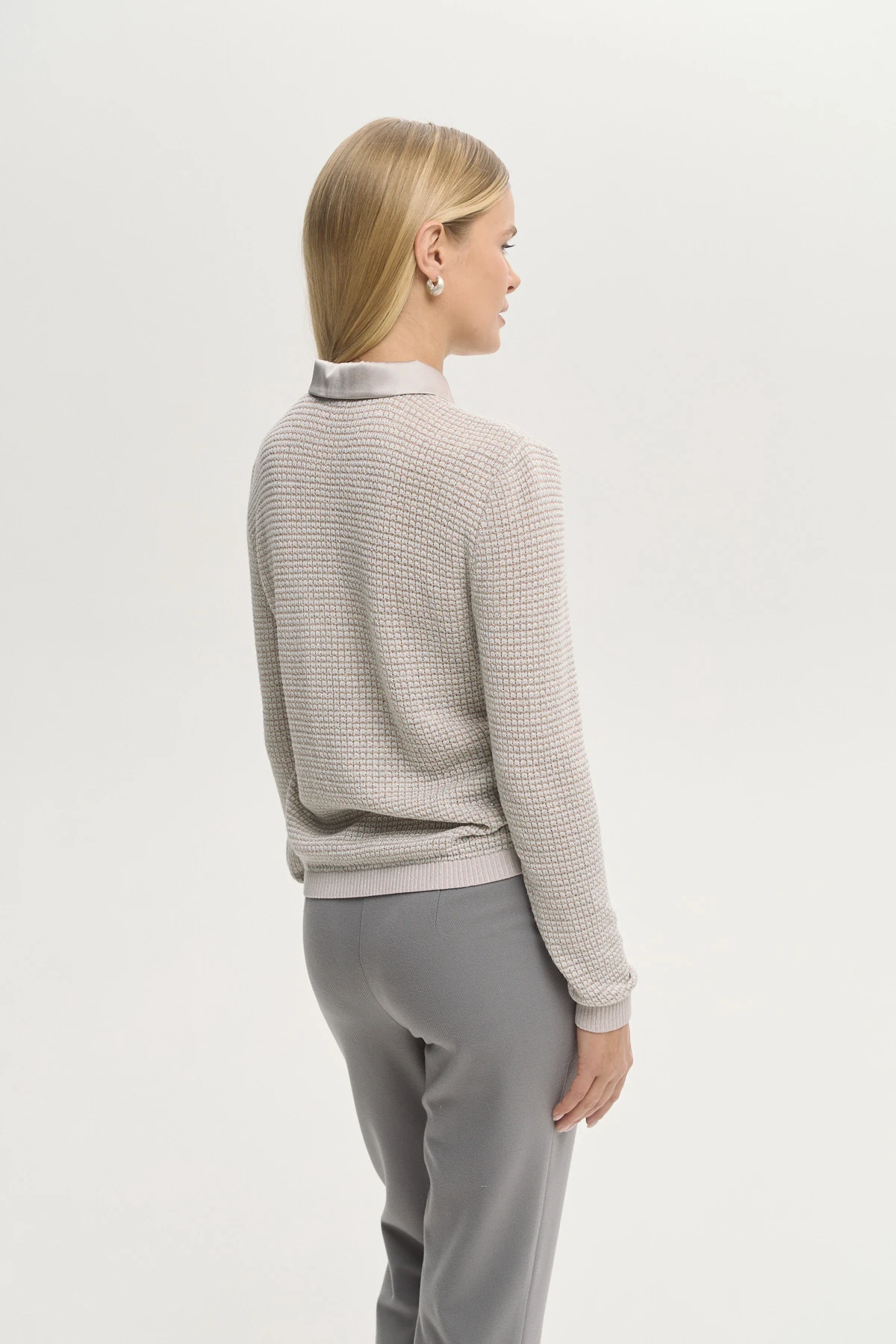 Структурная вязка создаёт визуальный объём и подчёркивает утончённость модели. Воротник и планка-поло из шёлка придают образу завершённость и лёгкий шик. Мягкий оттенок органично вписывается в капсульный гардероб и легко комбинируется. Свободный силуэт красиво очерчивает фигуру, сохраняя при этом свободу движений. Деликатный блеск нити метанит в трикотажном полотне создаёт потенциал модели для праздничных образов.
