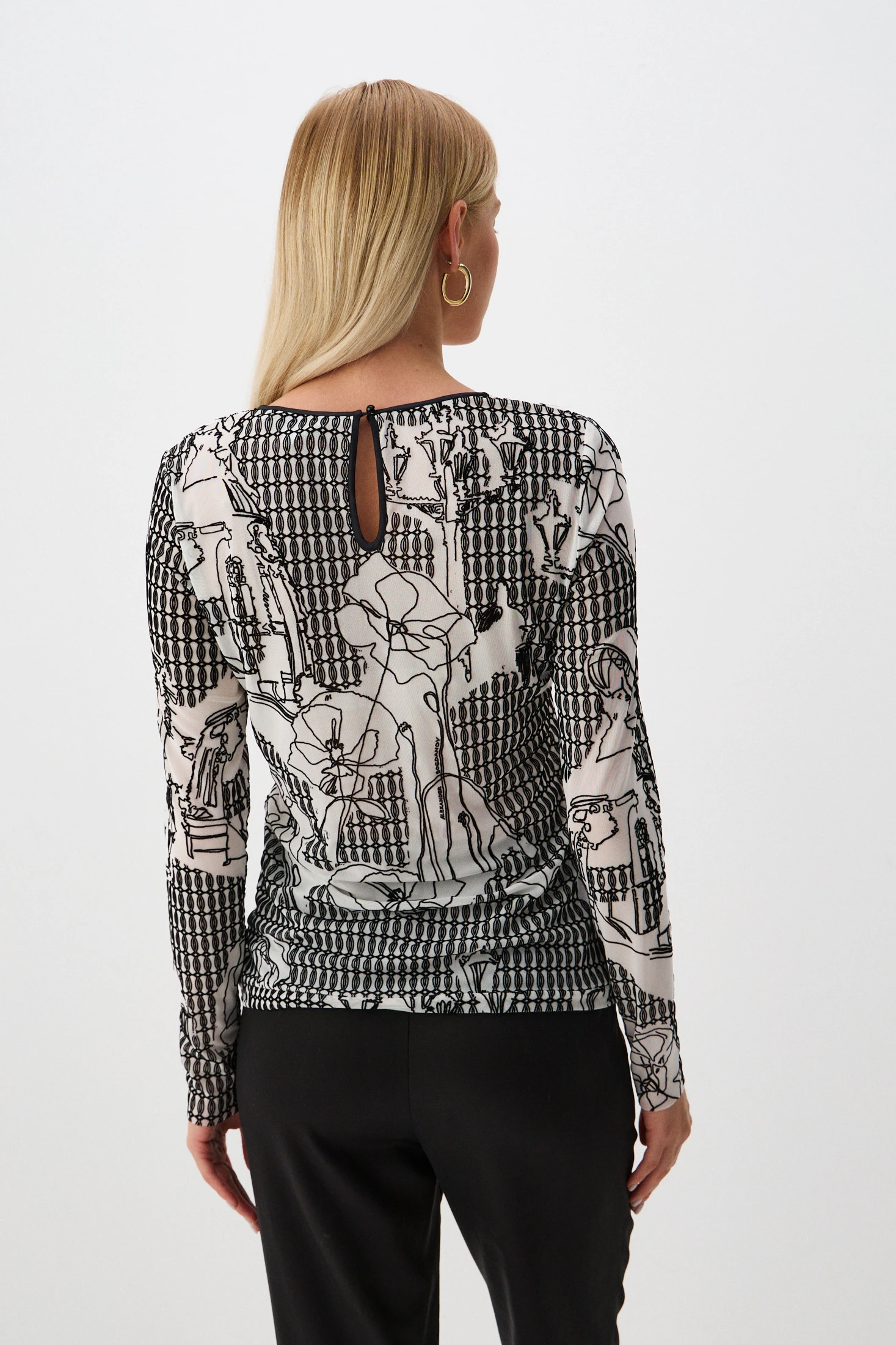 Акцент – на индивидуальность! Джемпер выполнен из эластичной сетки с уникальным дизайном – методом флок-печати нанесён авторский рисунок в ахроматичных оттенках, изображающий цветы, петербургские достопримечательности и фонари на фоне геометричного раппорта. Бархатное напыление – роскошная новинка коллекции. Сочетание элегантности и лёгкости делает этот джемпер отличным решением для образов на праздничные события.