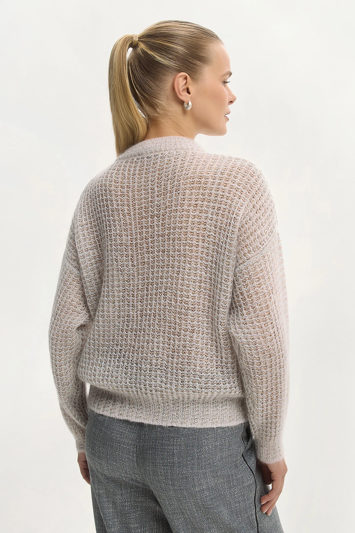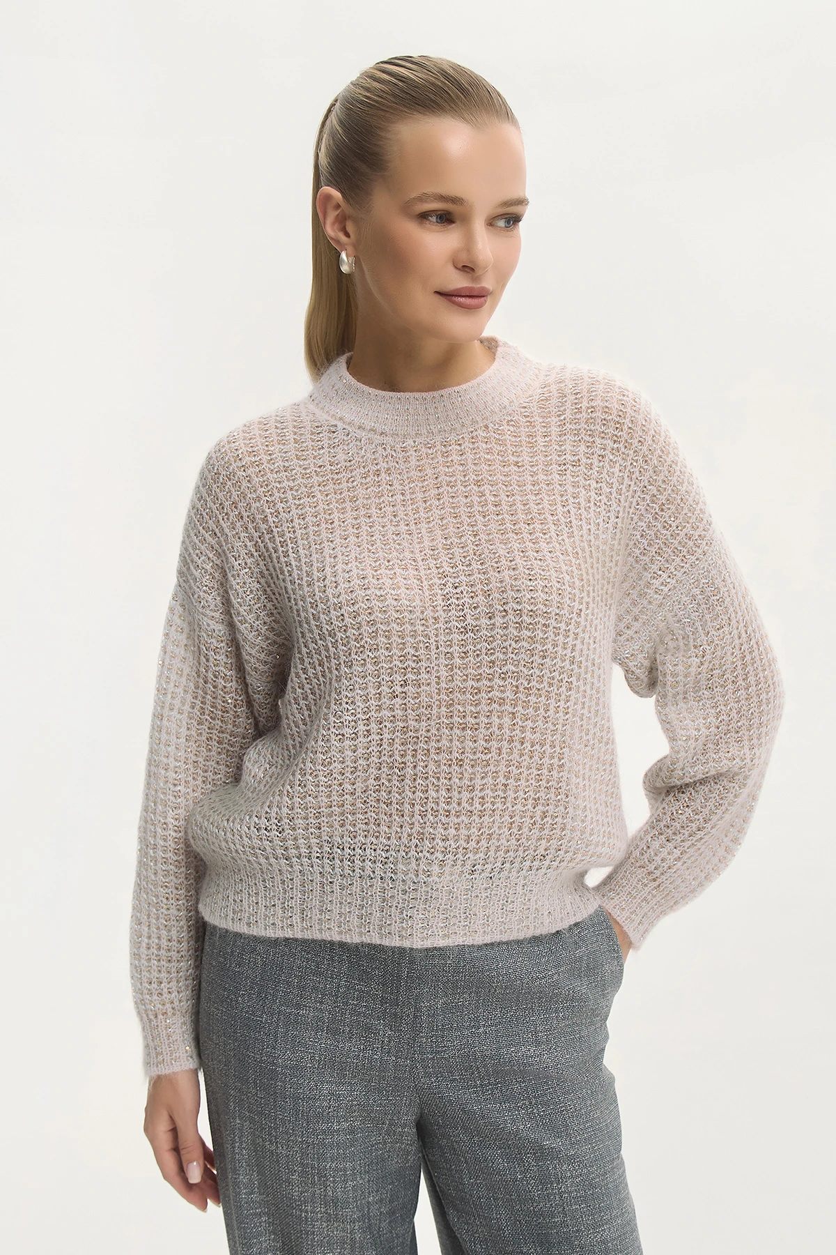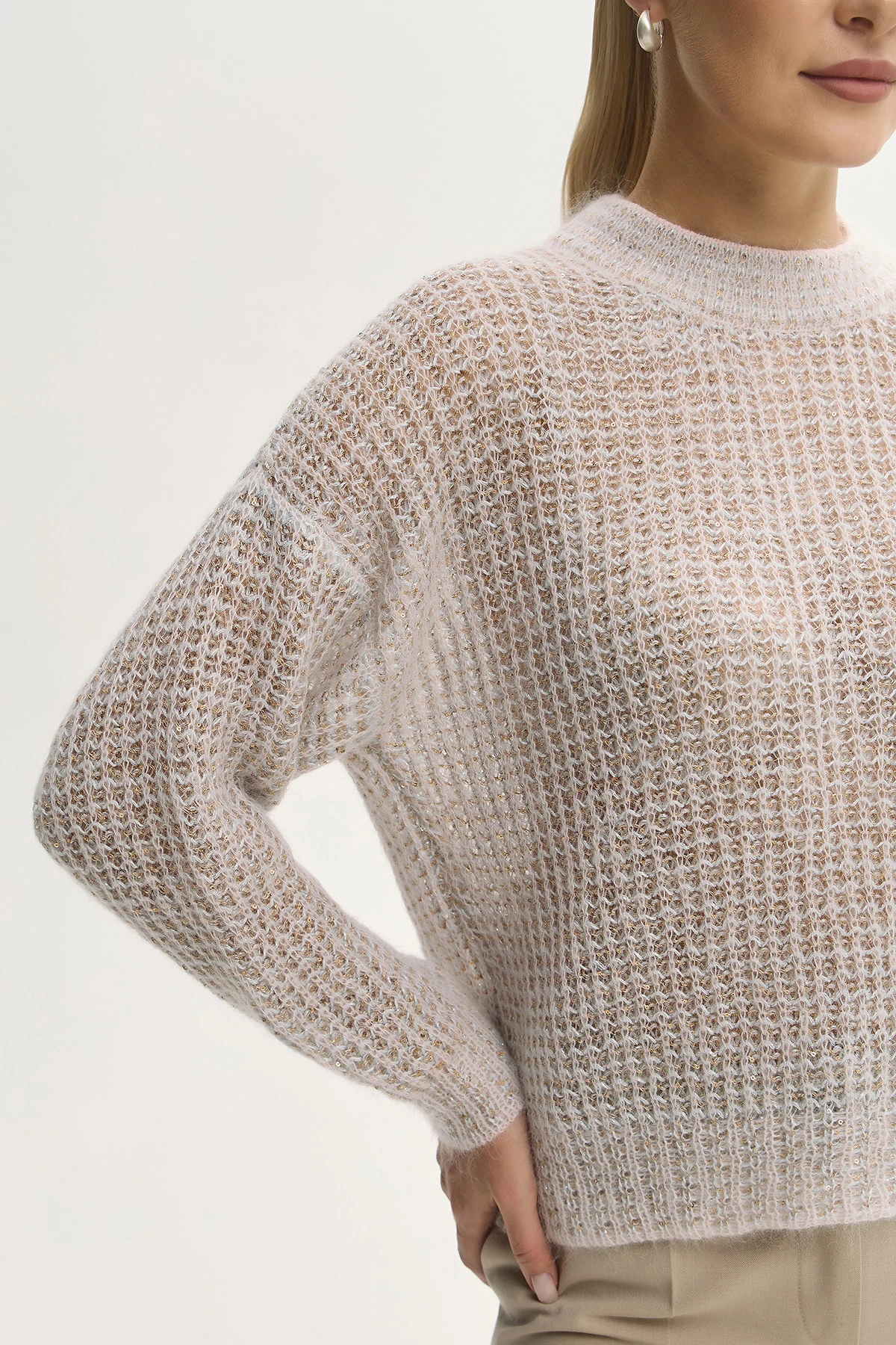 Круглый вырез и спущенная линия плеча придают расслабленность и женственность. Объёмная фактурная вязка с пайетками создаёт мягкий силуэт.