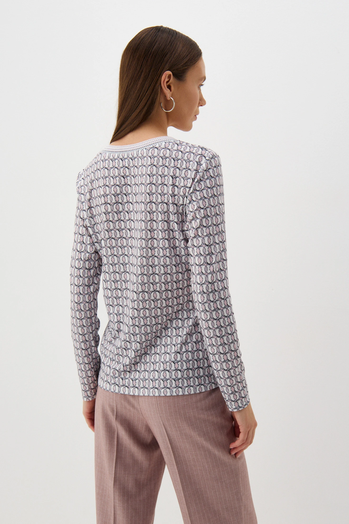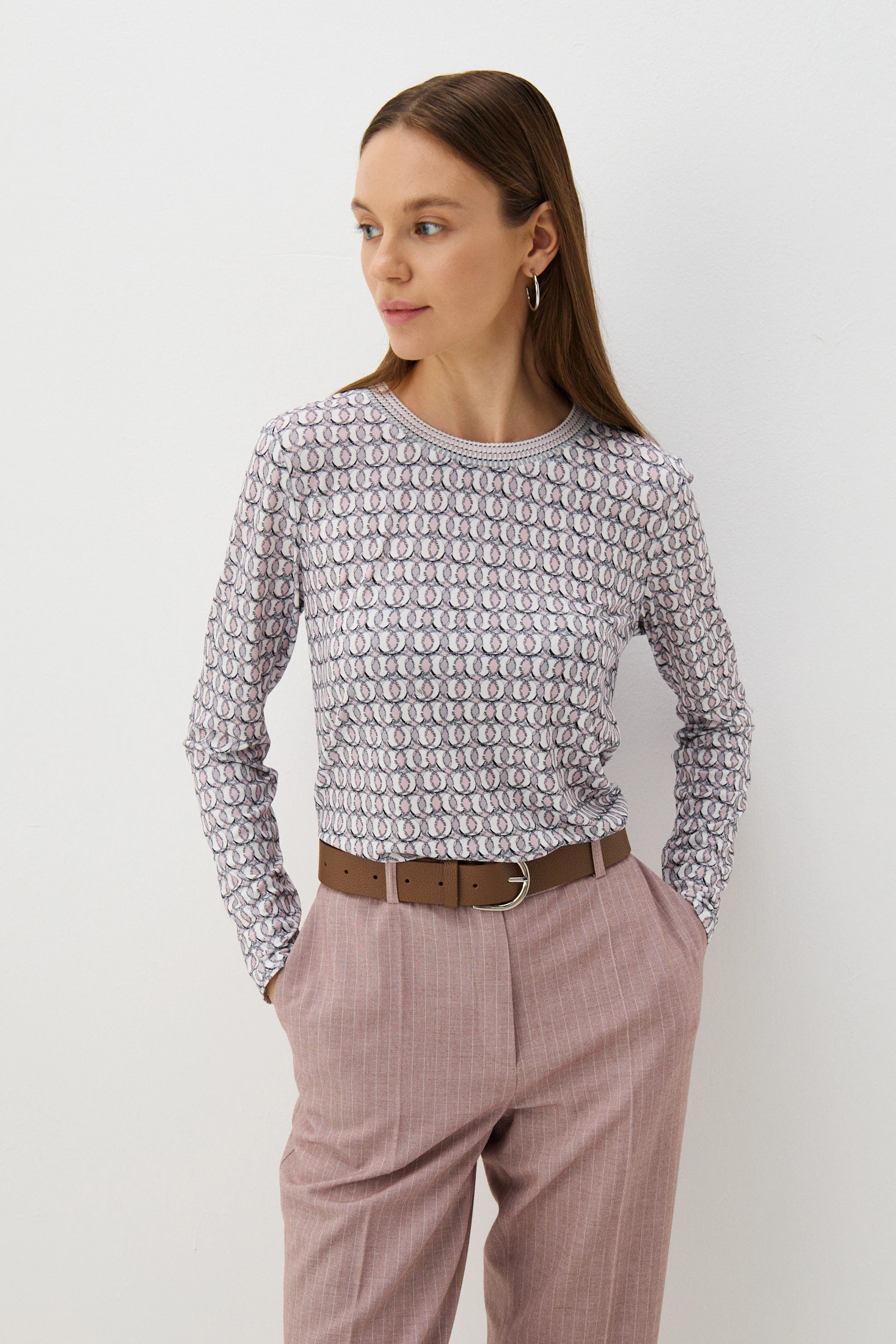 Джемпер из эластичного, несминаемого бифлекса с авторским принтом. Оттенки принта филигранно повторяются в декоре – авторские трикотажные бейки с особой любовью подбираются к каждой модели. Джемпер прекрасно сочетается с классическими брюками и юбками, джинсами, брюками спортивного кроя.