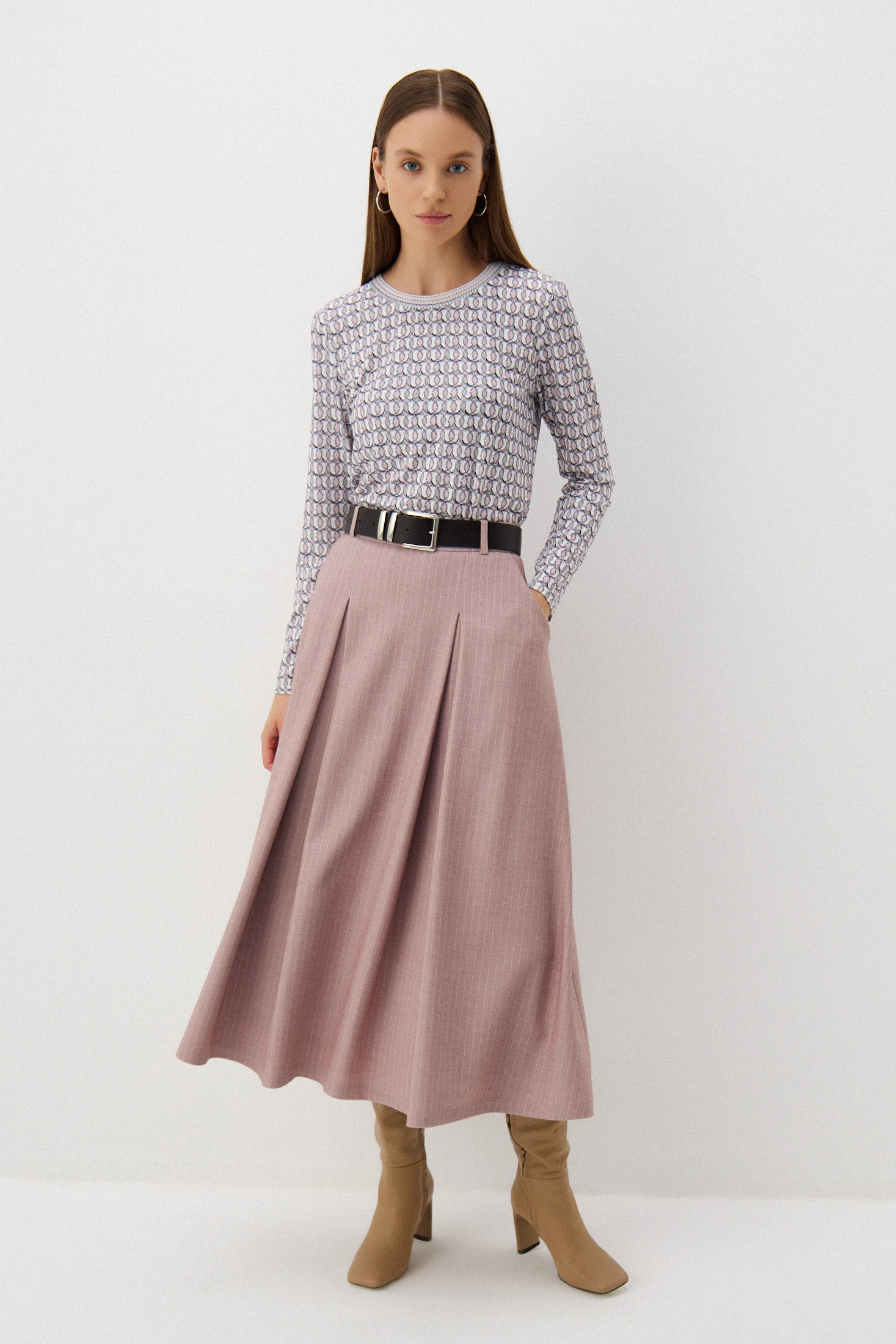 В основе принта – стилизованное звено ограды Михайловского сада. Сочетание пудровых и ахроматичных оттенков создают контрастный динамичный ритм.