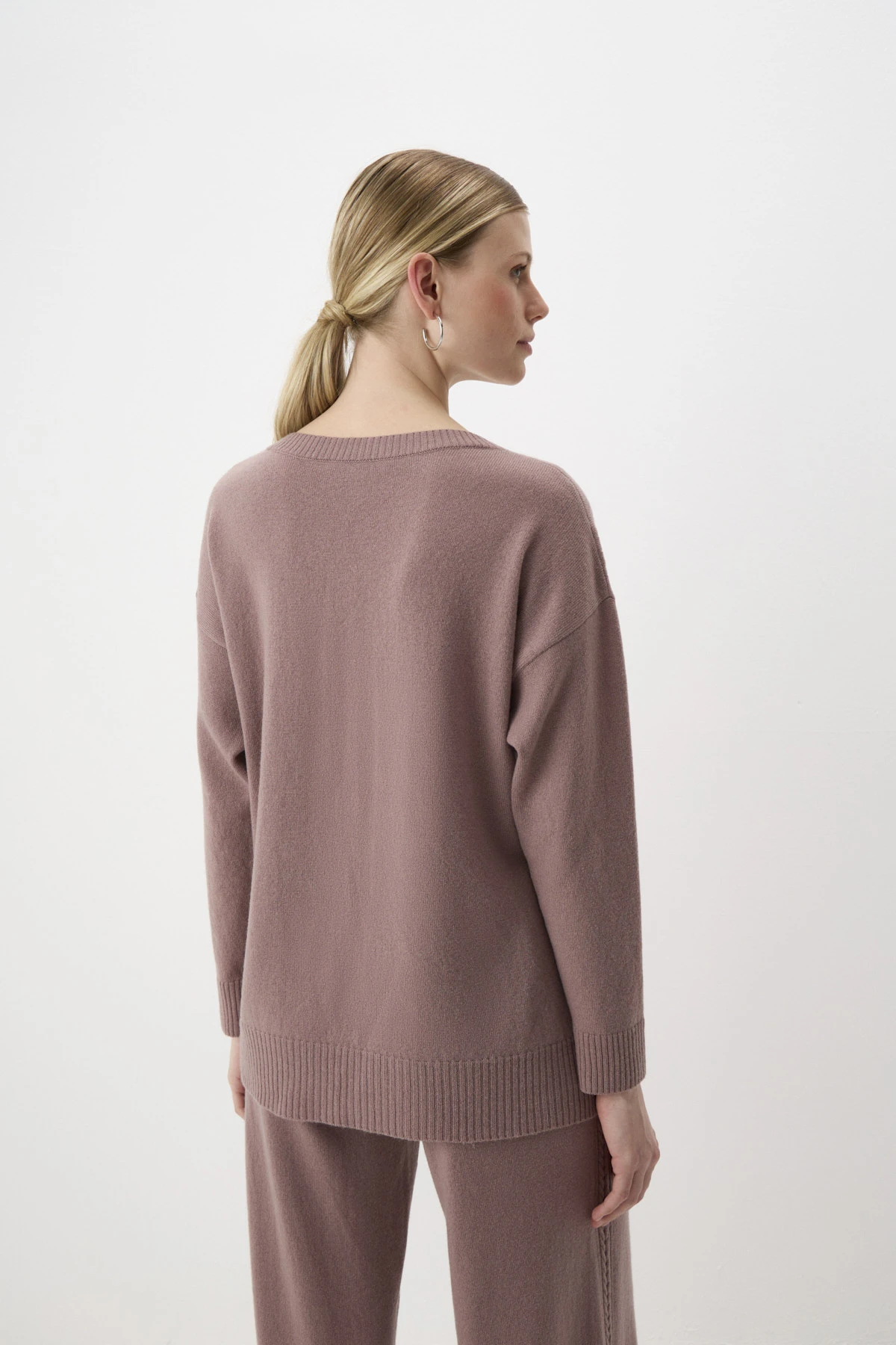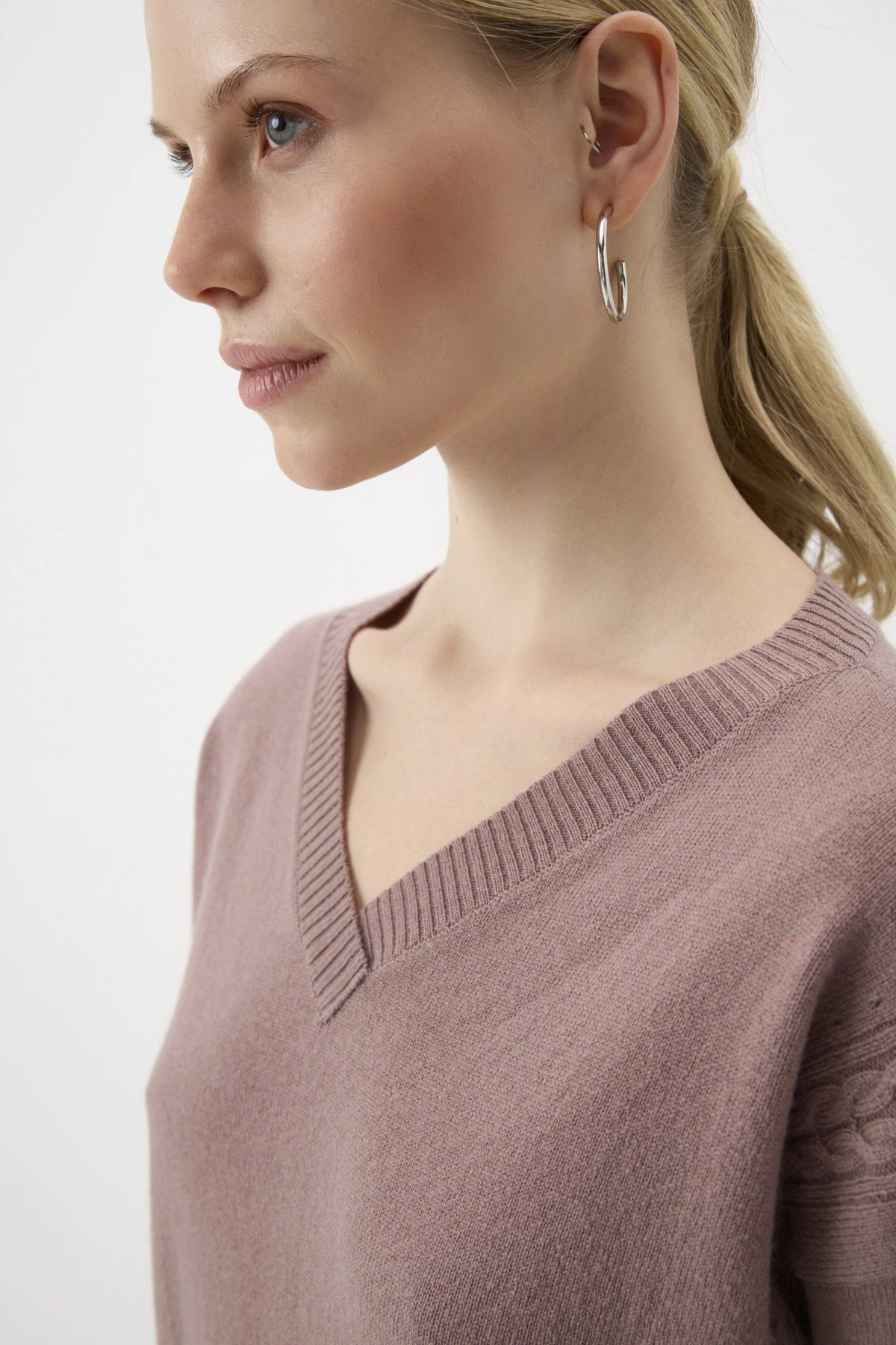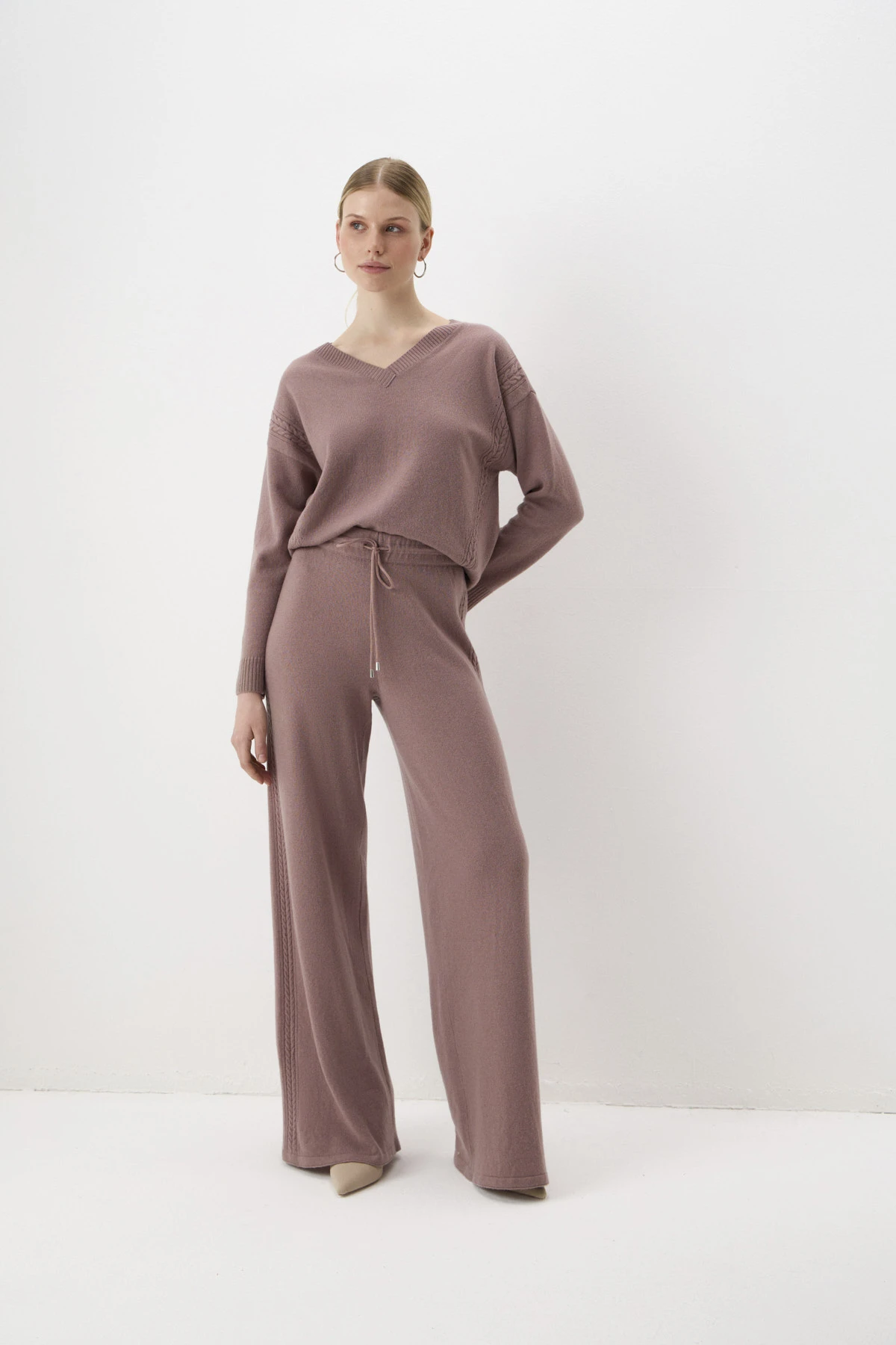 Джемпер из вязаного трикотажа с добавлением тёплой шерсти, уютного кашемира и комфортной вискозы в оттенке «пралине». V-образный вырез подчеркнёт красоту шеи. Длинные рукава со спущенной линией плеча и разрезы в боковых швах создают расслабленный силуэт. Лаконичный декор по переду в виде «косичек» и перфорации смотрится деликатно и изысканно.