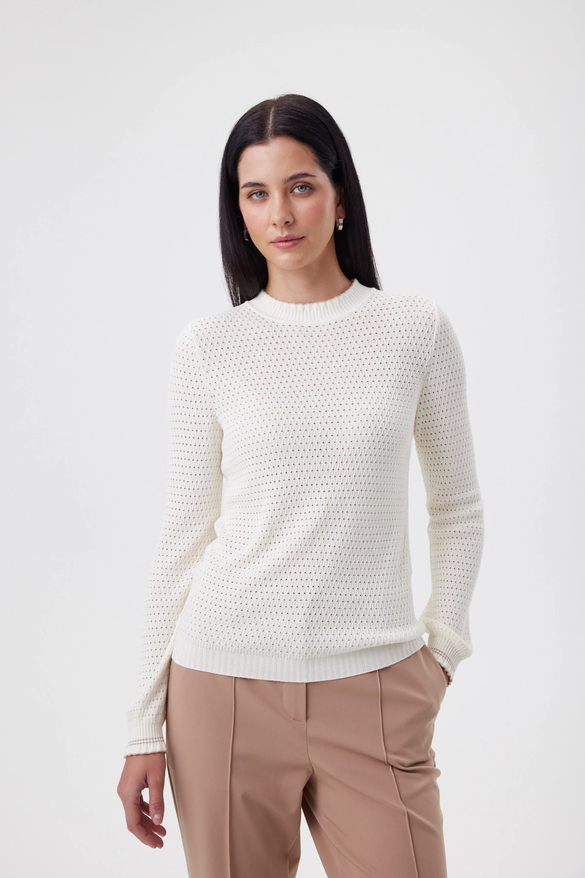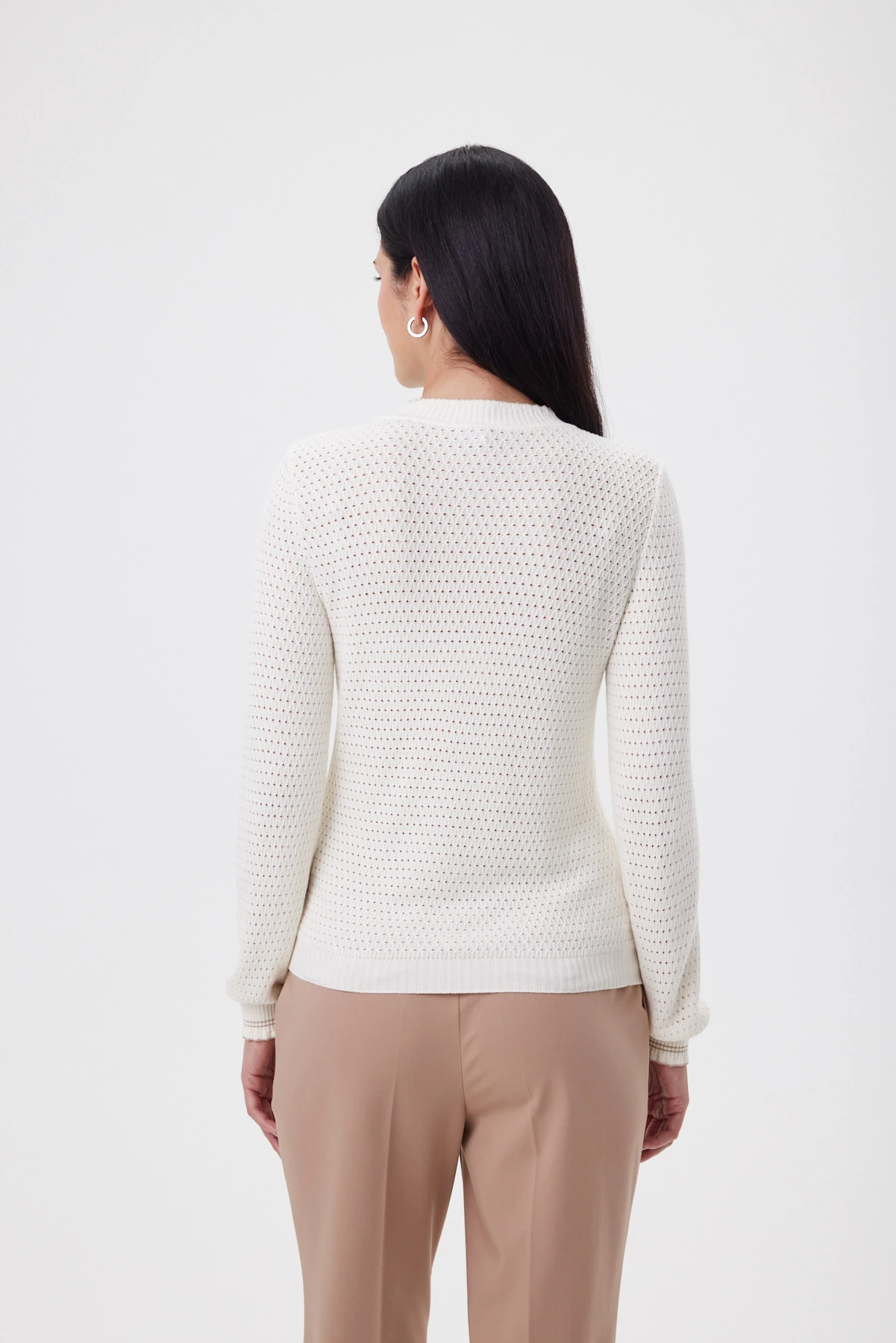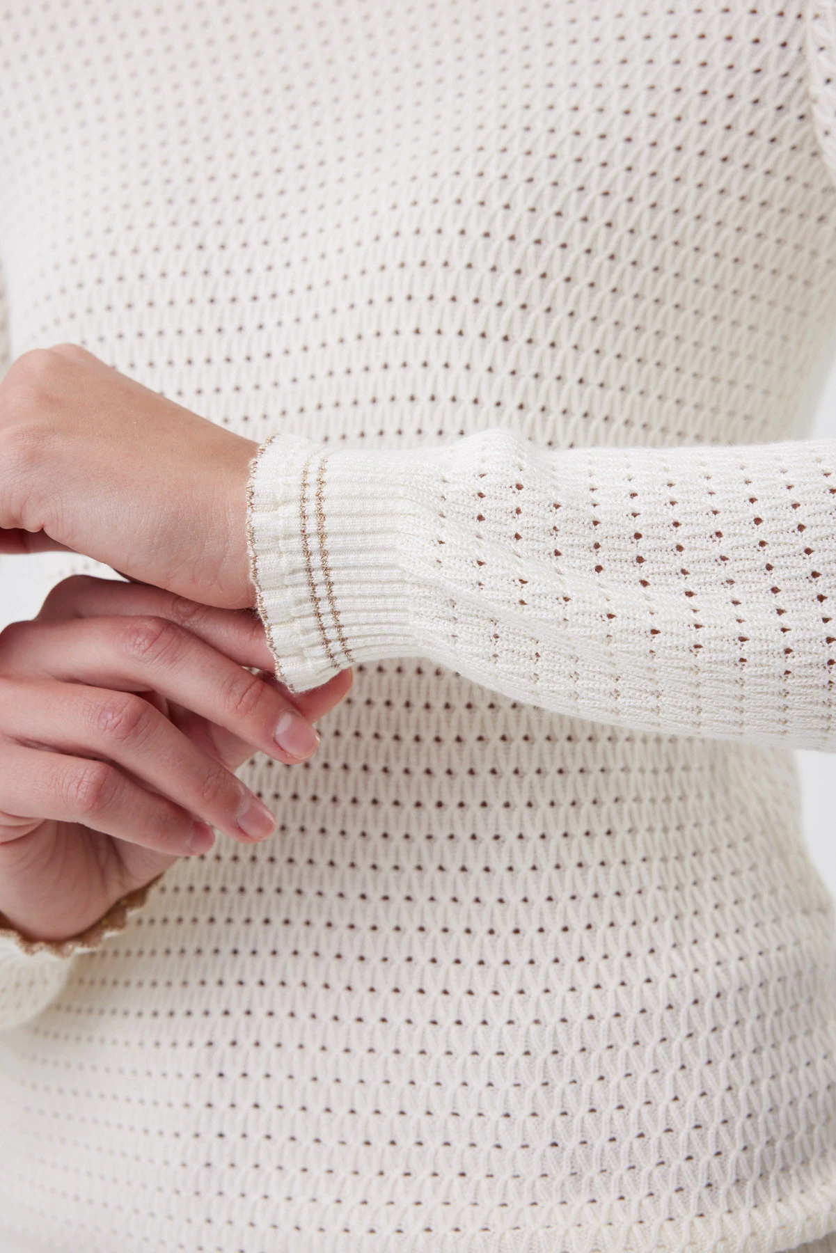 Джемпер вдохновлён эстетикой царской эпохи, это современная интерпретация русского аристократизма. Трикотажное полотно напоминает изящную «решётку» дворцового декора. Комбинированная вязка с разными видами ажурных переплетений создаёт утончённый рельеф, игру света и ощущение воздуха, сохраняя при этом чёткую форму. Края изделия обрамлены тонкими полосами золотого метанита: едва заметное сияние, как тонкий штрих, связывающий прошлое и настоящее. На манжете — аккуратная рюша, придающая образу романтичности и женственности.