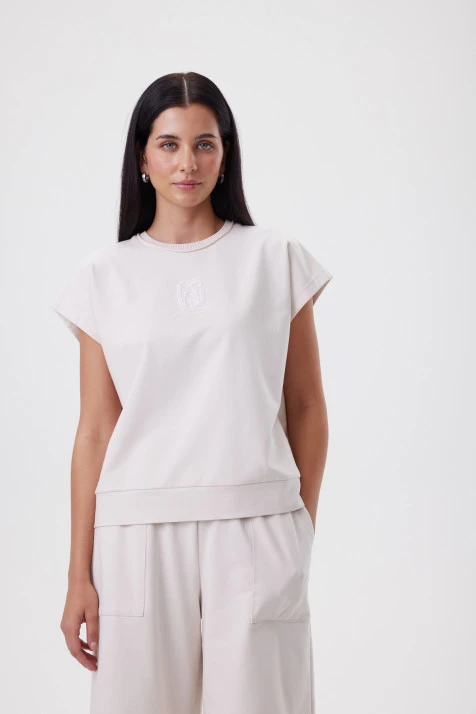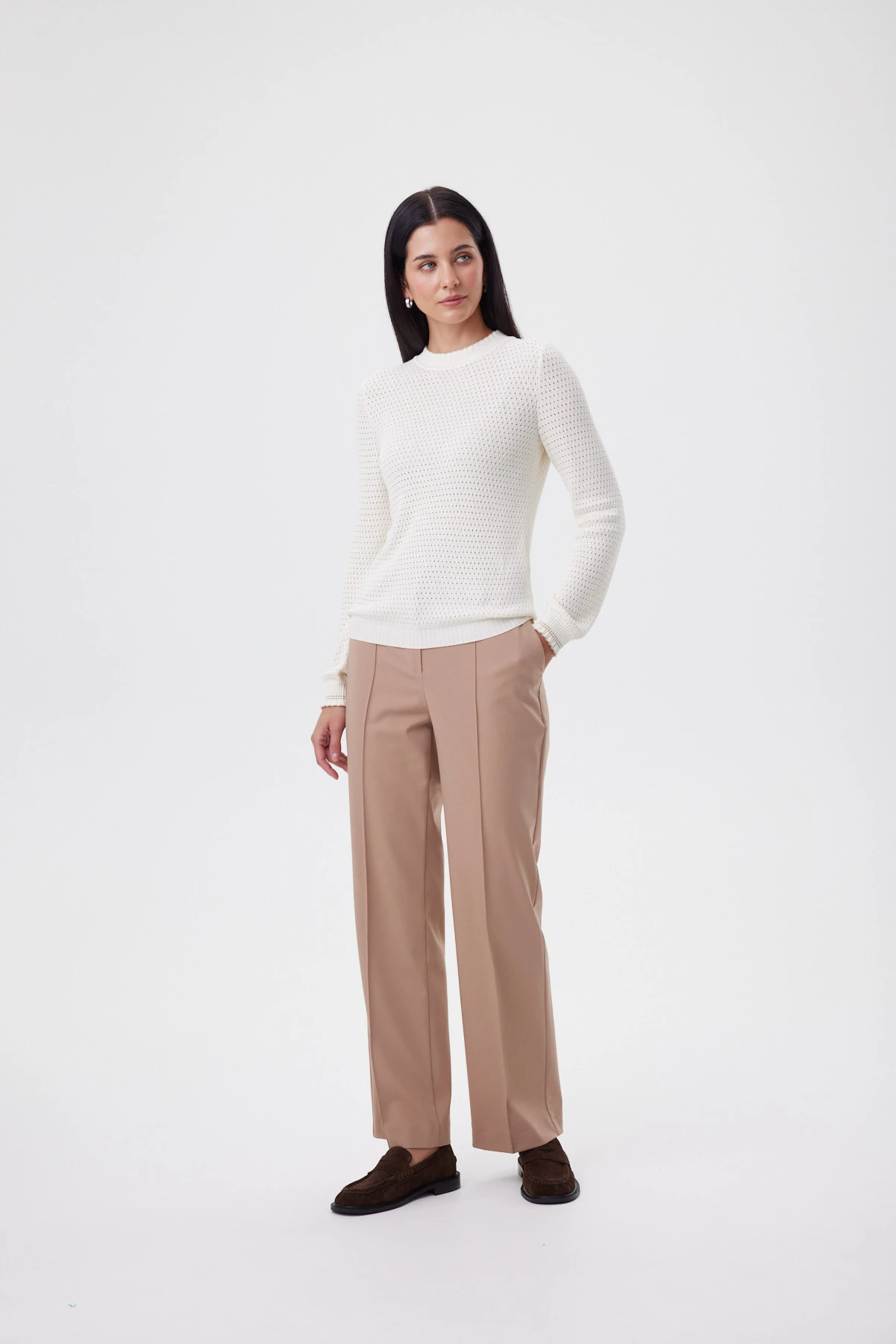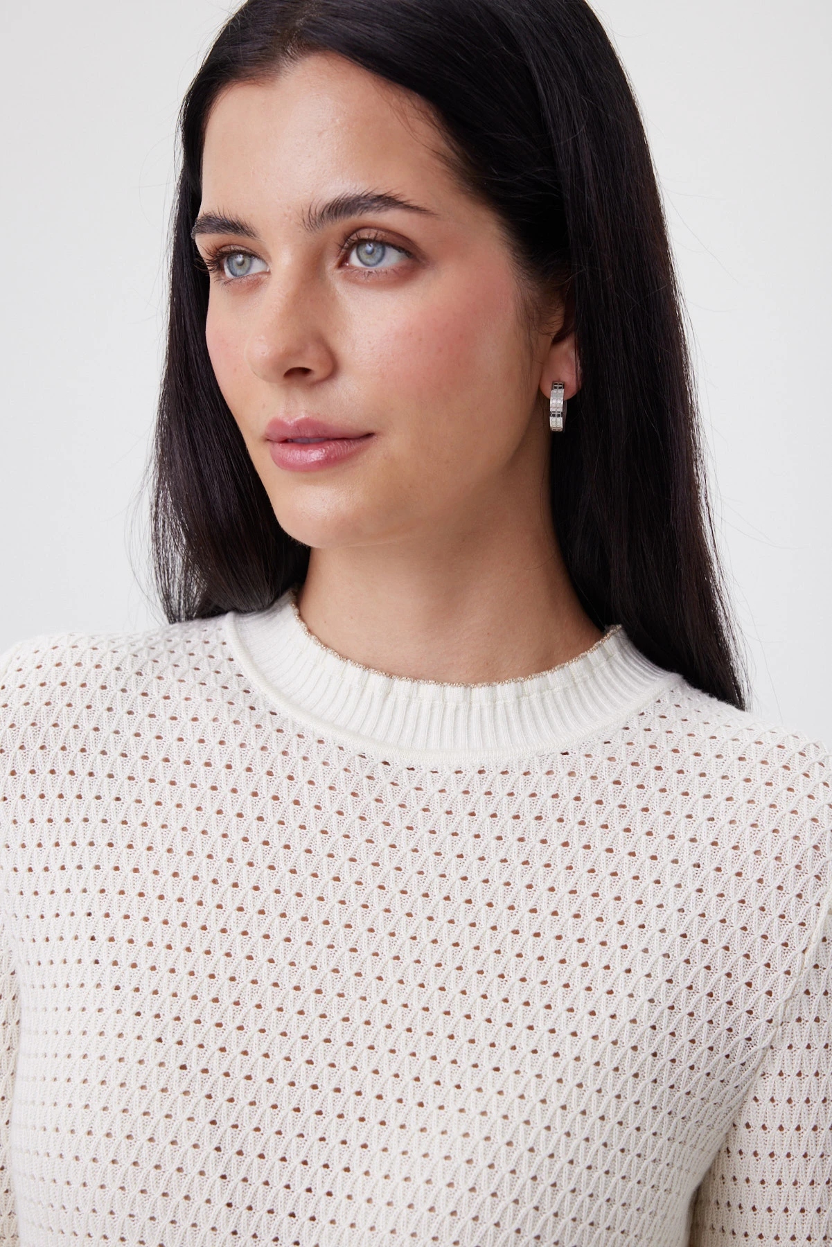 Джемпер вдохновлён эстетикой царской эпохи, это современная интерпретация русского аристократизма. Трикотажное полотно напоминает изящную «решётку» дворцового декора. Комбинированная вязка с разными видами ажурных переплетений создаёт утончённый рельеф, игру света и ощущение воздуха, сохраняя при этом чёткую форму. Края изделия обрамлены тонкими полосами золотого метанита: едва заметное сияние, как тонкий штрих, связывающий прошлое и настоящее. На манжете — аккуратная рюша, придающая образу романтичности и женственности.