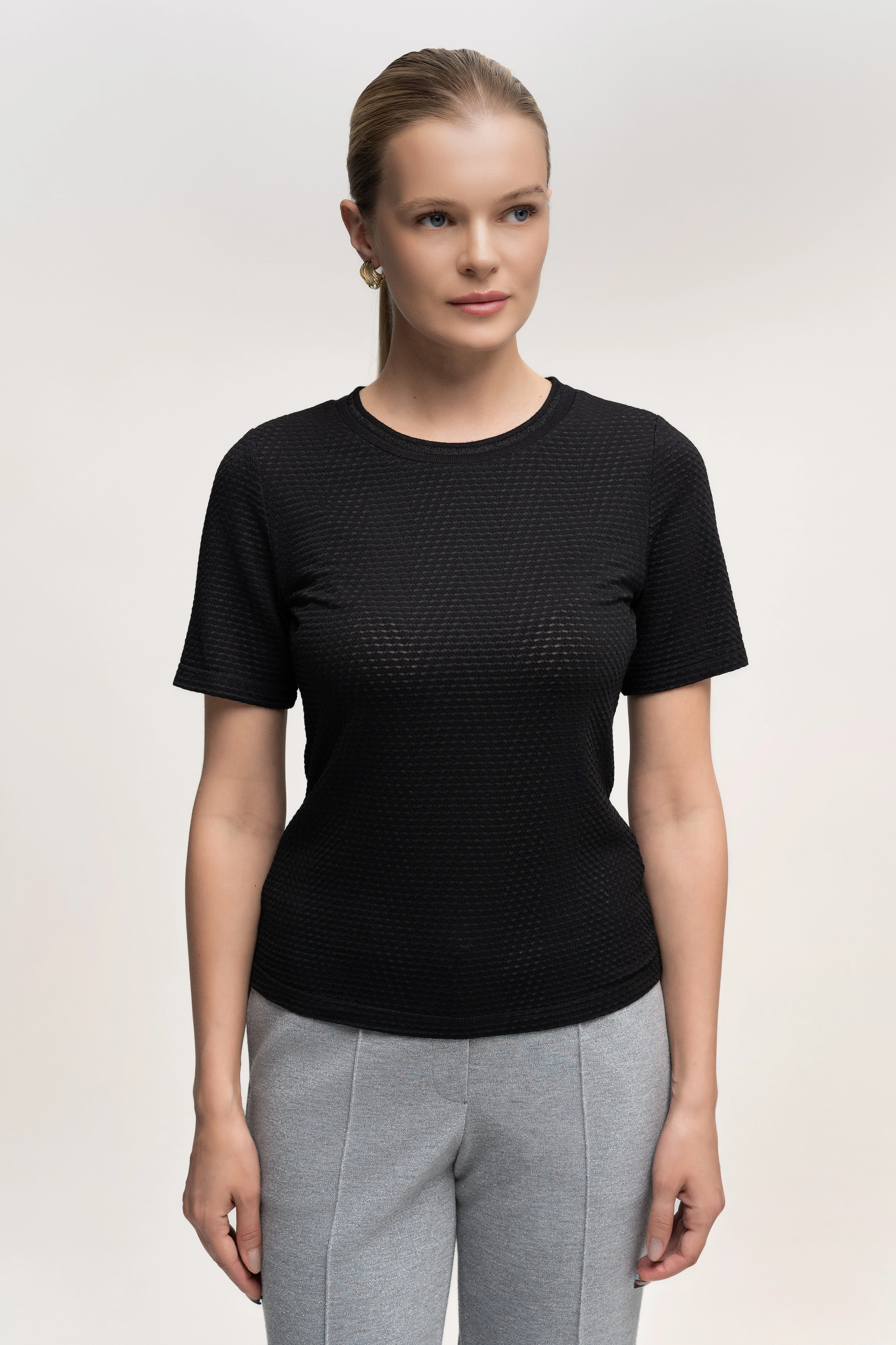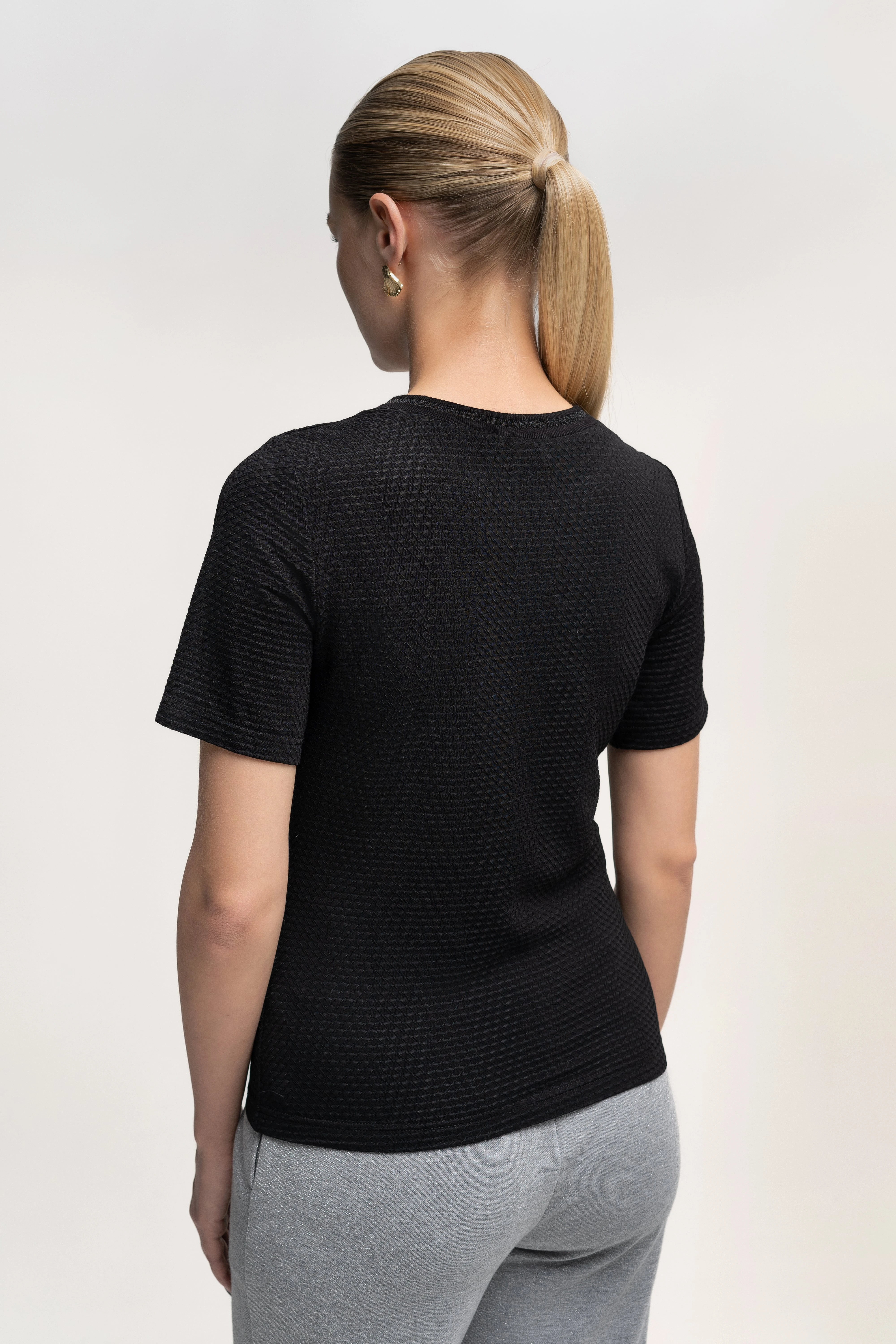 Базовая модель с изюминкой — фактурная ткань придаёт визуальный интерес. Универсальный оттенок подойдёт для любого гардероба. Комфортная длина и короткий рукав делают модель удобной в качестве первого слоя — комбинируйте с различными верхами. Ткань на основе вискозы лёгкая, гигроскопичная и тактильно приятная.