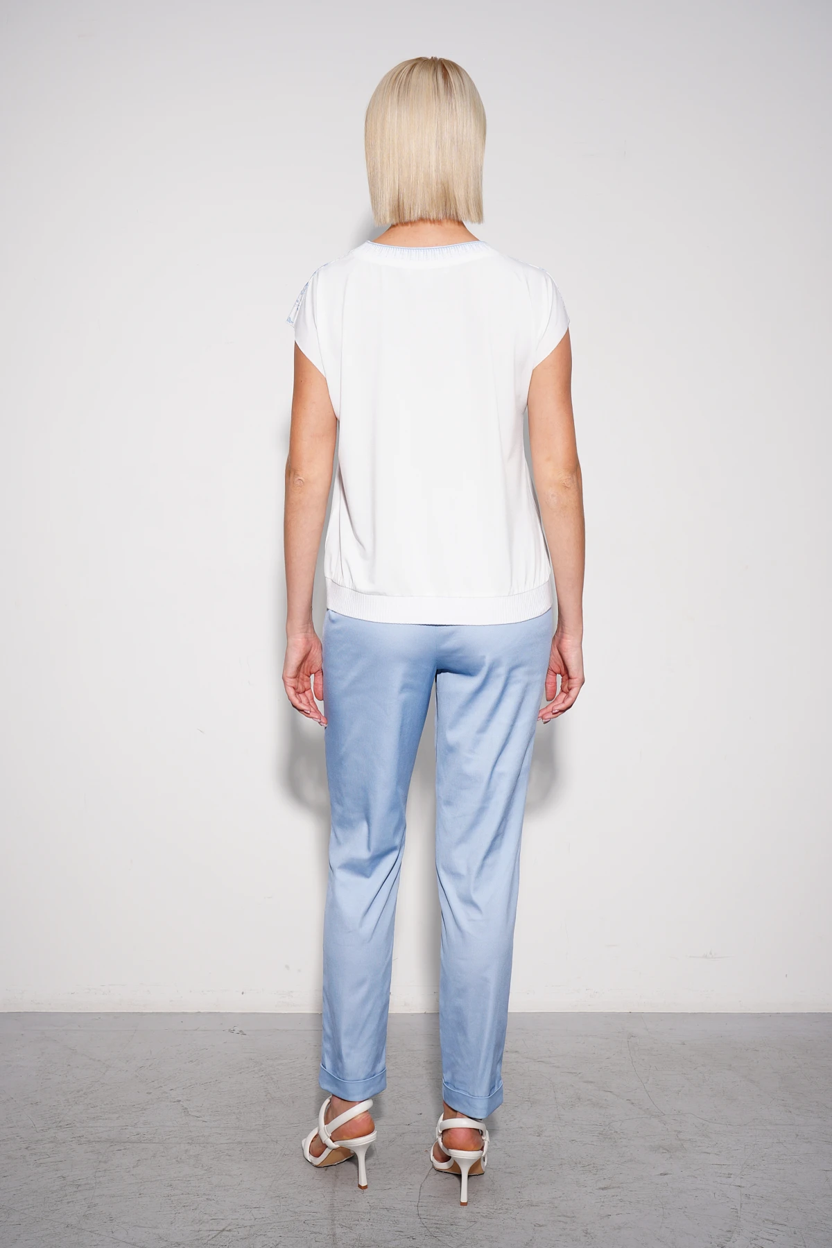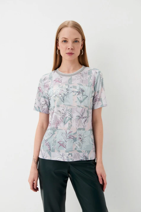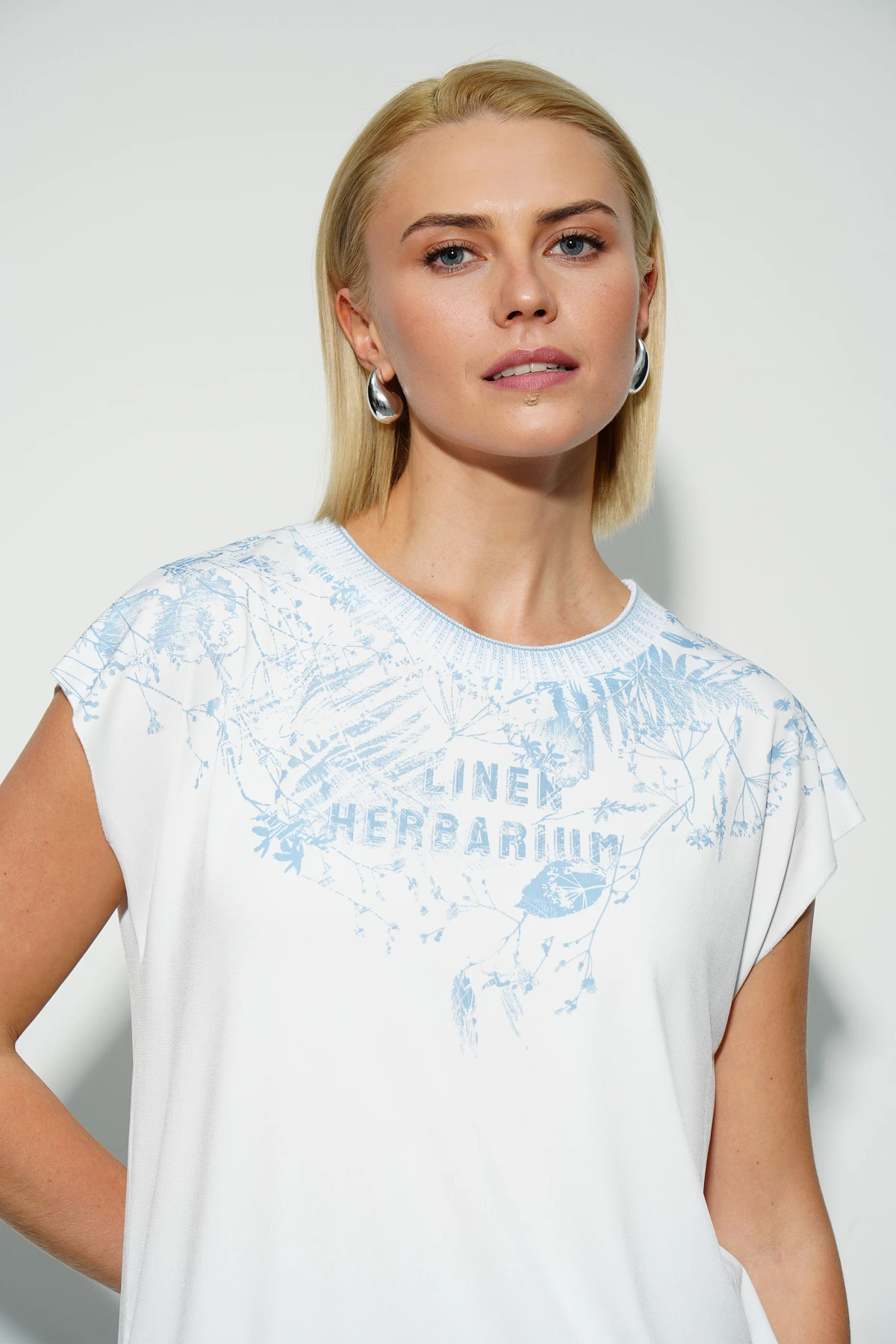 Футболка из эластичного бифлекса — это комфортная и стильная модель, которая подарит ощущение легкости. Авторский принт «Льняной гербарий» небесного оттенка, нанесенный в портретной зоне придает футболке оригинальность. Свободный силуэт футболки на трикотажном поясе создаёт гармоничный и удобный образ. Цельновыкроеные короткие рукава добавляют лёгкости, а круглый вырез горловины, оформленный авторской трикотажной бейкой, придаёт модели завершённость. Низ футболки оформлен однотонной бейкой в рубчик.