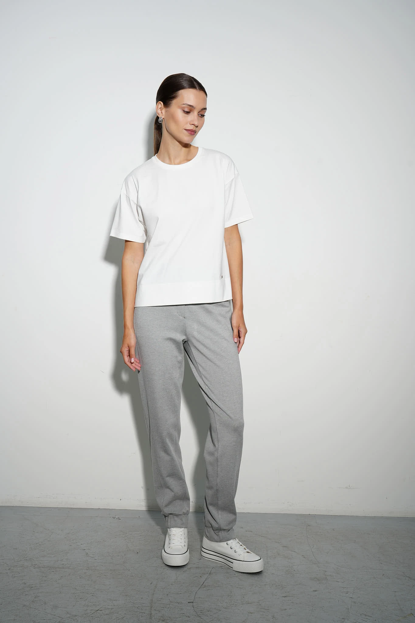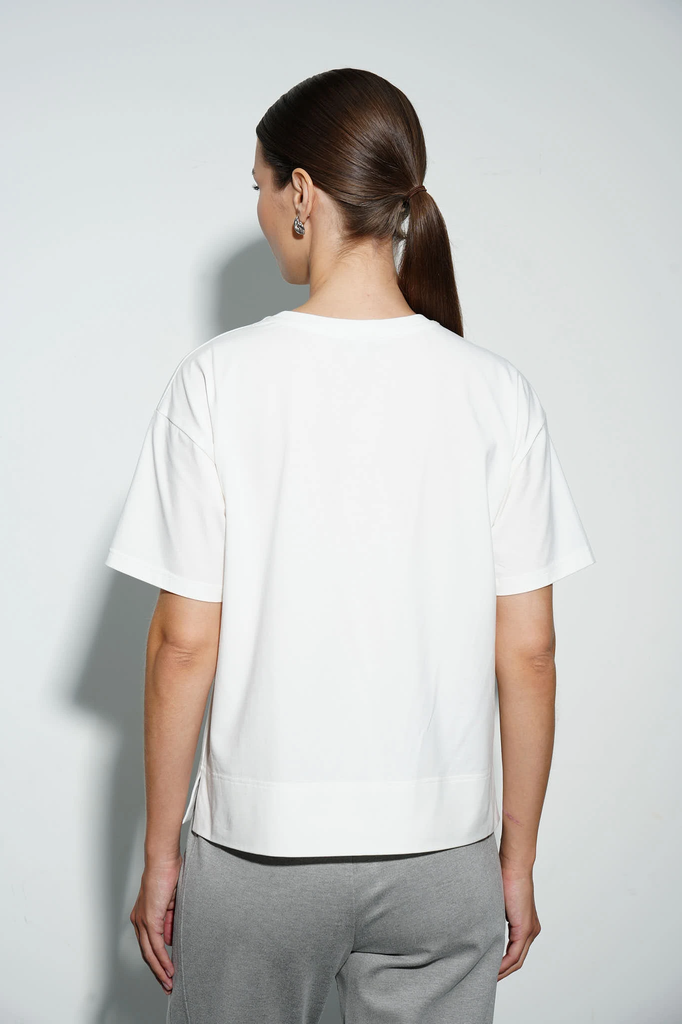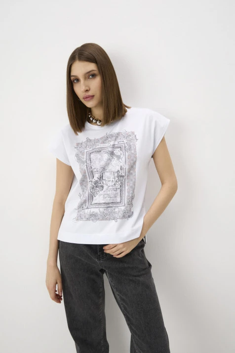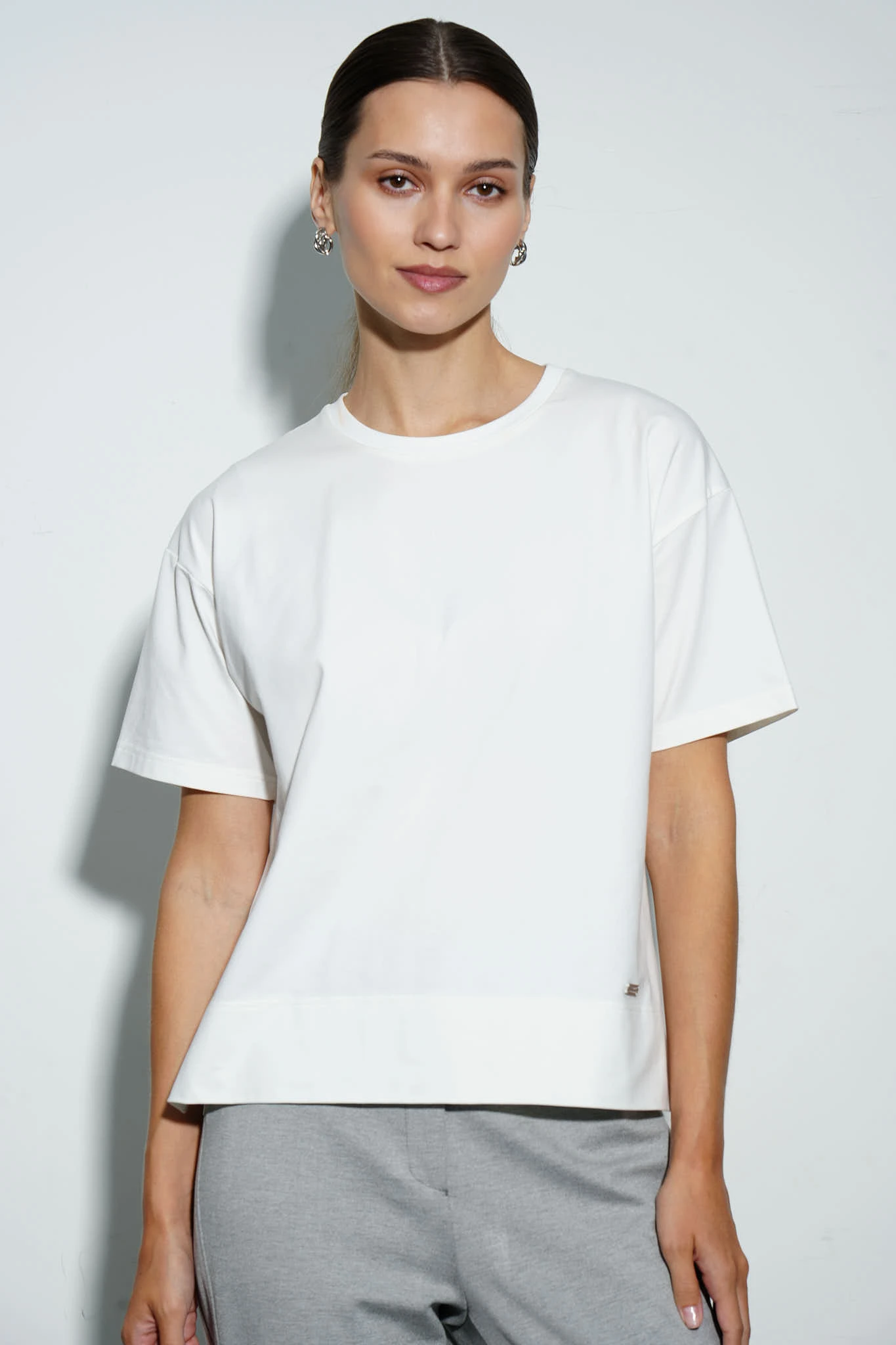Футболка из эластичного хлопкового трикотажа Пенье в универсальном молочном оттенке — идеальная основа для гардероба. Модель свободного силуэта легко сочетается с другими элементами одежды, обеспечивая комфорт и стиль на каждый день. Короткие рукава со спущенной линией плеча и разрезы в боковых швах добавляют расслабленности образу. По переду - брендированная фурнитура из белого металла.