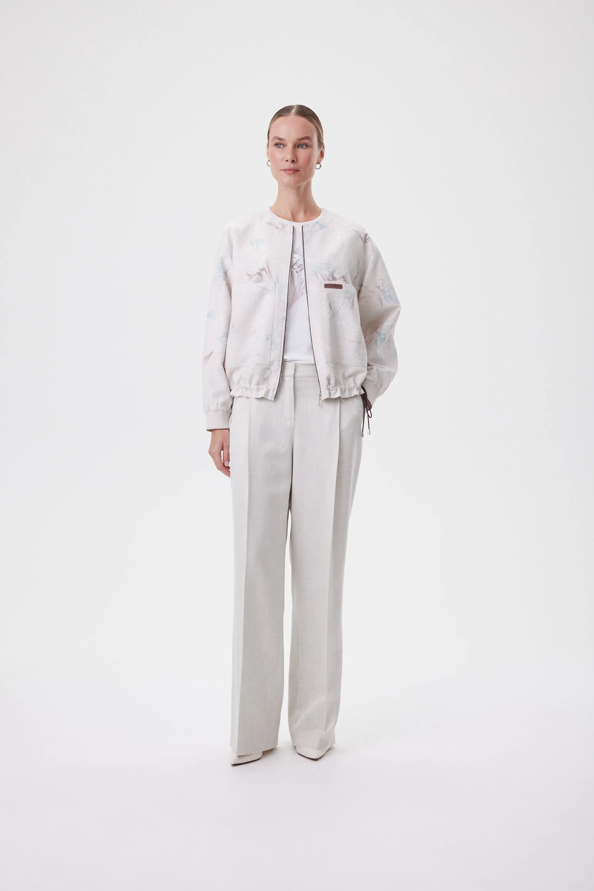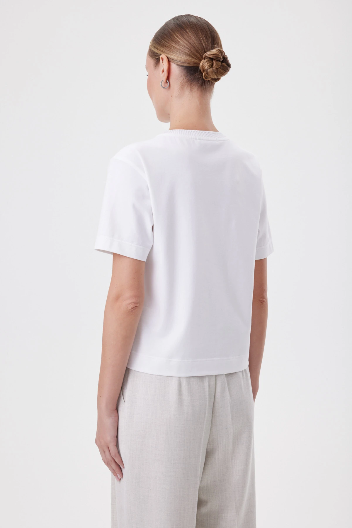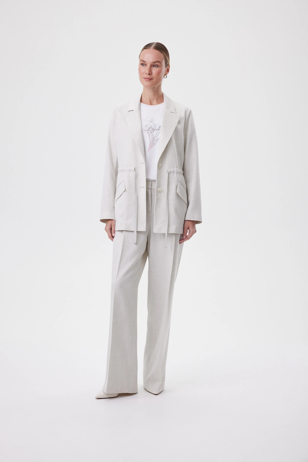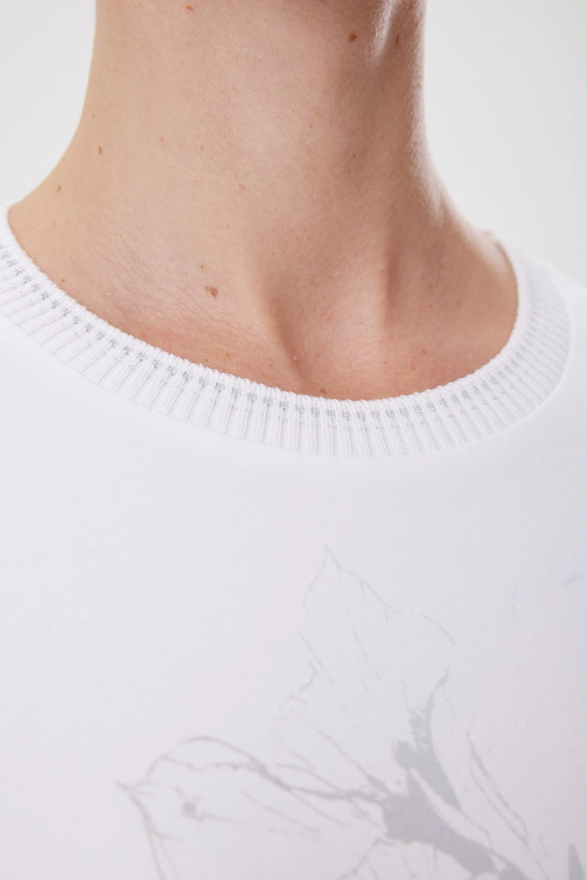 Базовая белая футболка выполнена в современном укороченном силуэте: она садится ровно, не обтягивая, и красиво работает с высокой талией — линия корпуса выглядит собранной, а плечи остаются аккуратными за счёт чистой посадки и комфортной широкой проймы. Широкие подгибки по низу и рукавам добавляют структуру и дают эффект «мини-блузы» — футболка смотрится более статусно, чем обычная база. Премиальный трикотаж Пенье плотный и гладкий: держит форму, не просвечивает и остаётся комфортным в жару. Фирменная бейка по горловине с деликатным блеском метанита подчёркивает линию шеи и делает образ чуть наряднее без лишних украшений. Купонный акварельный гладиолус и тонкая надпись Lightness создают лёгкий художественный акцент. Комбинируйте с костюмными брюками или юбкой, с денимом и кедами для casual, либо под жакет как свежий, небанальный первый слой.
