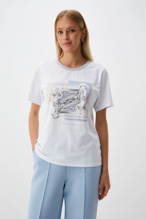 Футболка свободного кроя с круглым вырезом горловины и короткими цельновыкроенными рукавами. Модель выполнена из комфортного гигроскопичного хлопкового трикотажа Пенье с авторским принтом, композиционно расположенным по центру и вписанным в паспарту, что создаёт эффект картины. Разные длины переда и спинки и разрезы в боковых швах позволяют носить футболку как навыпуск, так и заправленной.