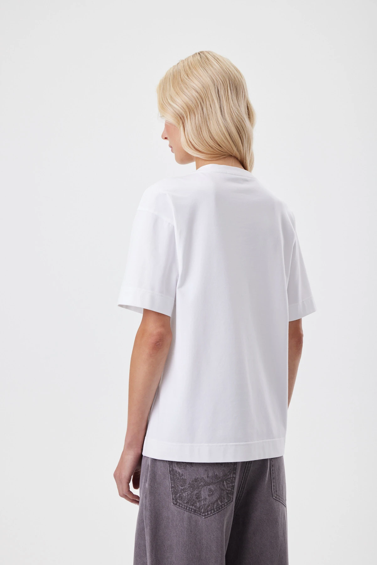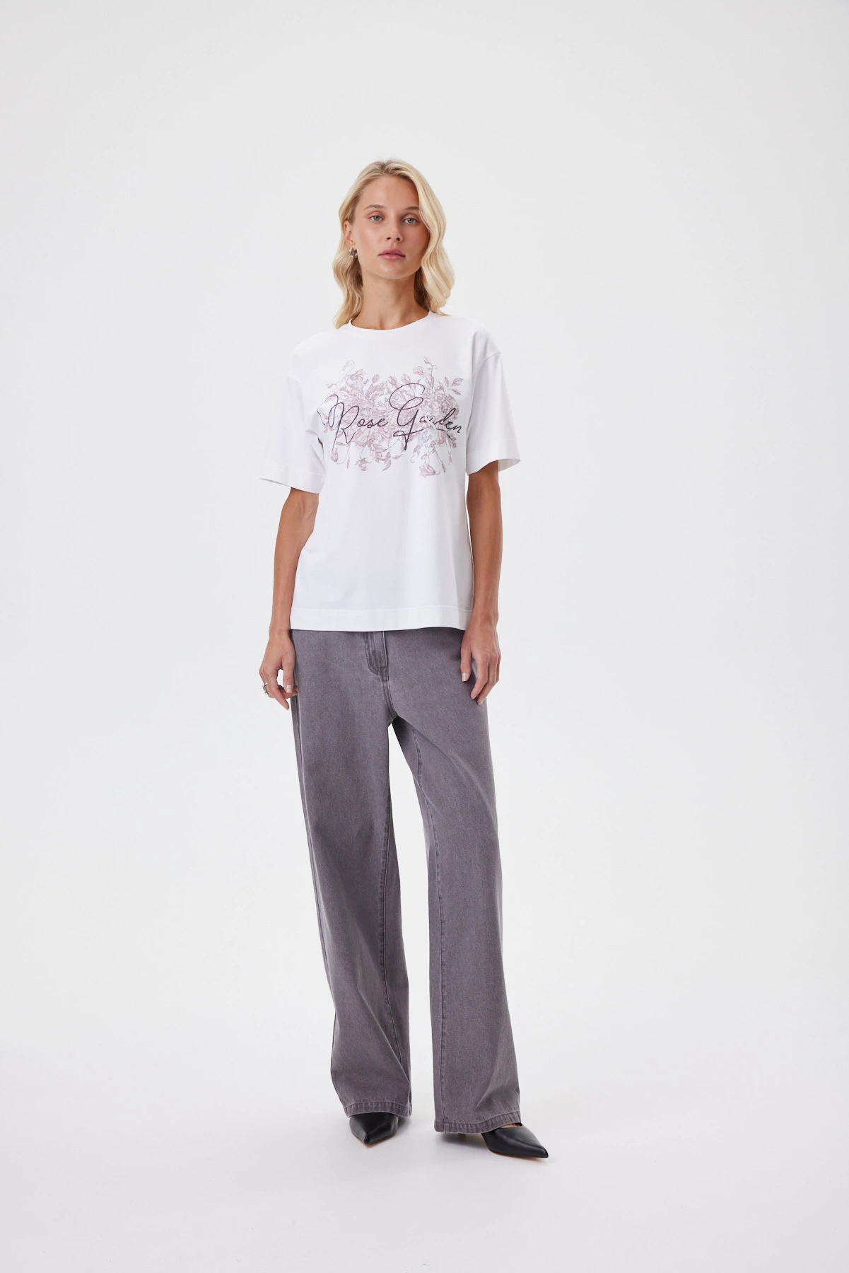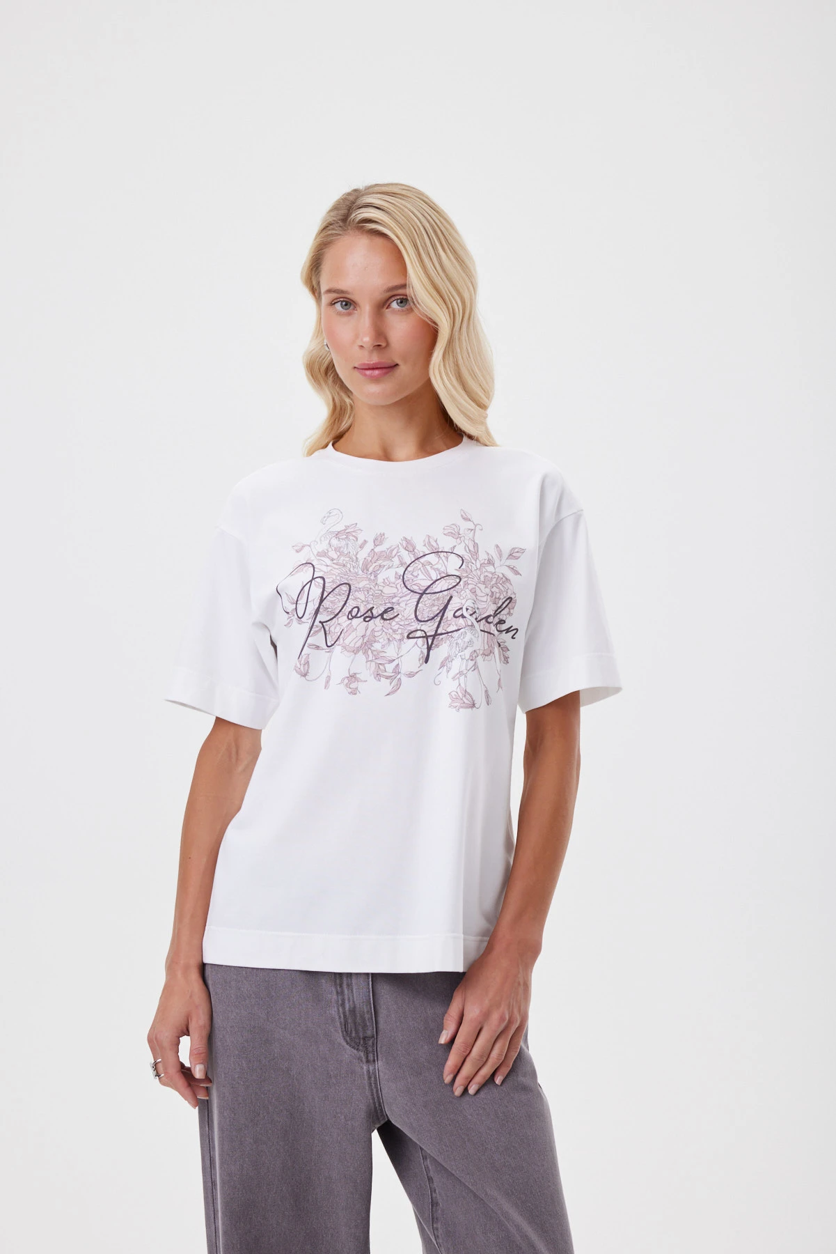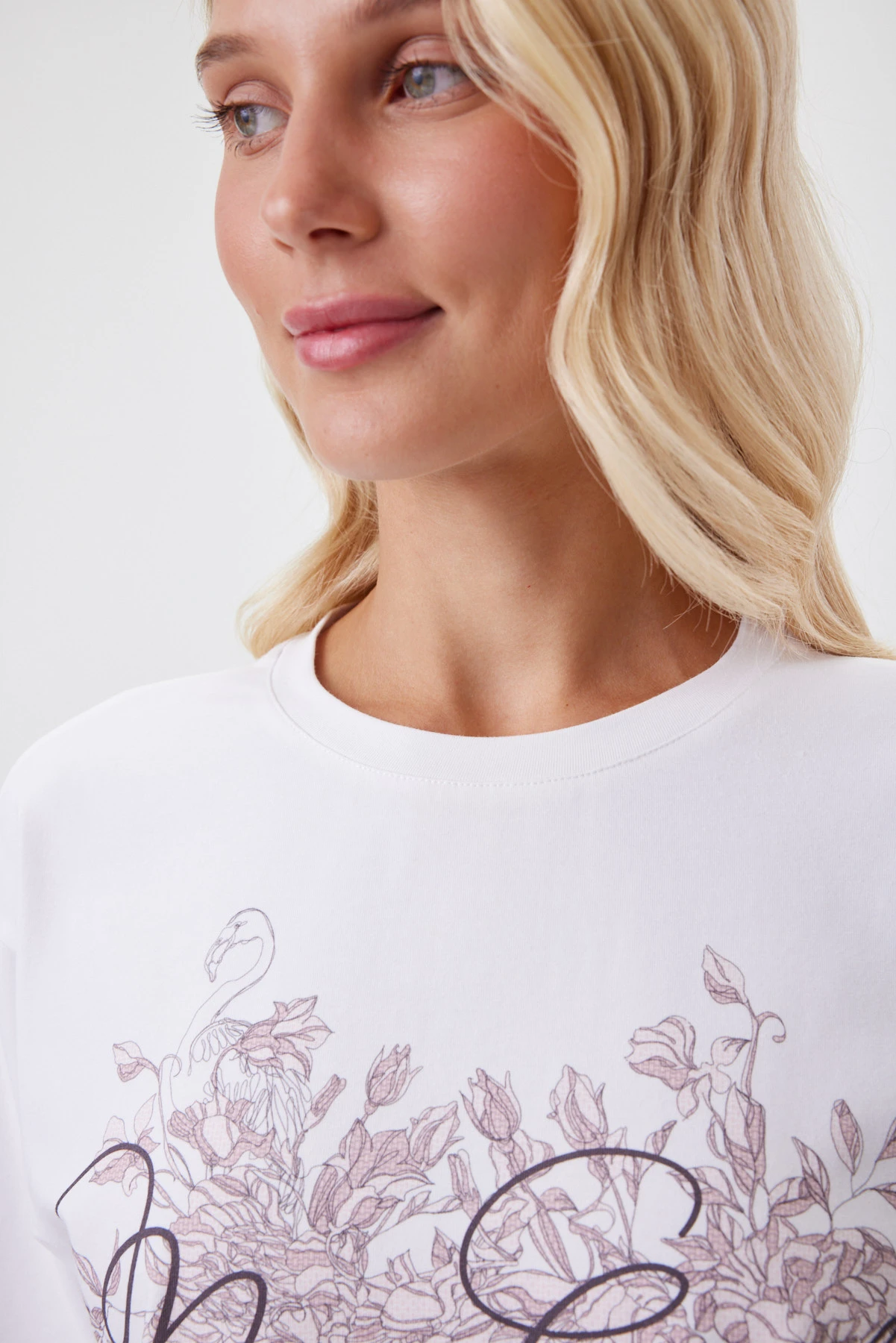 Футболка выполнена из трикотажа Пенье — премиального хлопка тонкой вязки: гладкого, мягкого и воздухопроницаемого. Волокно не пушится и не пиллингуется даже после множества стирок. Эластан в составе даёт комфортную посадку без потери формы — качество чувствуется с первого прикосновения. Авторский принт Rose Garden с флористическим орнаментом и фламинго отрисован в приглушённых тонах, с тончайшими линиями и полупрозрачным эффектом. Прямой расслабленный крой балансирует между классикой и oversize, рукав до локтя делает образ современным — тихая роскошь для тех, кто выбирает качество и вкус.