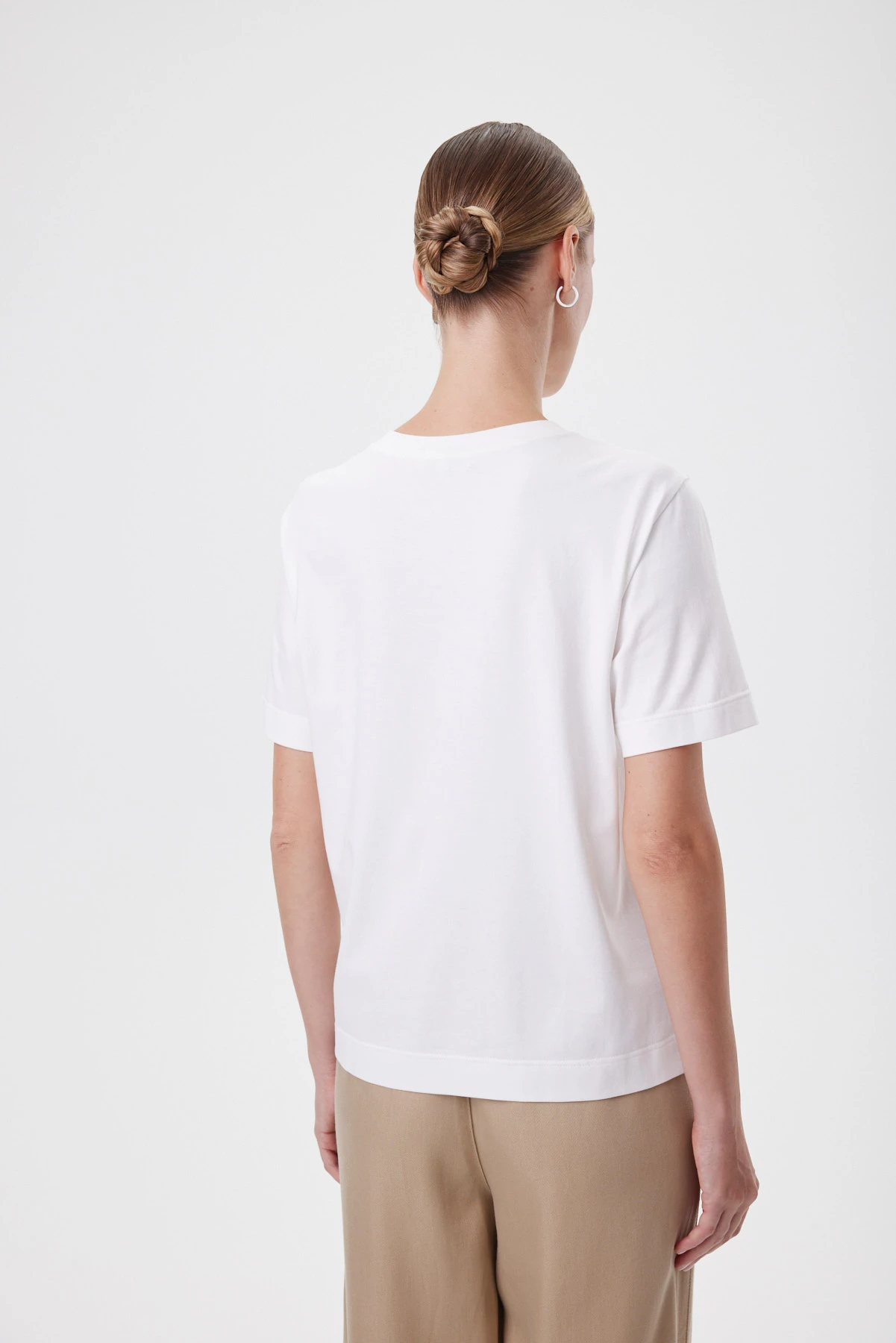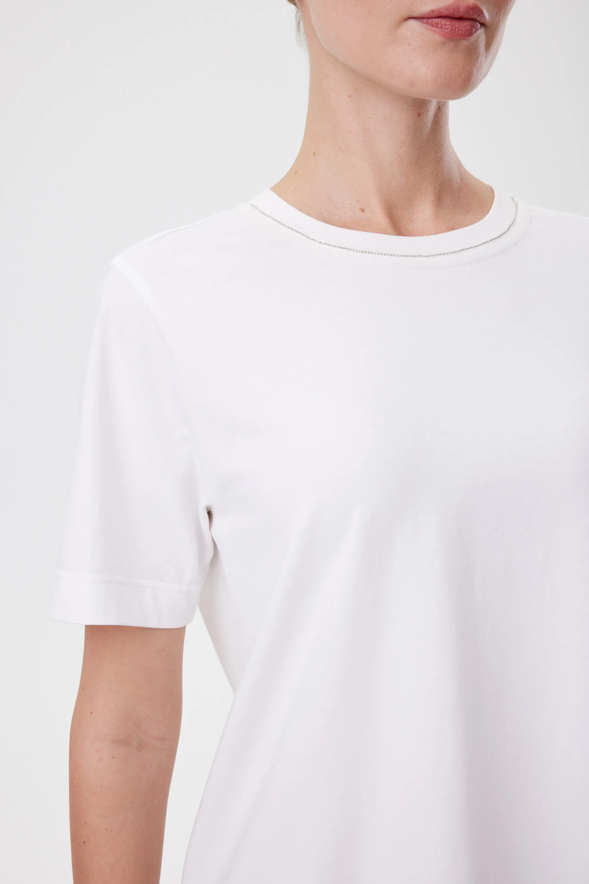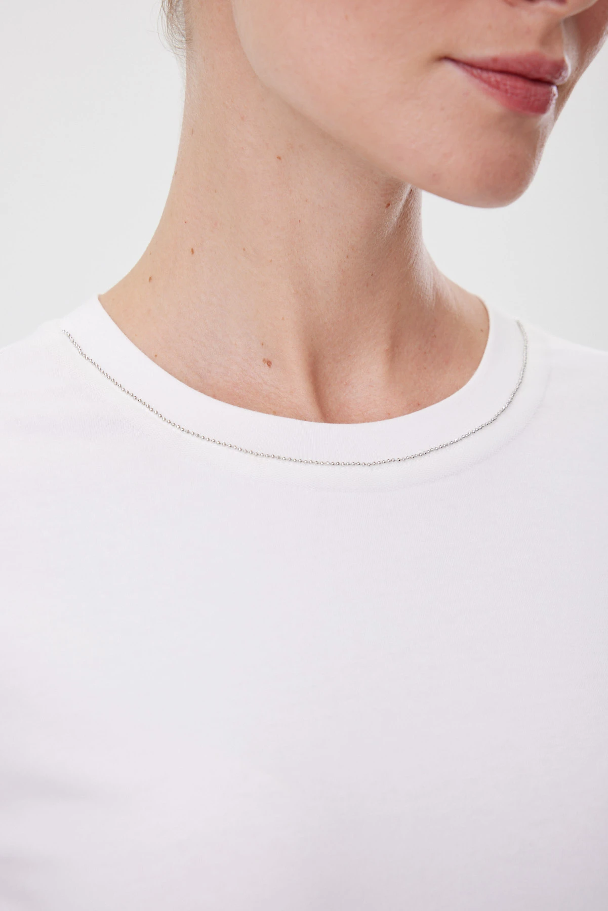 Молочная футболка в эстетике «тихой роскоши» создана в эстетике чистой геометрии. Мягкий оттенок изделия освежает и легко вписывается в любой гардероб. Свободный, но контролируемый крой выравнивает вертикали, не обтягивает и не добавляет объёма — посадка выглядит гармонично и современно. Хлопок Пенье с добавлением лайкры остаётся мягким, воздухопроницаемым и держит форму без жёсткости. Разрезы по бокам продуманы для носки навыпуск. Акцент модели — мониль по горловине, нашитая по сетке и выложенная с ювелирной точностью: серебристо-никелевый блеск напоминает тонкую цепочку и создаёт деликатное сияние вокруг лица.