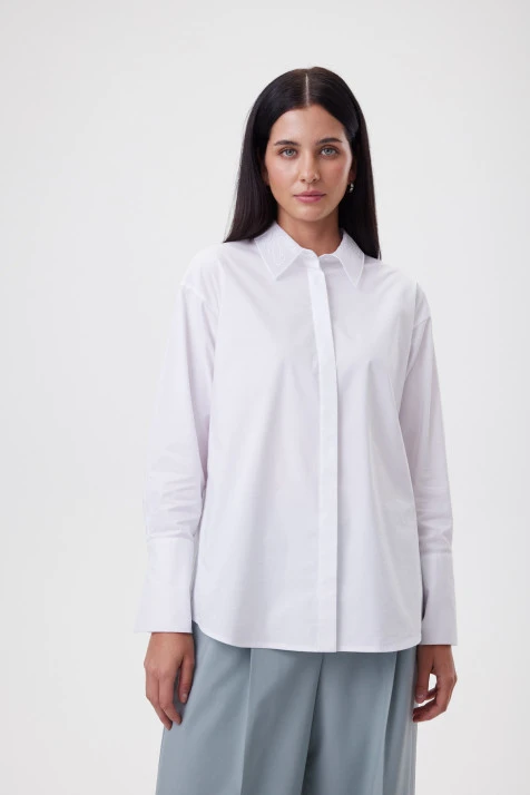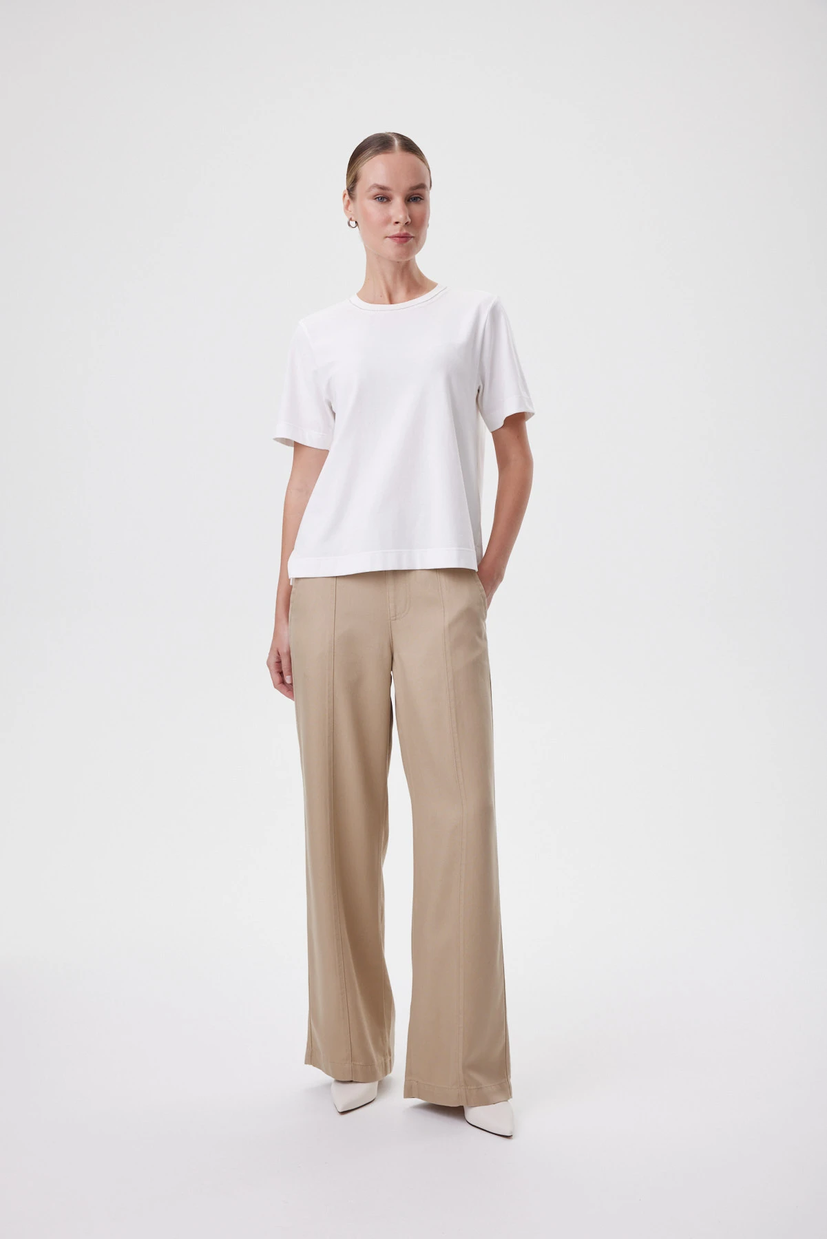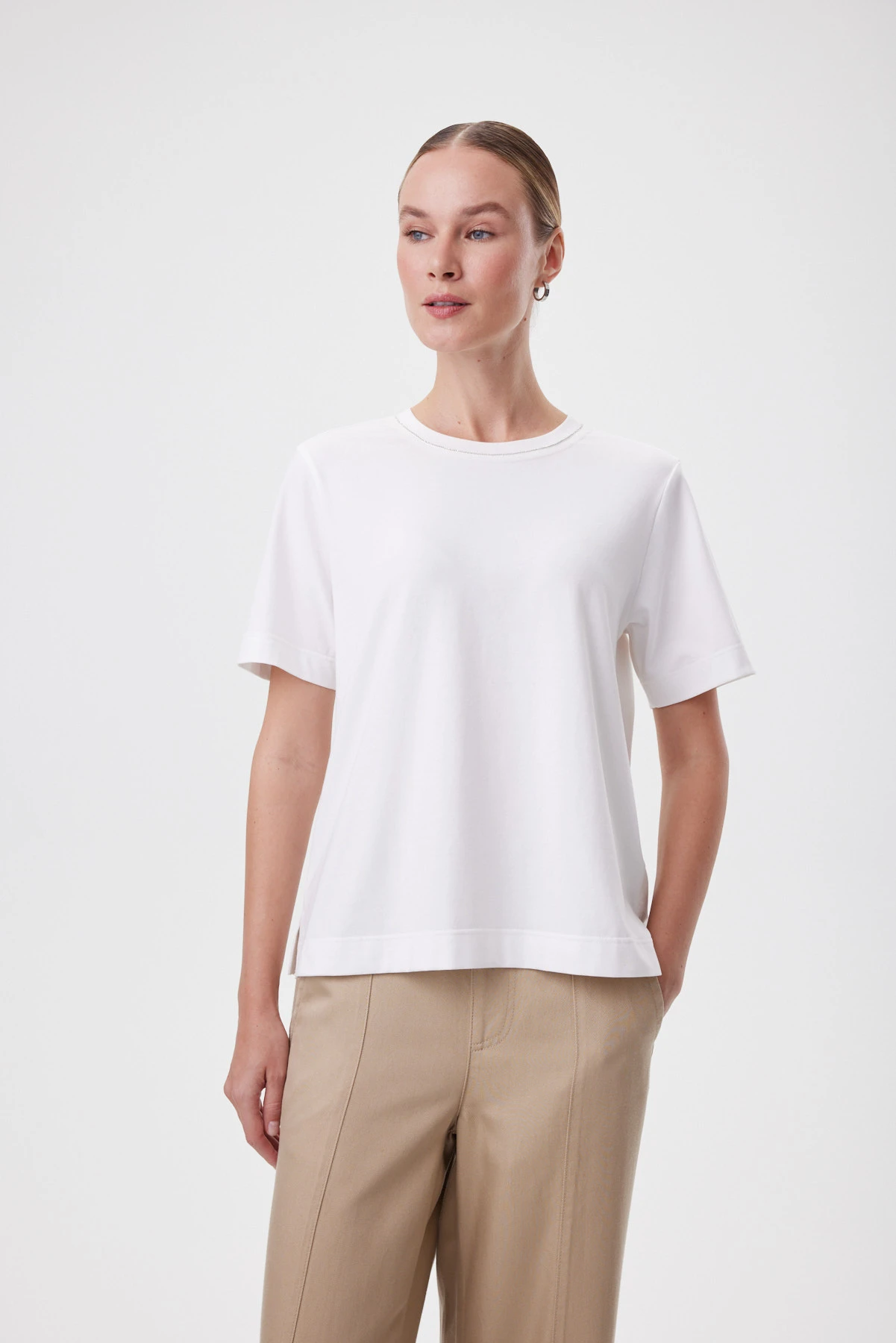 Молочная футболка в эстетике «тихой роскоши» создана в эстетике чистой геометрии. Мягкий оттенок изделия освежает и легко вписывается в любой гардероб. Свободный, но контролируемый крой выравнивает вертикали, не обтягивает и не добавляет объёма — посадка выглядит гармонично и современно. Хлопок Пенье с добавлением лайкры остаётся мягким, воздухопроницаемым и держит форму без жёсткости. Разрезы по бокам продуманы для носки навыпуск. Акцент модели — мониль по горловине, нашитая по сетке и выложенная с ювелирной точностью: серебристо-никелевый блеск напоминает тонкую цепочку и создаёт деликатное сияние вокруг лица.