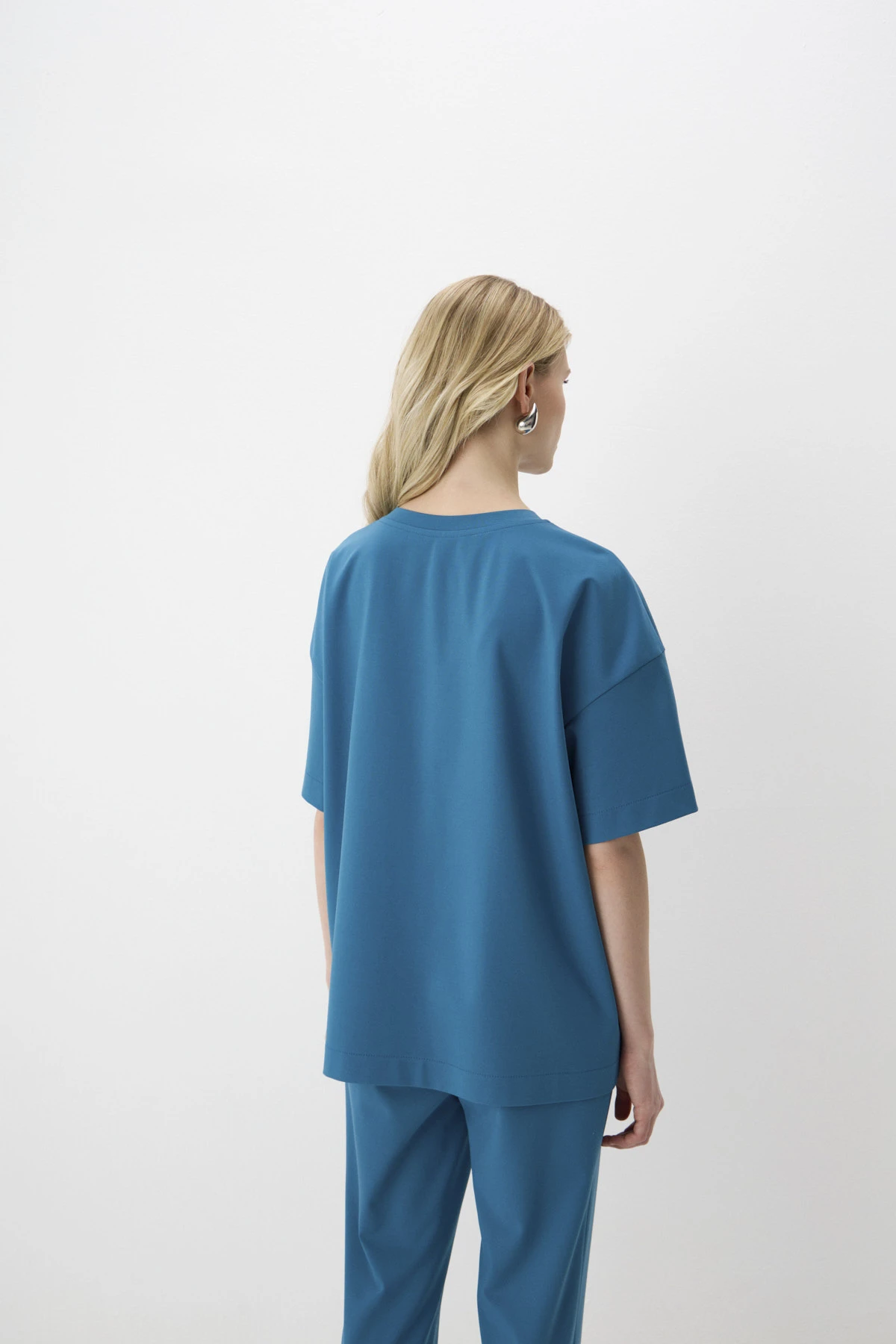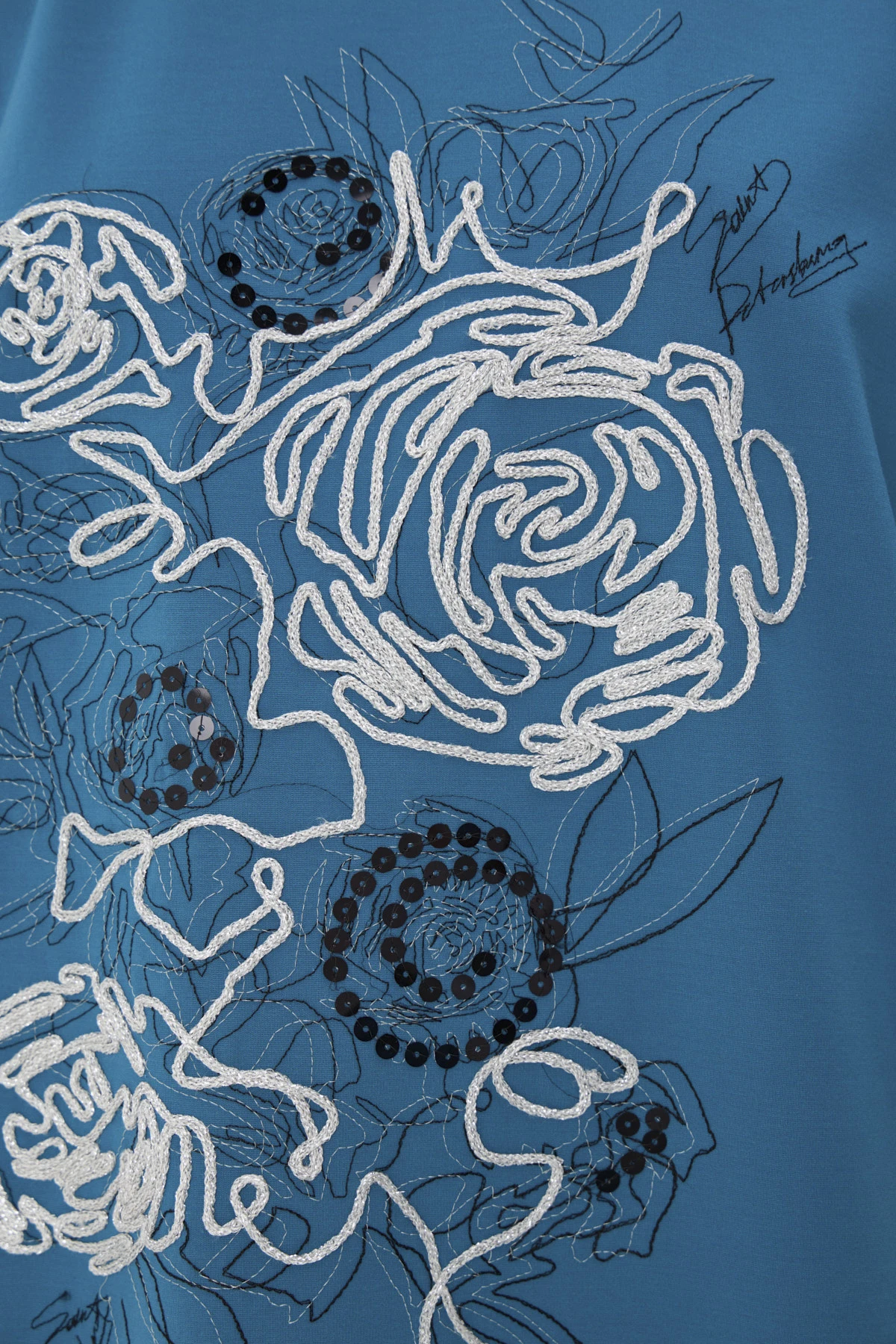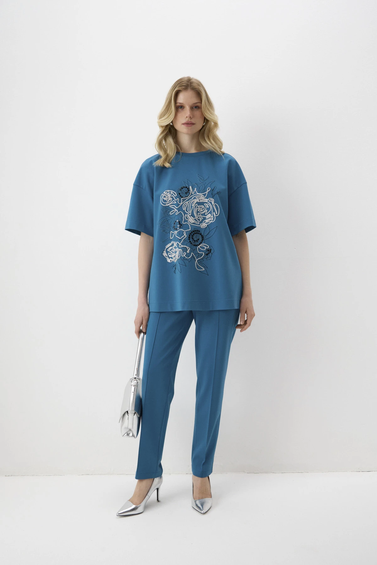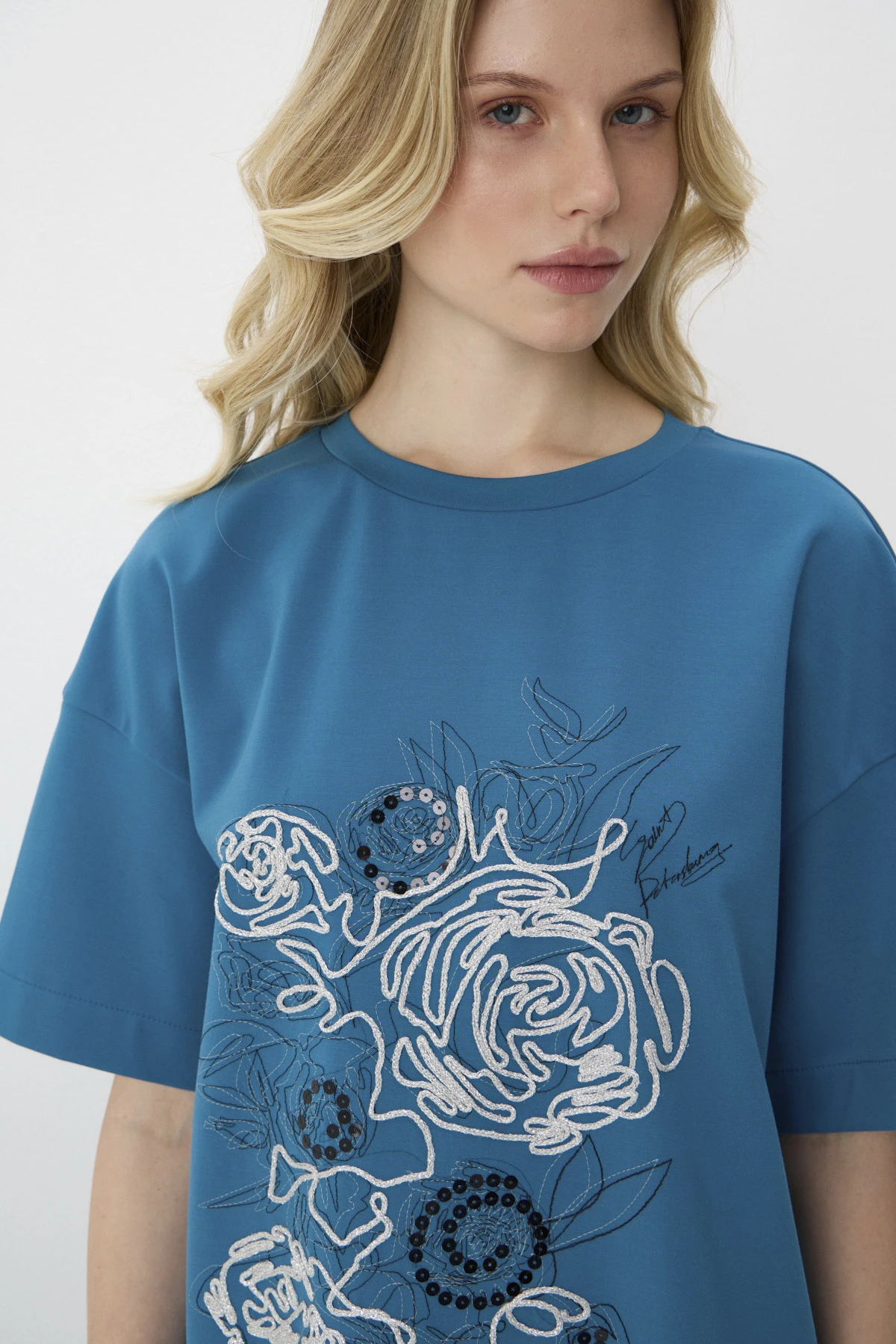 Футболка свободного кроя из смесовой ткани с добавлением гигроскопичных вискозы и модала в оттенке морской волны. Спущенная линия плеча добавляет расслабленности образу. По переду – роскошная вышивка контрастной нитью, изображающая цветы.