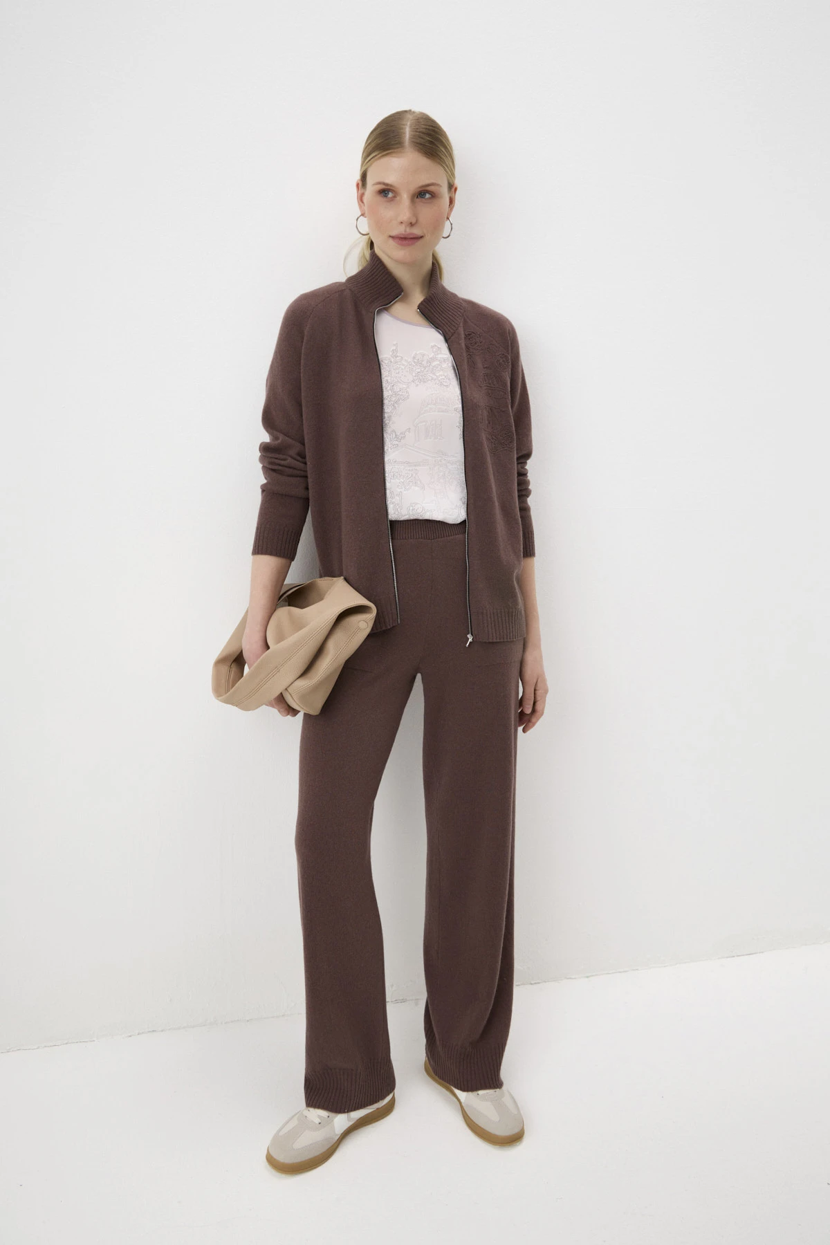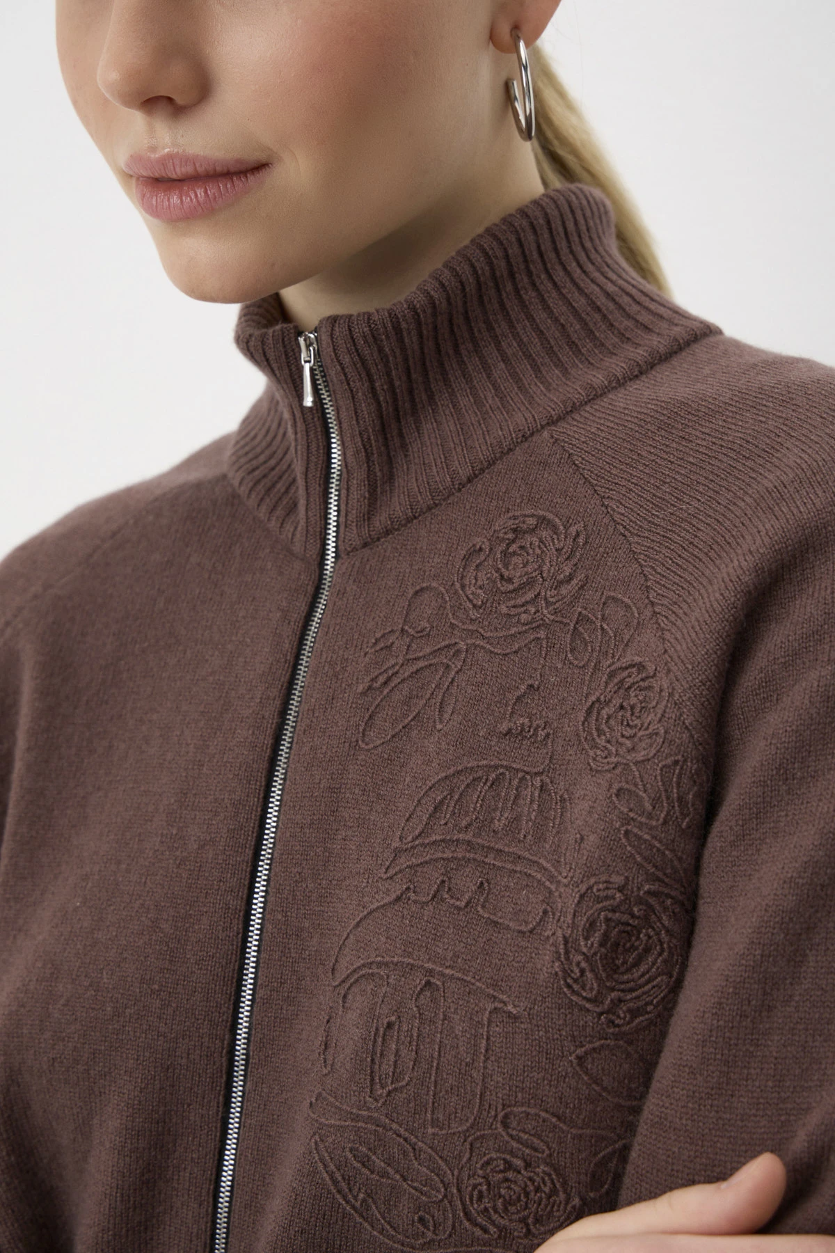 Кардиган на молнии из вязаного трикотажа восхитительного состава – тёплая шерсть, комфортная вискоза и мягкий кашемир с небольшим добавлением нейлона для практичности. Рукава реглан полной длины на манжетах. По переду – авторская объёмная вышивка шерстяной нитью, изображающая контуры Казанского собора и розы. Воротник-стойка, манжеты и низ кардигана оформлены монохромной трикотажной бейкой в «рубчик». Застёжка на молнию из белого металла.