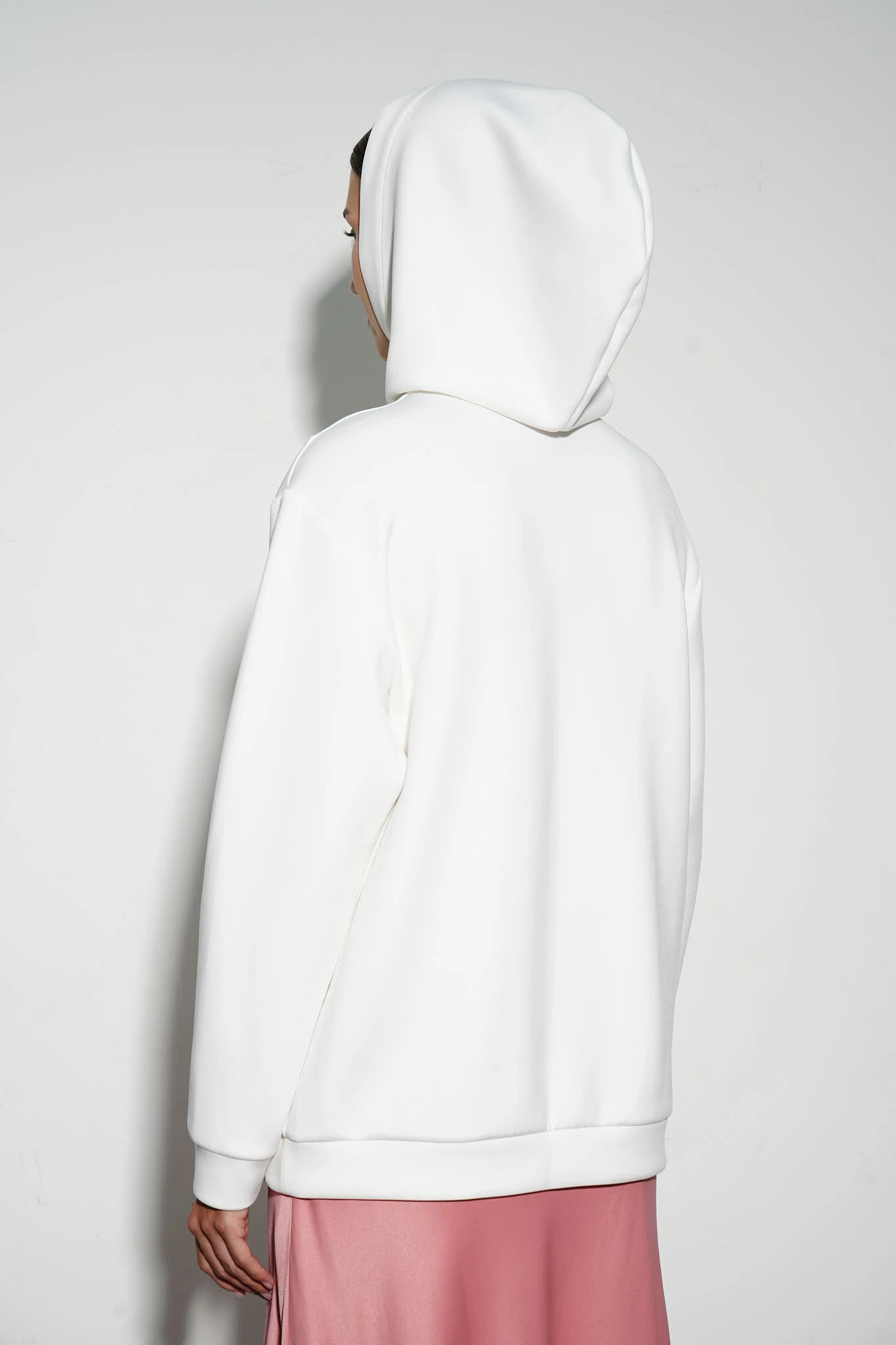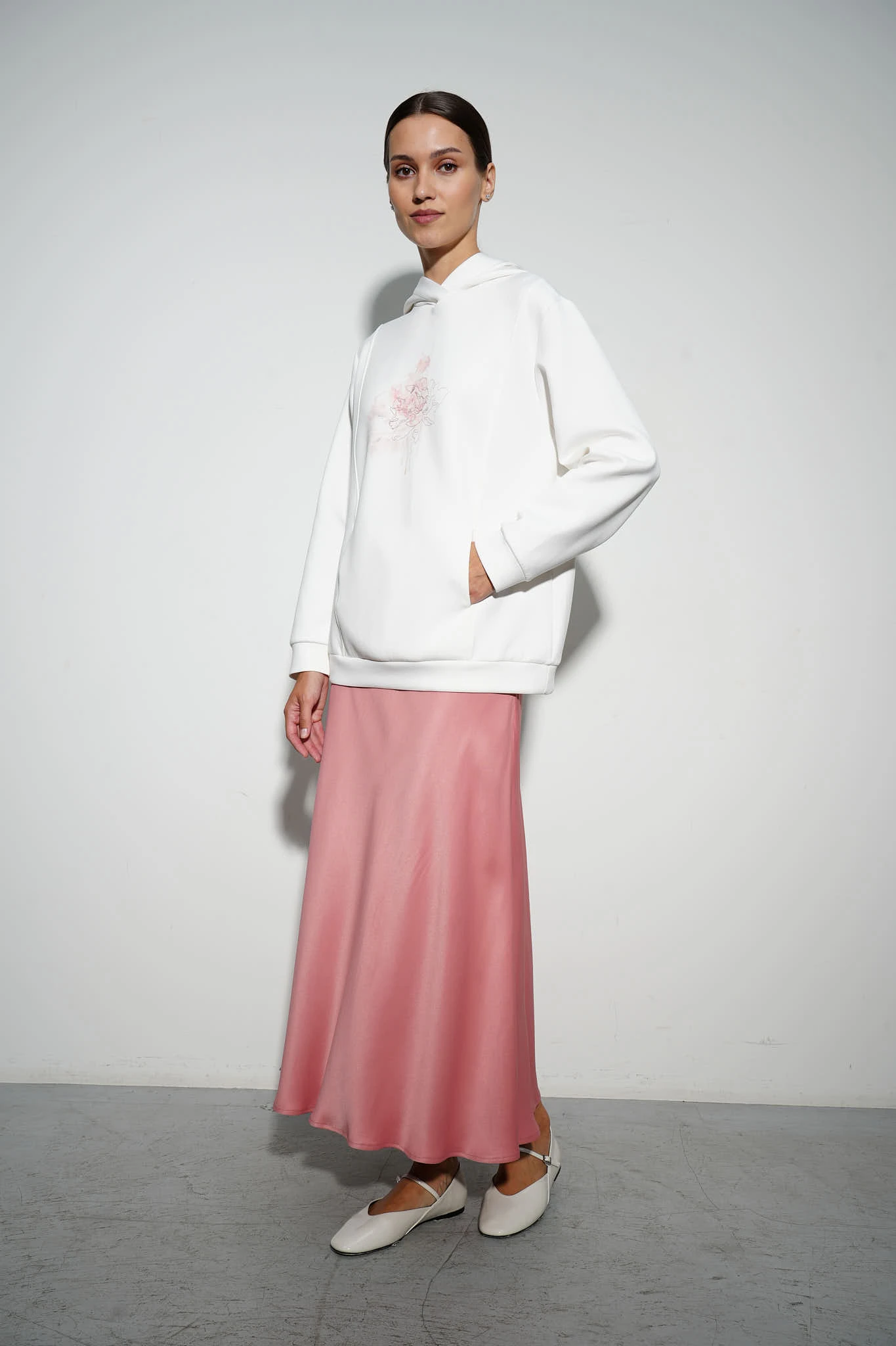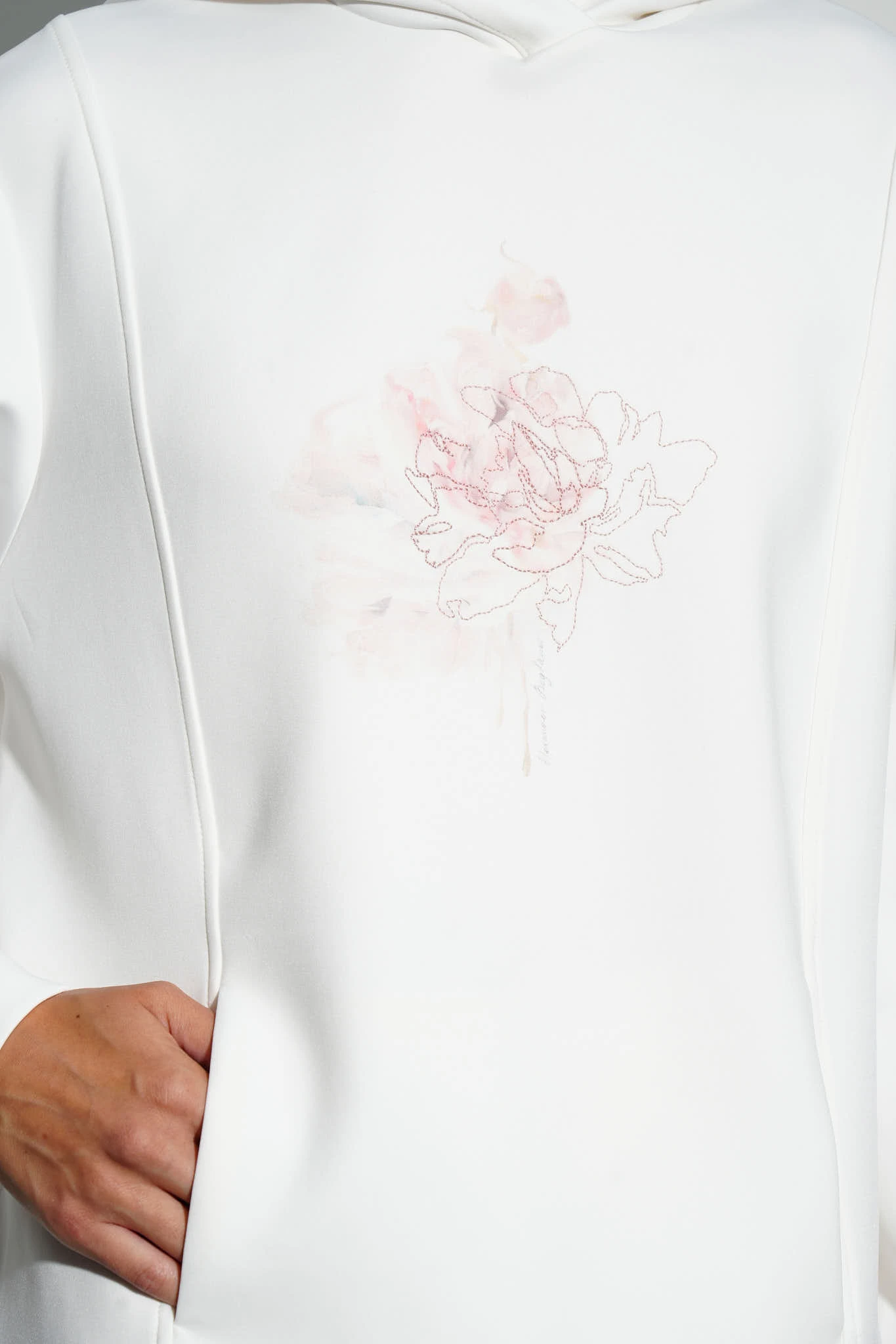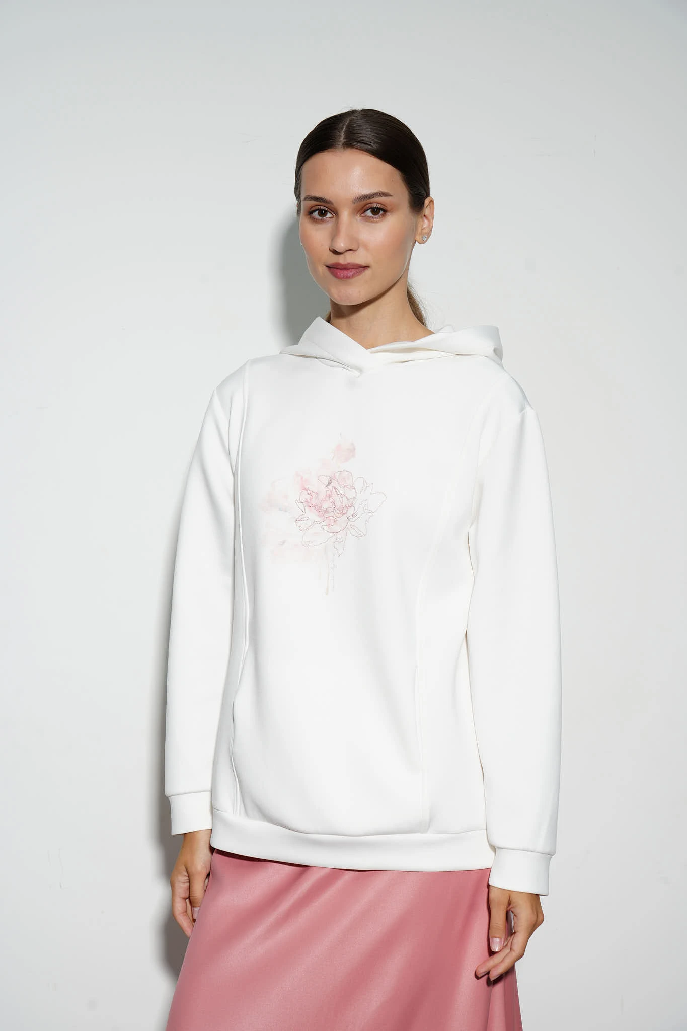 Худи свободного силуэта выполнено из плотного трикотажа, изнаночная сторона которого – тактильно приятная вискоза, а лицевая – практичный полиэстер. По переду акварельный принт «Магия пробуждения» в нежных рассветных тонах дополнен изящной вышивкой пиона, символизирующего обновление и весеннюю лёгкость. По переду – отстроченные рельефы, композиционно обрамляющие акварельный принт. Капюшон, спущенная линия плеча и карман-«кенгуру» придают модели расслабленный характер. Худи в стиле спорт-шик - гармония удобства, женственности и актуального минимализма.