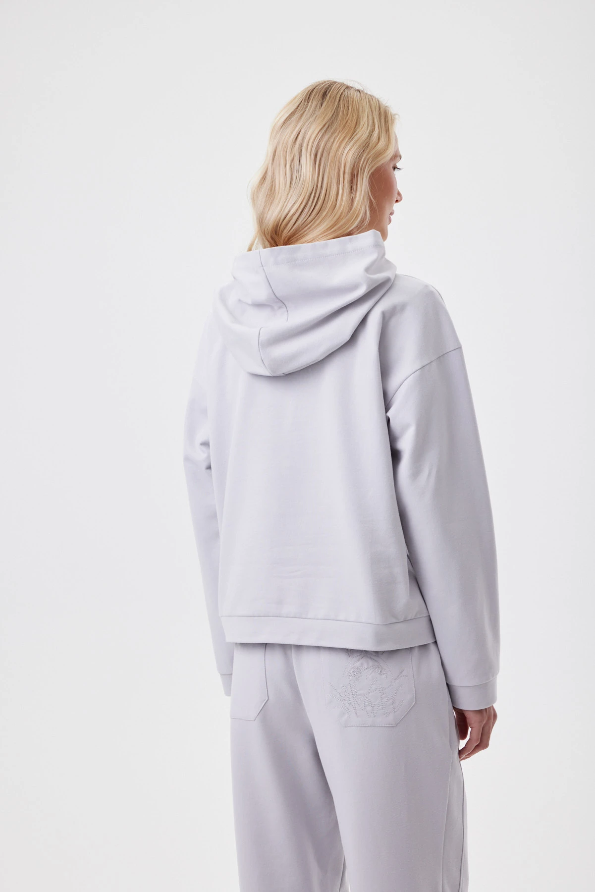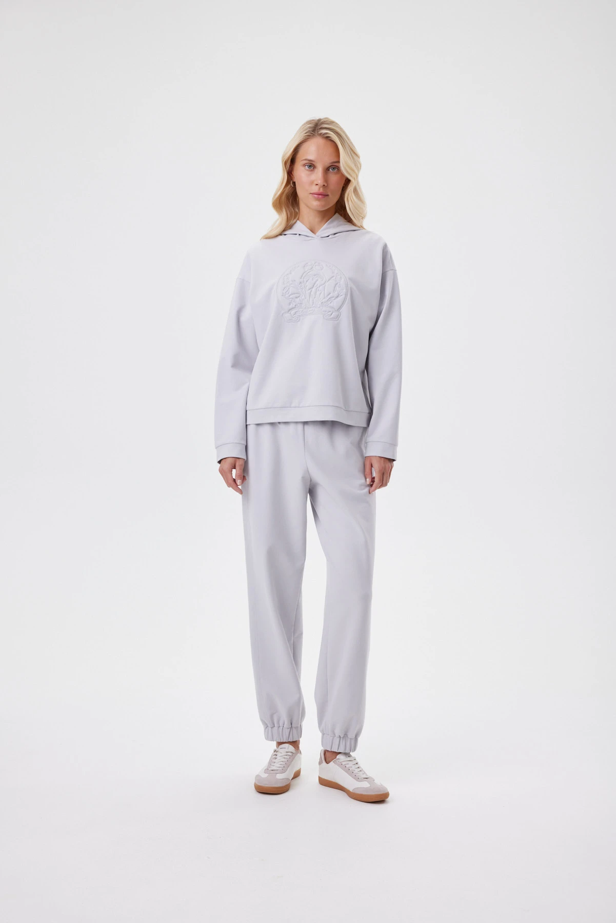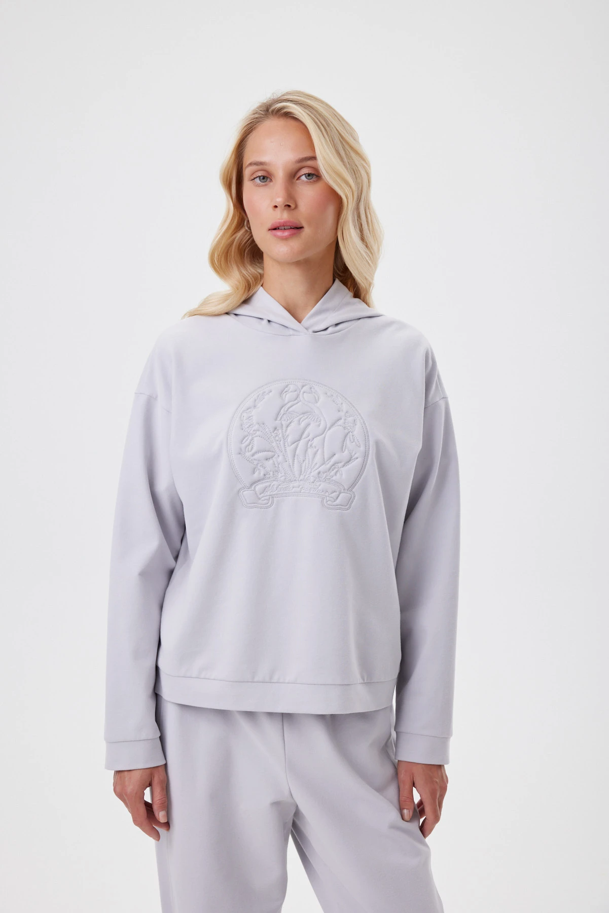 Худи выполнено из премиального хлопкового футера: плотного, но воздухопроницаемого, с бархатистым матовым финишем. Благодаря эластану ткань держит форму, мягко обтекает силуэт и остаётся комфортной как «вторая кожа» — комфортно, легко и без деформации после стирок. Монохромная вышивка-эмблема с едва заметным металлическим отблеском выполнена на объёмной подложке — рисунок ощущается тактильно, как изящный рельеф. Мягкий капюшон с захлёстом без кулиски и рукав со спущенным плечом дают расслабленную, универсальную посадку.