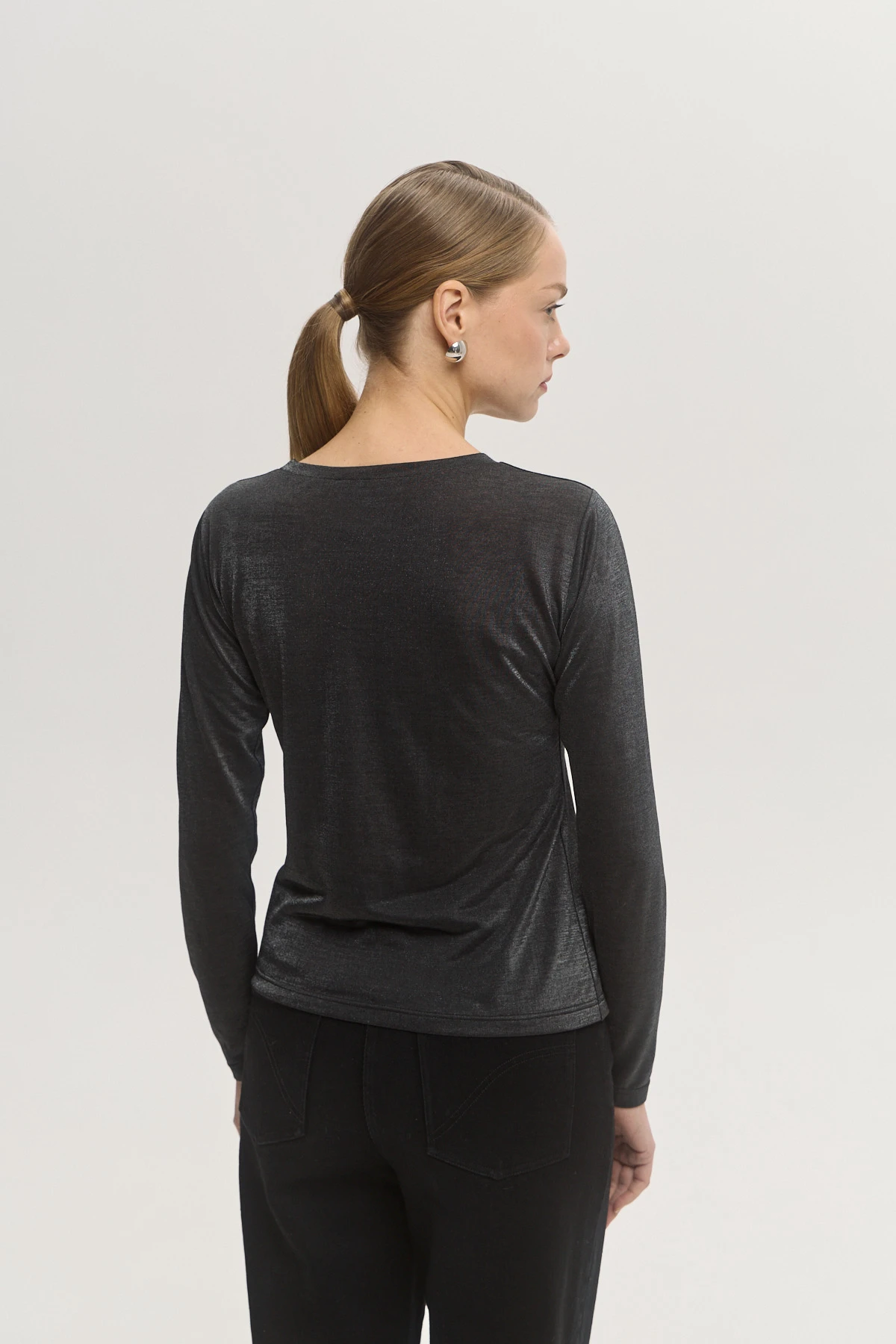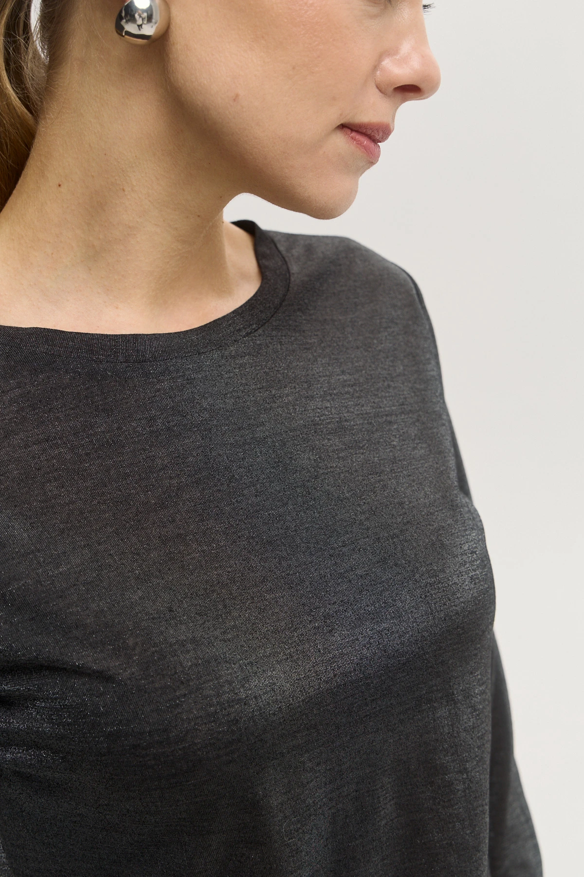 Лаконичный прямой силуэт лонгслива легко вписывается в базовый гардероб и хорошо комбинируется с жакетами, жилетами и брюками. Гладкое полотно ткани с лёгким мерцанием придаёт образу игру бликов и делает модель уместной не только в повседневной, но и в вечерней стилистике. Вискоза в составе — приятна к телу, гигроскопична и обеспечивает комфорт в течение всего дня. Нейтральный графитовый оттенок легко сочетается с базовыми и акцентными цветами гардероба.