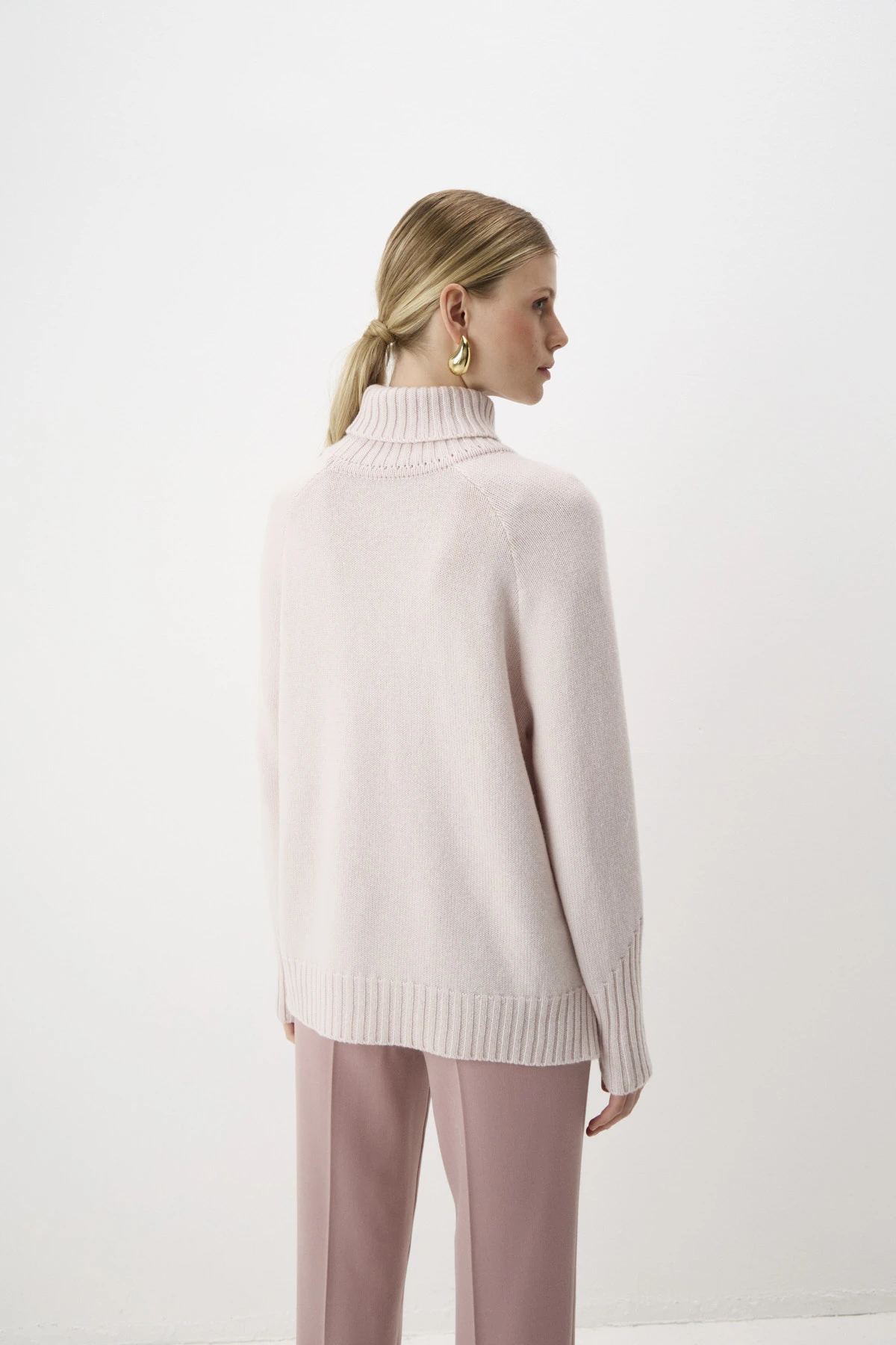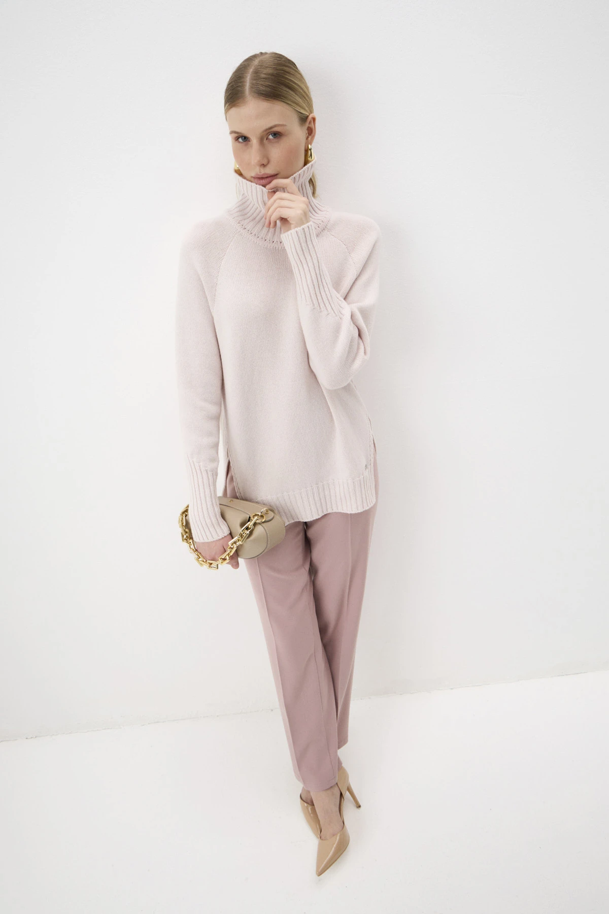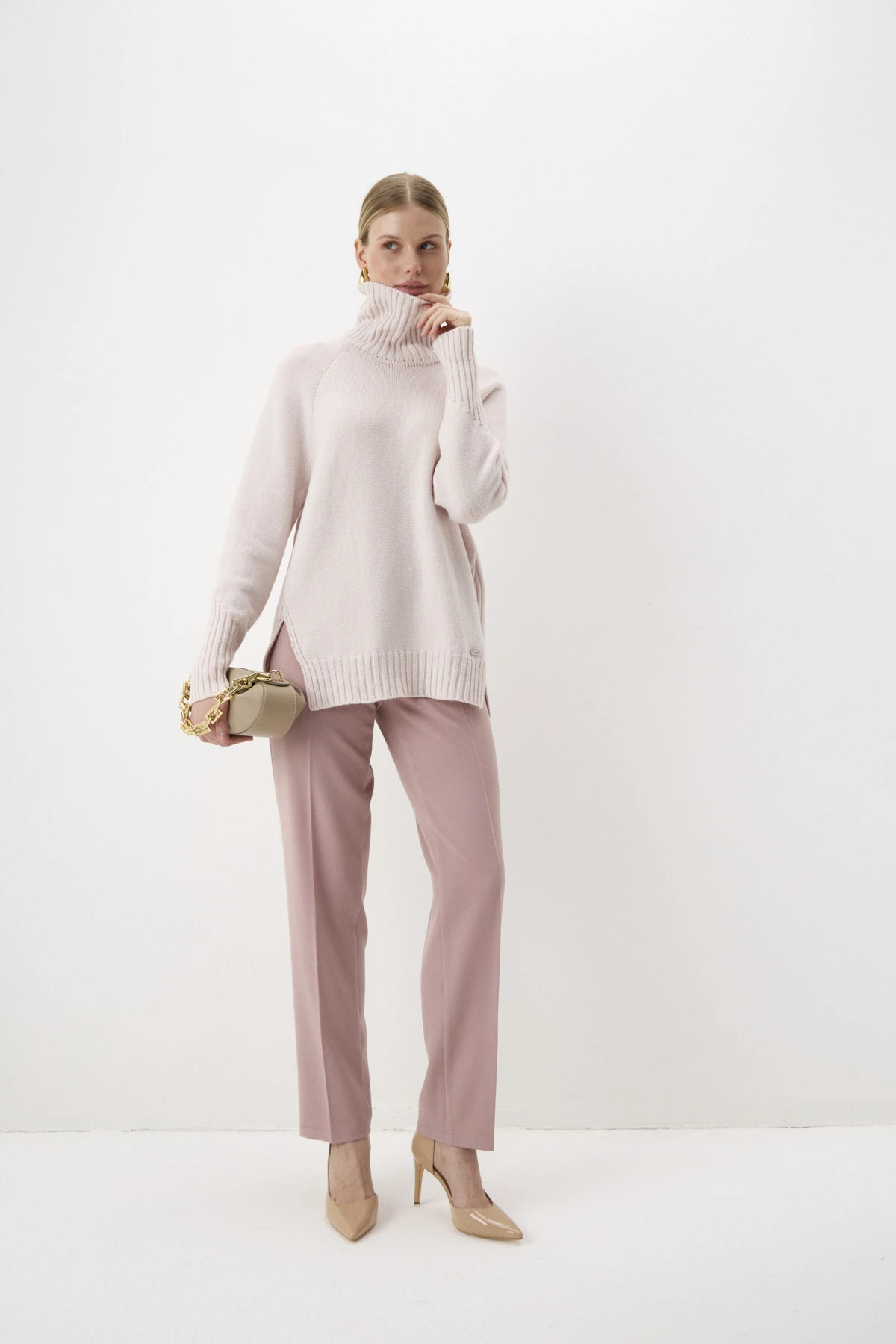 Свитер свободного кроя с высоким воротником-стойкой – уютная модель, которая согреет Вас в непогоду. Модель выполнена в пудровом оттенке из пряжи восхитительного состава, сочетающей тёплую шерсть, комфортную вискозу и премиальный кашемир. В боковых швах – разрезы. Воротник-стойка, низ рукавов-реглан и свитера оформлены вязкой в «рубчик». По переду – брендированная фурнитура из белого металла.