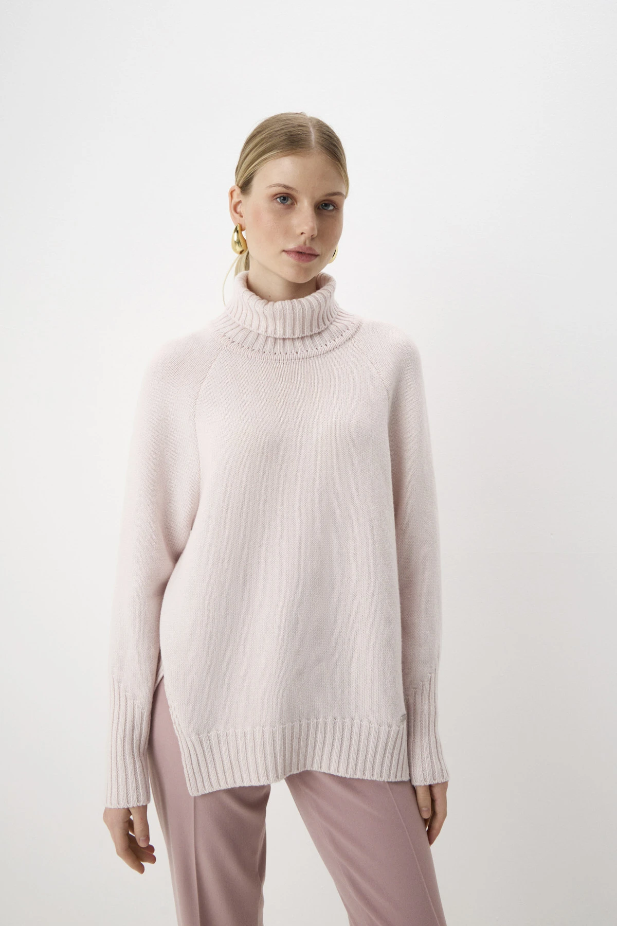 Свитер свободного кроя с высоким воротником-стойкой – уютная модель, которая согреет Вас в непогоду. Модель выполнена в пудровом оттенке из пряжи восхитительного состава, сочетающей тёплую шерсть, комфортную вискозу и премиальный кашемир. В боковых швах – разрезы. Воротник-стойка, низ рукавов-реглан и свитера оформлены вязкой в «рубчик». По переду – брендированная фурнитура из белого металла.